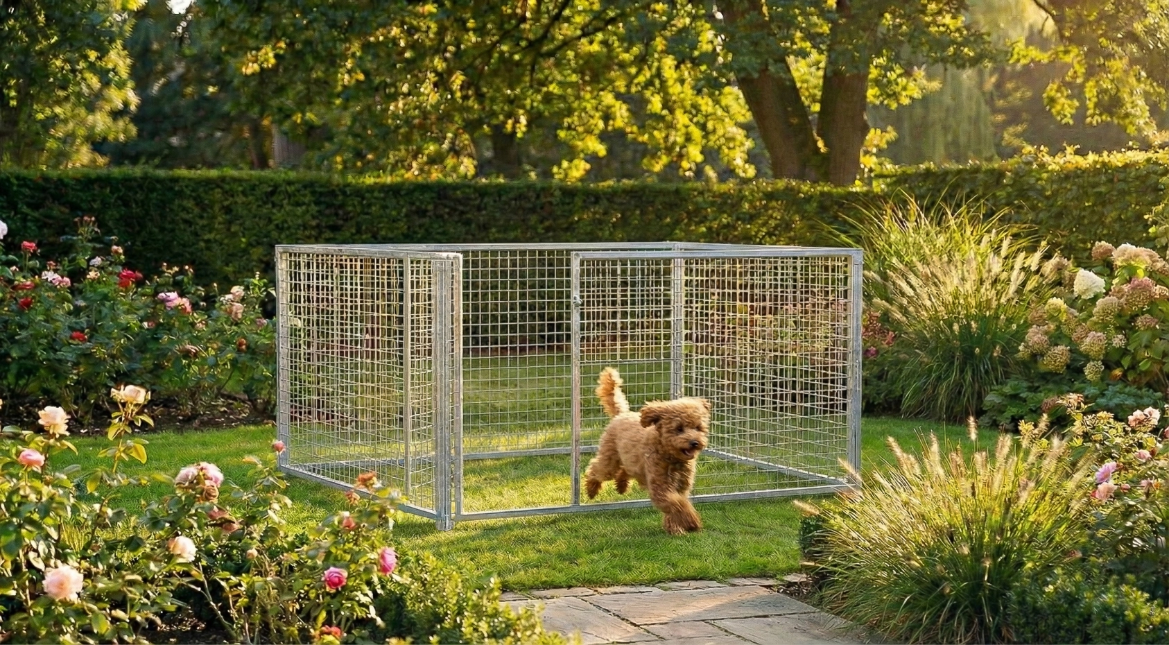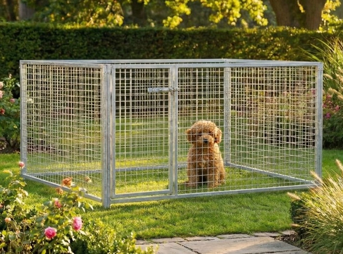 Deze stevige gegalvaniseerde puppykennel met draadpanelen van 2 x 1,5 meter is een prachtig buitenverblijf voor uw pup! De puppy kennel bestaat uit 2 kennel panelen van 1,5 meter en 2 kennelpanelen van 2 meter. Deze kennel is uit voorraad leverbaar...!