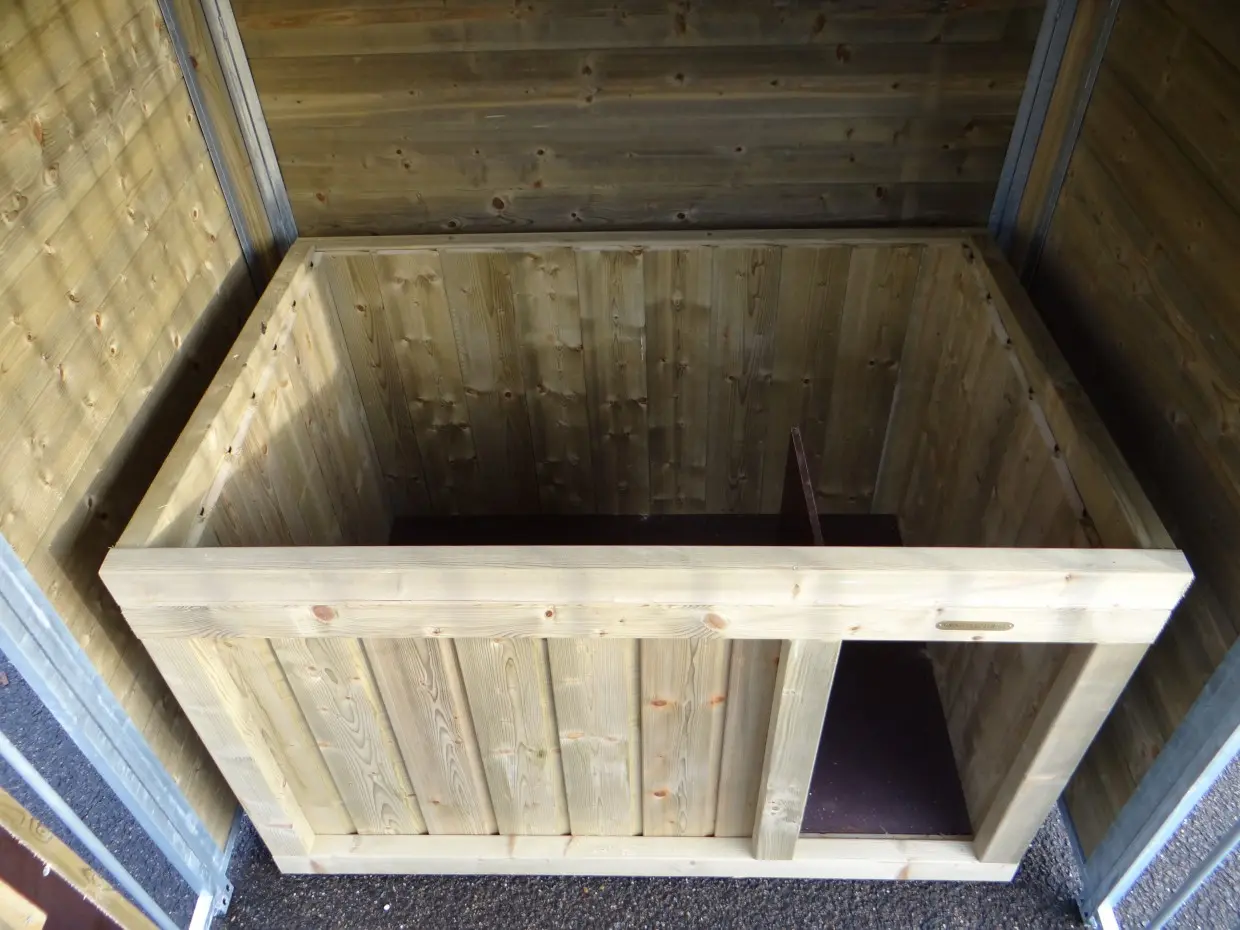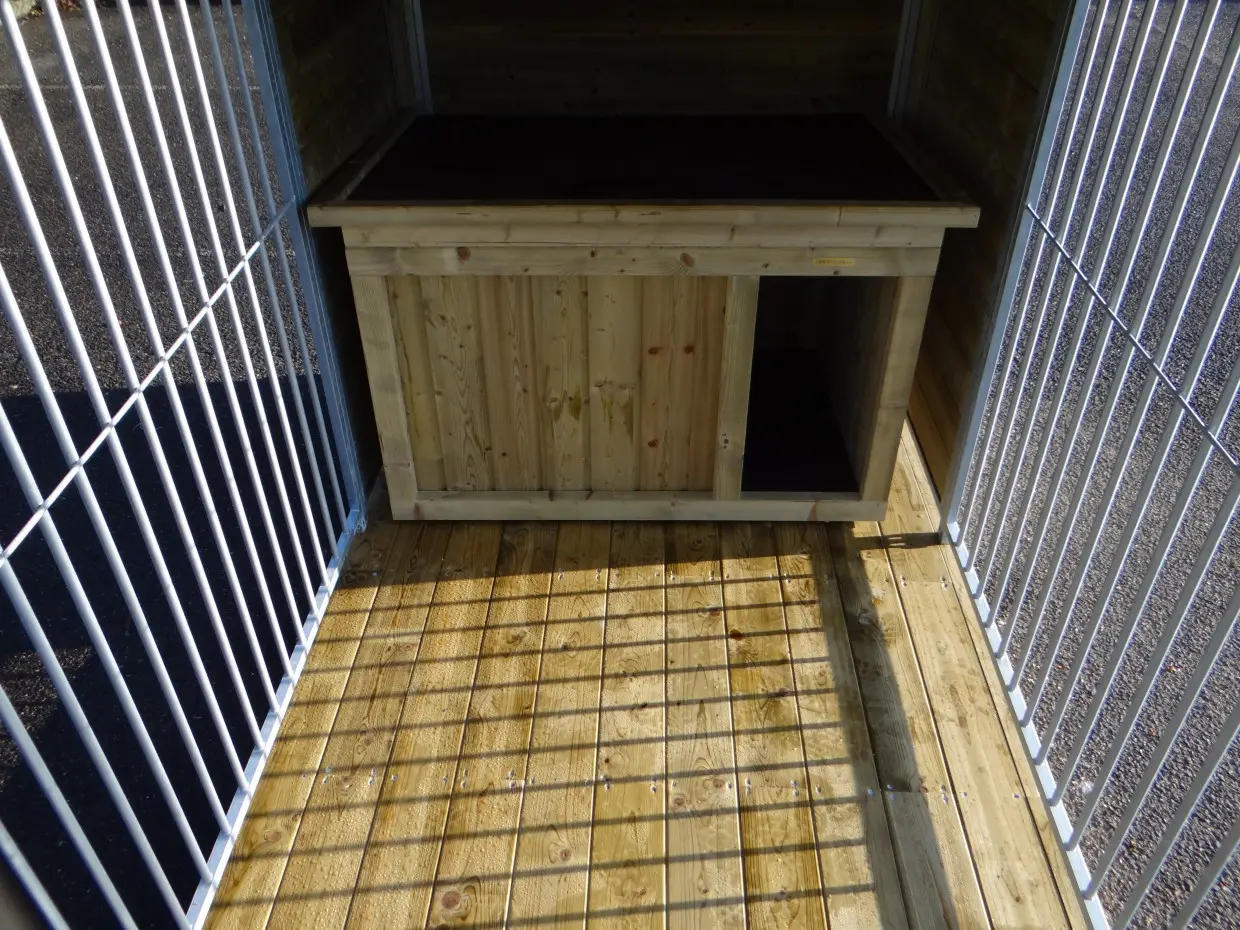 De kennel heeft een luxe houten, dragende vloer. Hierdoor staat de hondenkennel vlak en vrij van de grond. Door de planken vloer is deze eenvoudig schoon te maken en blijft er weinig vuil op liggen. De vloer heeft een totale hoogte van 12cm.