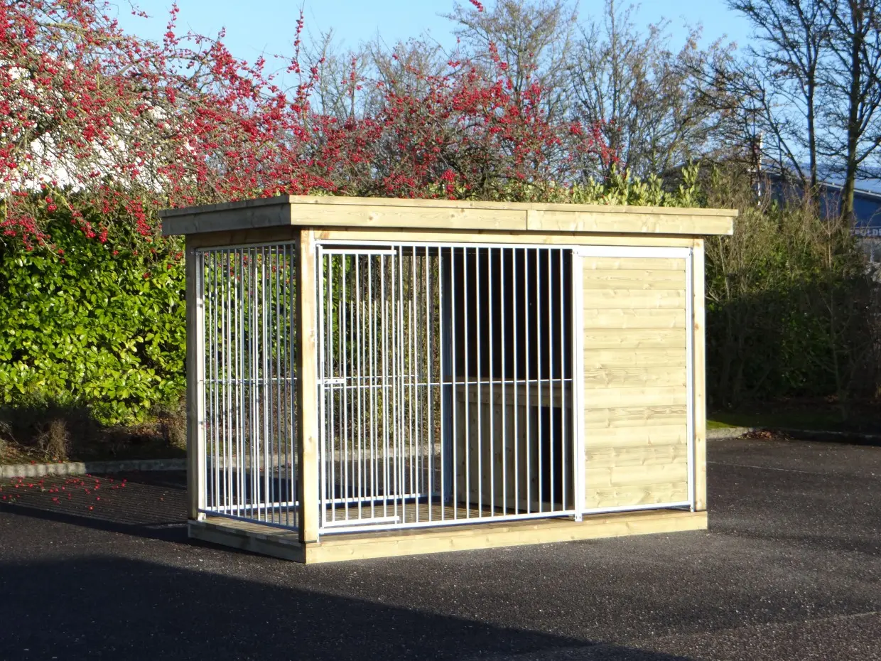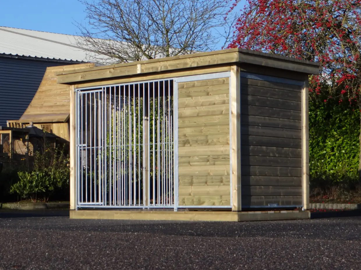 Door het prachtige, geïmpregneerd vurenhouten kader en het luxe dak krijgt de kennel een chique uitstraling.