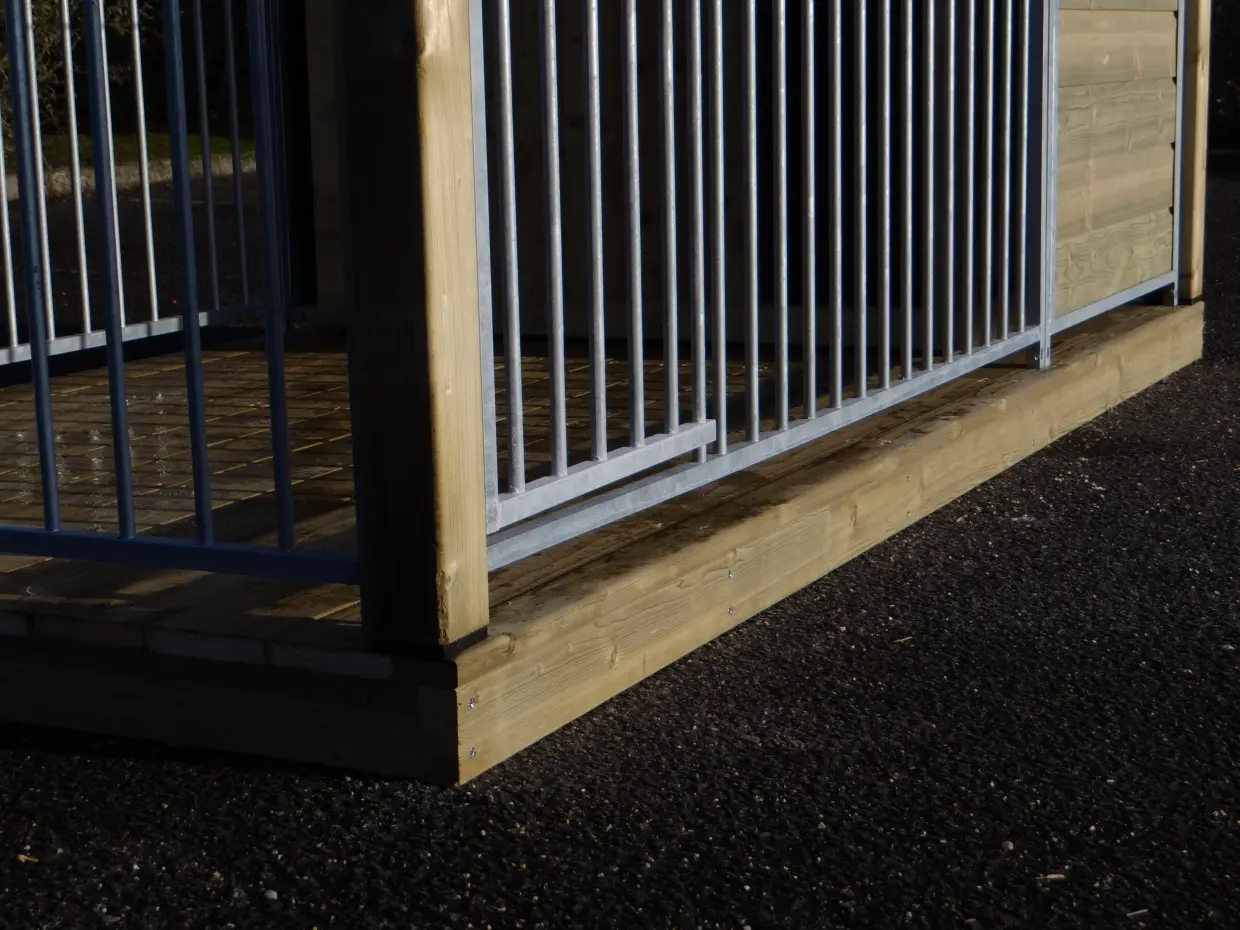 - De houten staanders van de kennel (88x88mm) zijn voorzien van kunststof voetjes