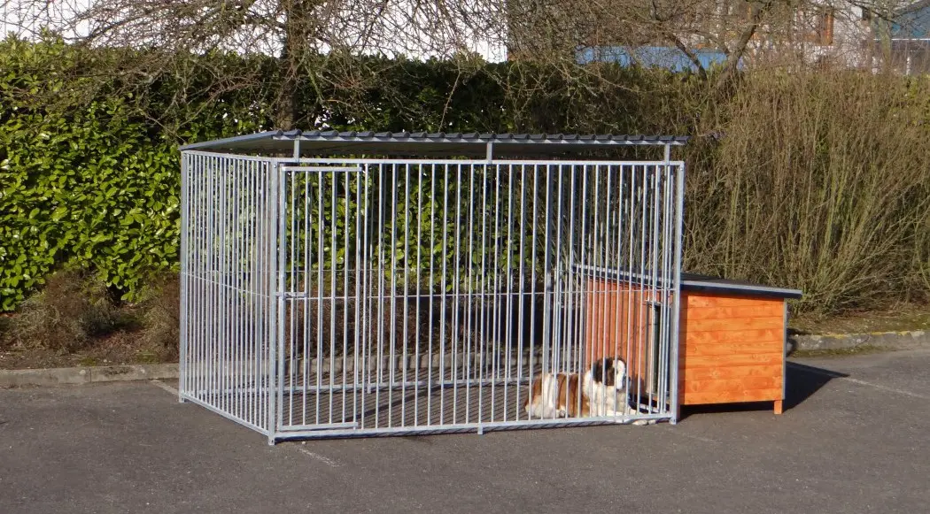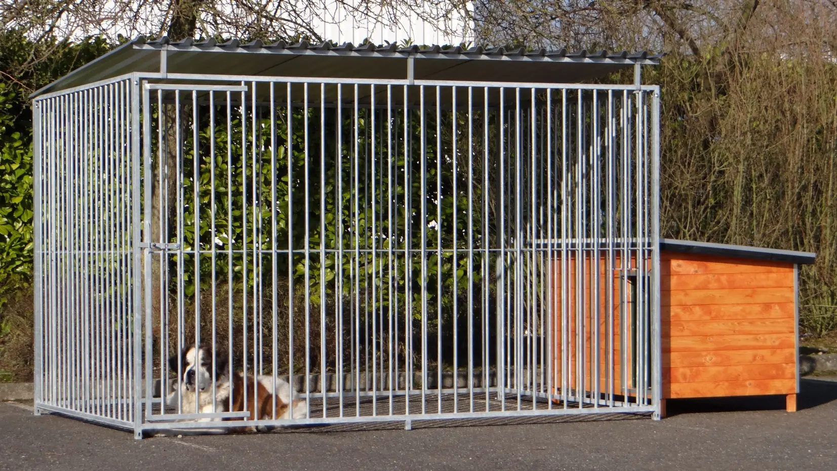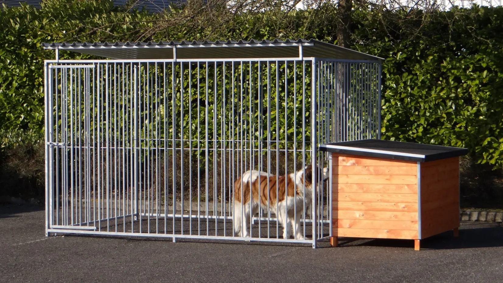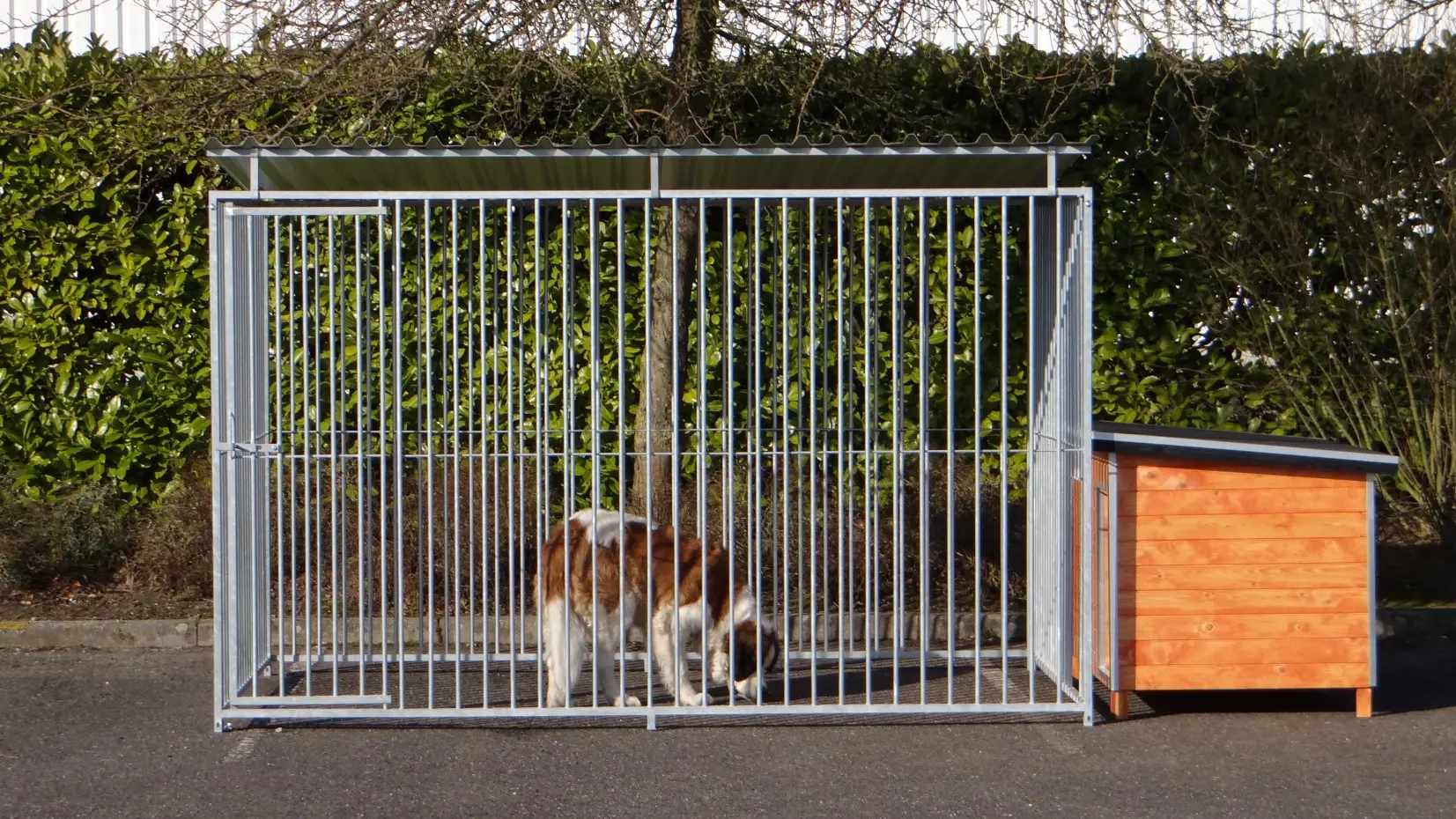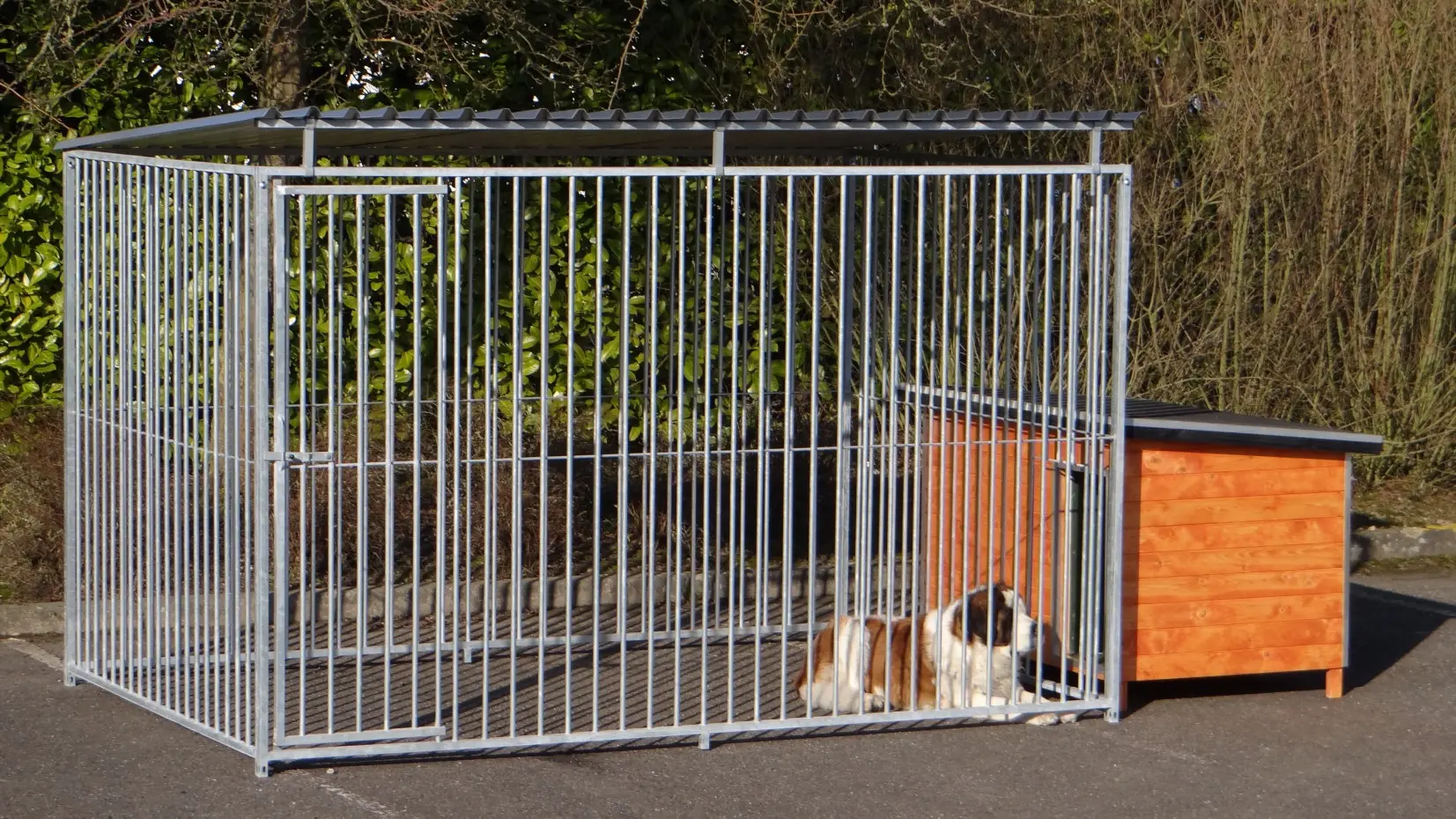 Zware, gegalvaniseerde hondenkennel met dak en een geïsoleerd nachthok Base Large. Omdat het nachthok buiten de ren staat, houdt u in de ren alle ruimte vrij voor uw hond(en). Het hondenhok is 159x107cm en staat ook los op onze website als: Geïsoleerd Hondenhok Base Large. Uiteraard is het nachthok ook groter of kleiner verkrijgbaar. De hondenkennel zelf heeft een afmeting van 300x205cm. Deze hondenkennel met nachthok, met een totale afmeting van ca. 407x200cm, vormt een compleet set voor uw hond. Het hele jaar door!