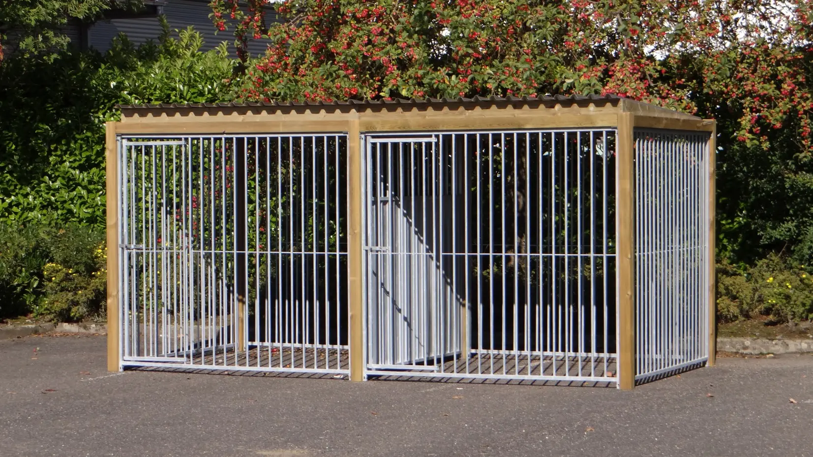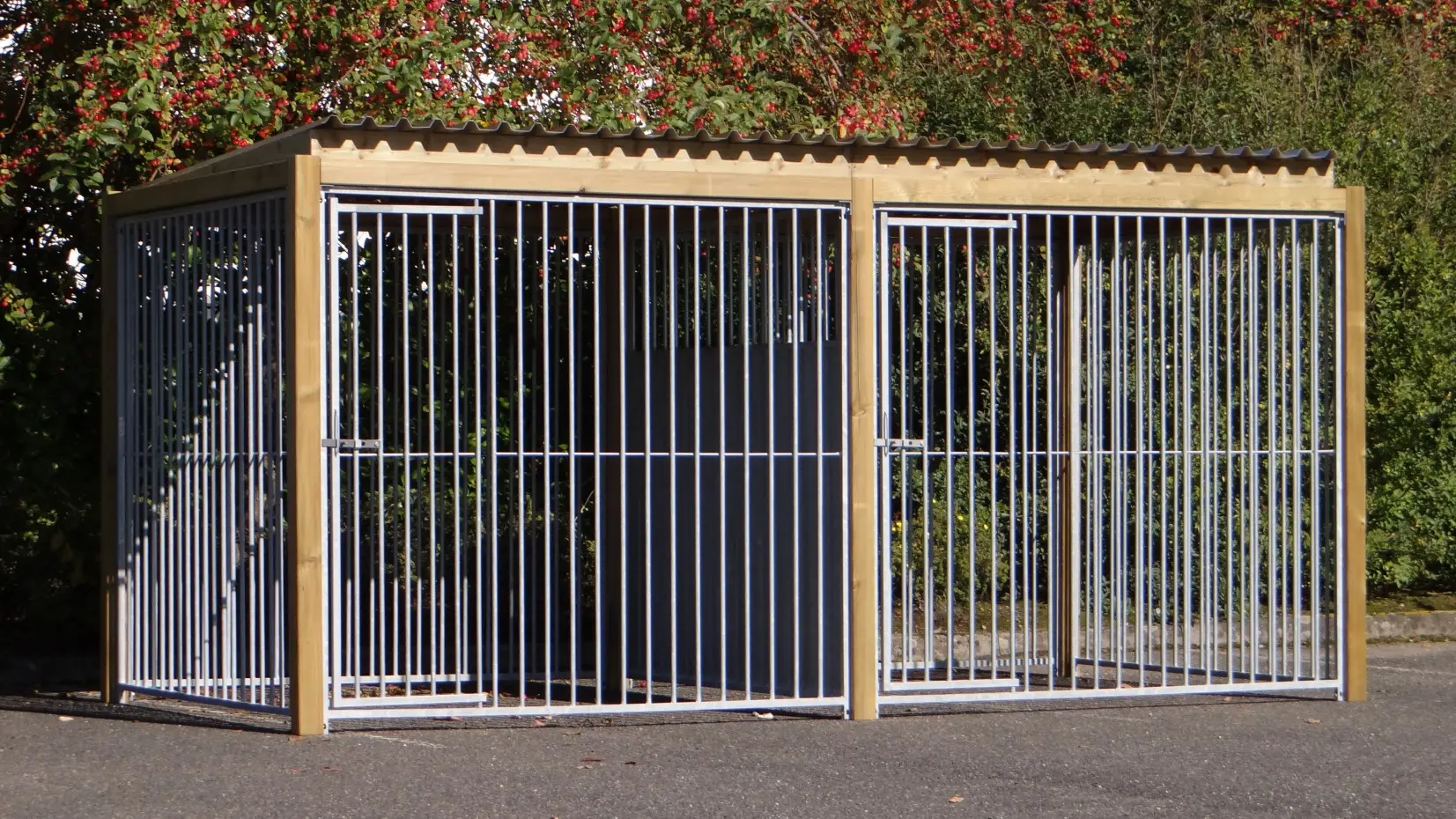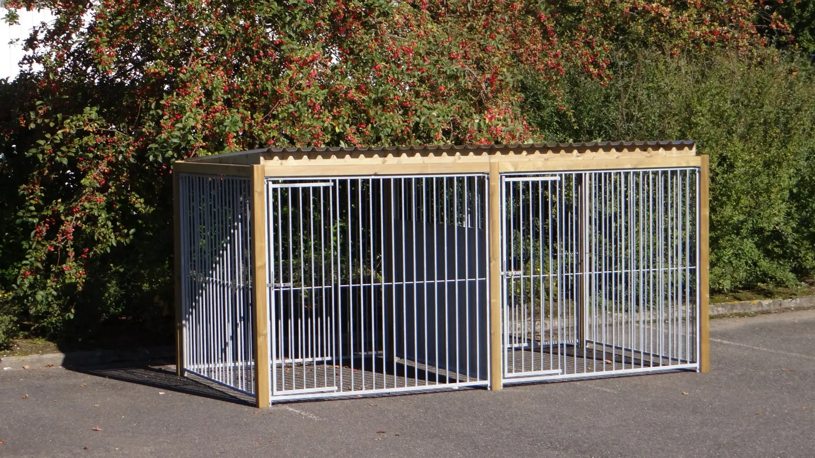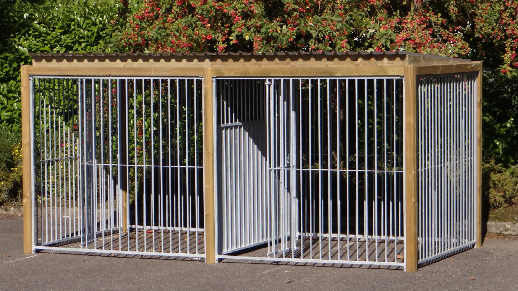 Dubbele kennel Flinq met houten kader is erg sterk en praktisch. Ook geeft het houten kader om de panelen een prachtige en robuuste uitstraling. De kennel heeft een afmeting van 427x218cm. Iedere ren heeft zo een afmeting van 4 vierkante meter. Hierdoor is de kennel erg geschikt om 2 honden apart te houden. U kunt er natuurlijk ook voor kiezen om deze rennen van een nachthok te voorzien. Het ijzerwerk is goed gegalvaniseerd tegen roestvormingen het dak is van aluminium met een geluiddempend profiel. De geïmpregneerde balken hebben een lange levensduur en behoeven geen verder onderhoud. Een duidelijke opbouw-beschrijving van de kennel wordt meegeleverd.