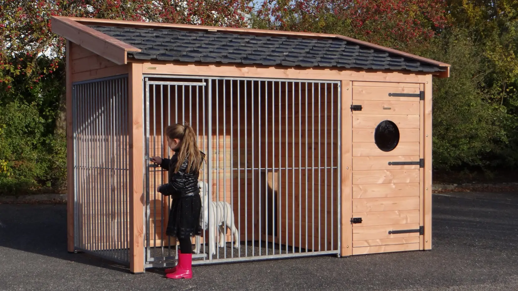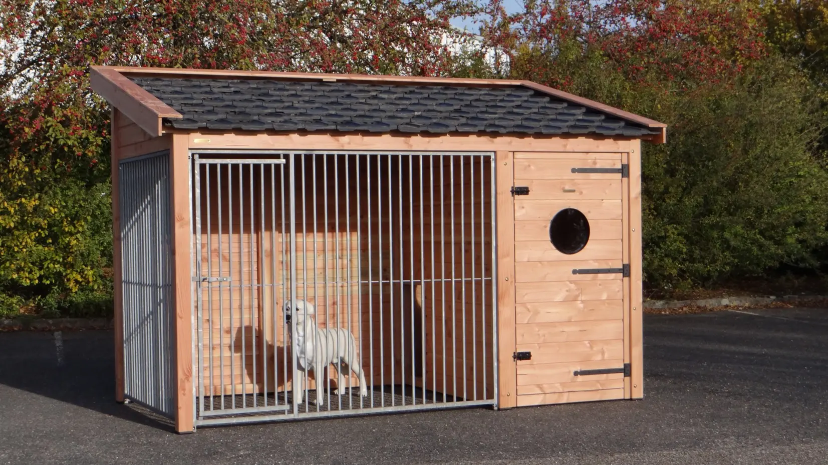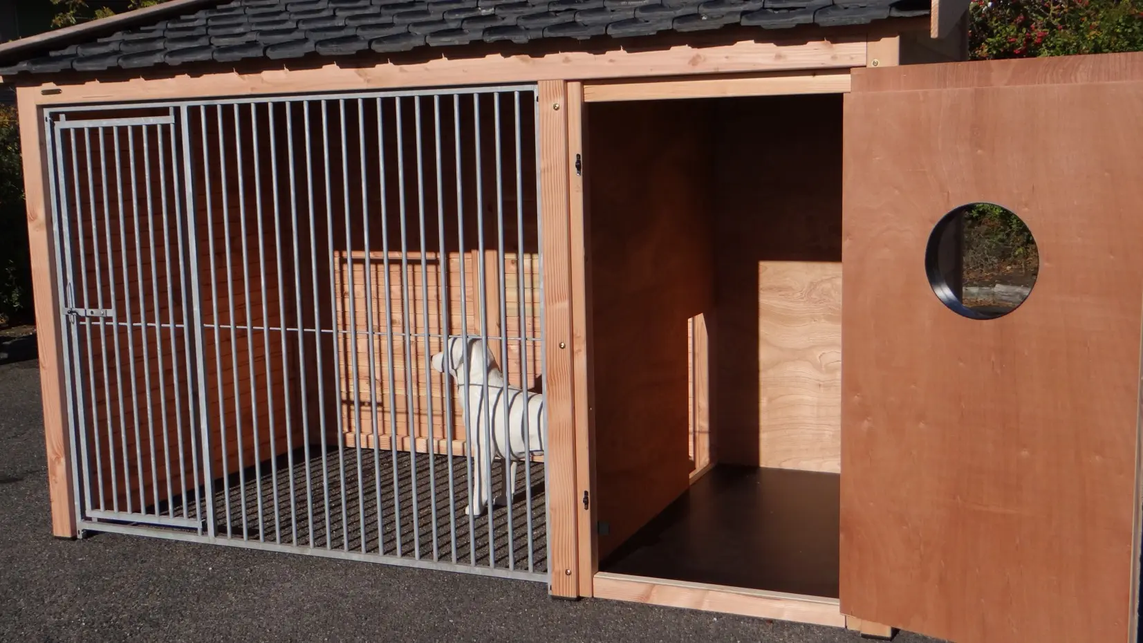 - Met keramische dakpannen: om het hondenhok extra charme te geven worden 2e hands restauratie dakpannen gebruikt