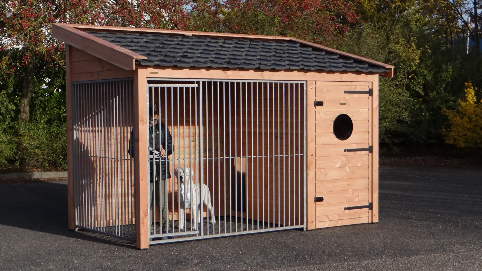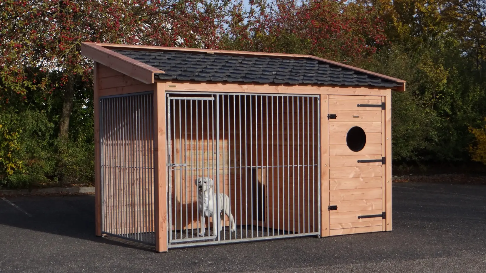 Hondenkennel Max 2 van onbehandeld Douglas is een oerdegelijke kennel, voorzien van keramische dakpannen en daardoor zeer duurzaam en onderhoudsvriendelijk. Zowel nachthok als ren zijn goed toegankelijk via de ruime deuren, en u kunt rechtop staan in deze kennel. Verder behoeft deze kennel de komende 5-10 jaar geen onderhoud. Een perfect verblijf voor uw hond in alle jaargetijden.