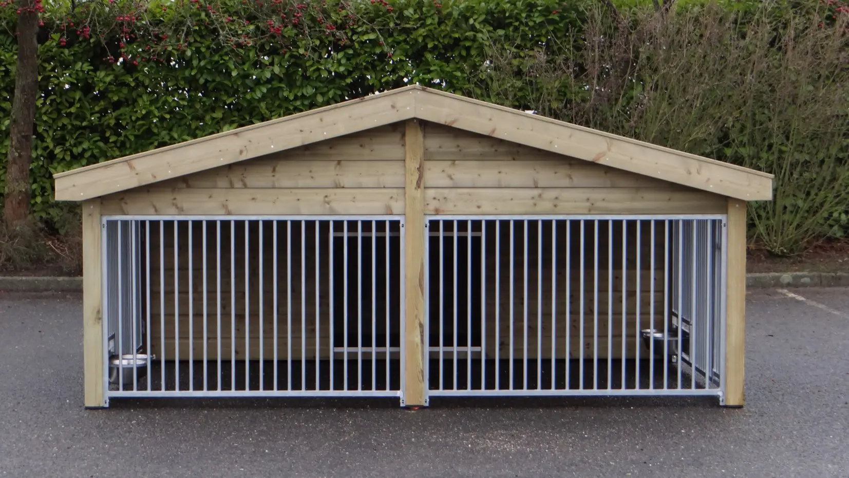 Hondenkennel Rex 2 Compart is gemaakt van geïmpregneerd vurenhout en voorzien van gerestaureerde keramische dakpannen. De dubbele hondenkennel is een robuuste, stijlvolle kennel met twee ruime hondenrennen en twee comfortabele hondenhokken. Daardoor is deze kennel Rex Compart ideaal om 2 honden in te houden, terwijl ze toch afzonderlijk van elkaar blijven. Beide hondenrennen zijn optioneel te voorzien van een draaibaar voederstel. De kennelpanelen zijn warmbad verzinkt. Beide nachthokken van deze kennel hebben een betonplex bodem.