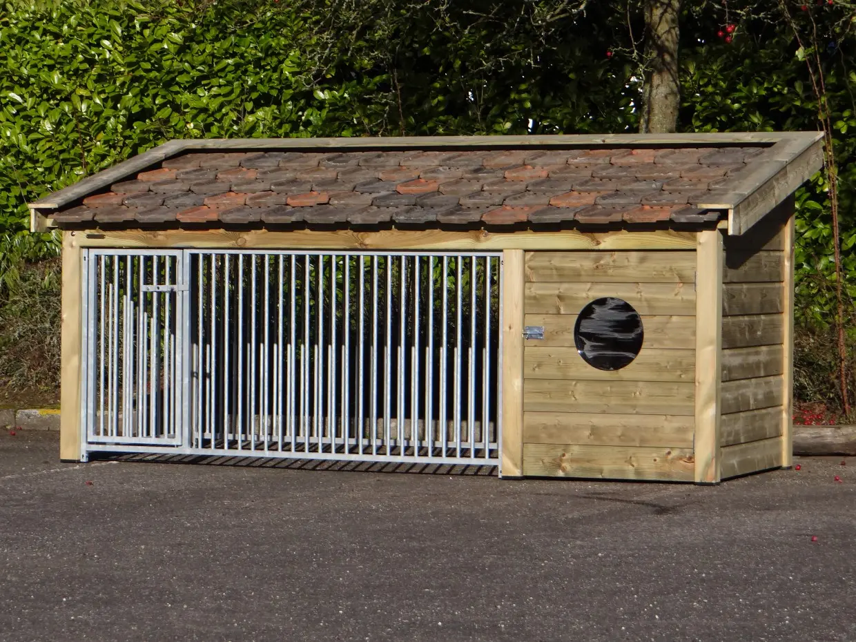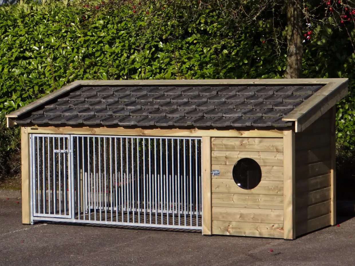 Hondenren Roxy 3 met een ingebouwd geïsoleerd nachthok en een open ren onder 1 dak. Het dak is gemaakt van keramische dakpannen, en u heeft daarbij keuze uit 3 kleuren. Al het hout is verduurzaamd vuren hout zodat u er geen onderhoud aan hebt. De vloer in het nachthok is van Beton-multiplex met antisliplaag en kan daarom gemakkelijk schoon gehouden worden. Met deze top kwaliteit kennel geeft u uw hond een fijn en prachtig buitenverblijf.