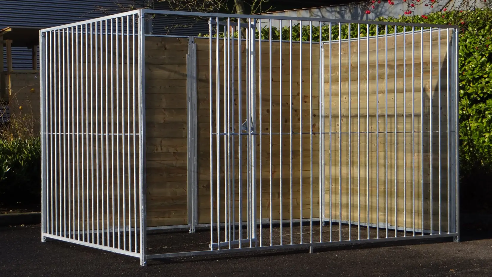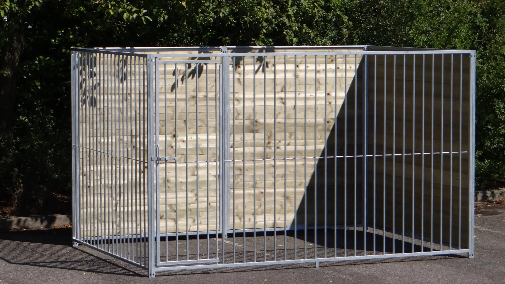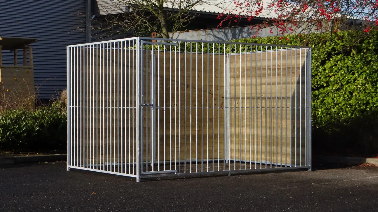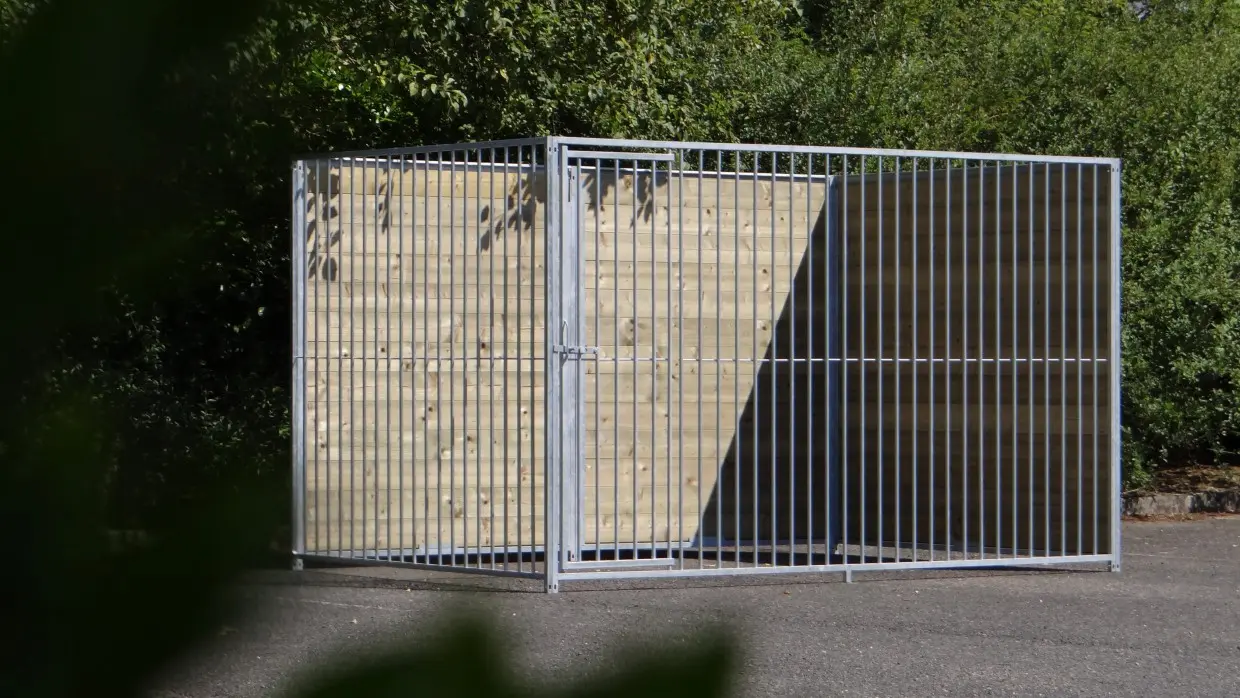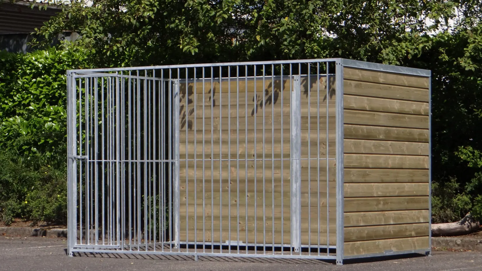 Hondenkennel met afmeting van 300x200cm. Voorzien van 2 dichte houten wanden en 2 traliepanelen, waarvan één met een deur. Hierdoor ontstaat een fijne, beschutte hoek waar uw hond achter kan liggen, of waar het nachthok kan staan. Het hout wat wordt gebruikt voor de houten wanden is geïmpregneerd vurenhout.