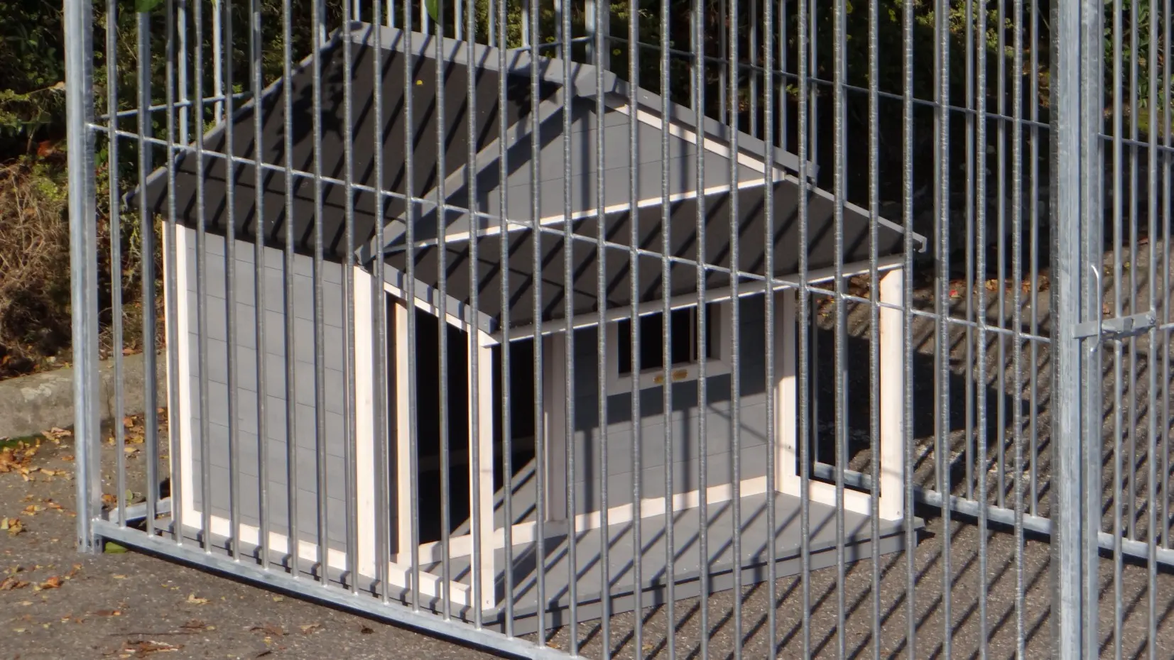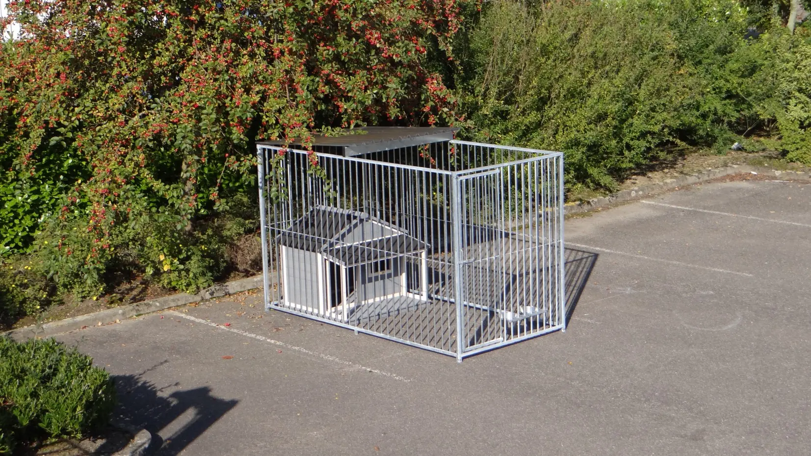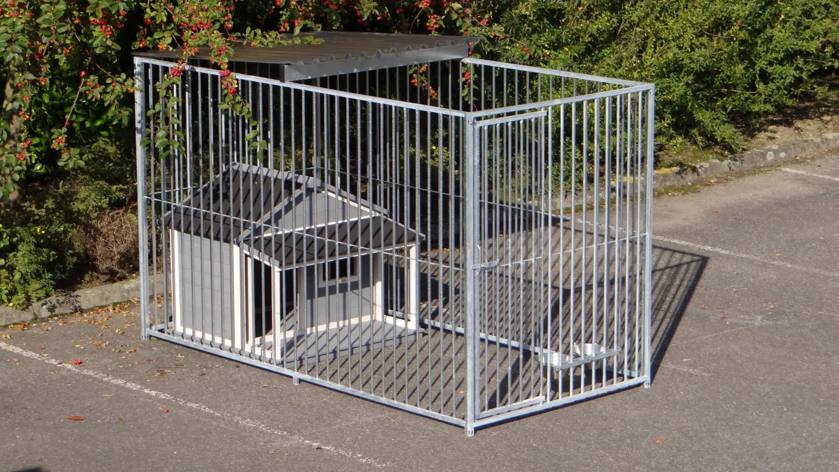 Hondenkennel met verzinkte kennelpanelen. De kennel wordt geleverd met half dak en inclusief het mooie hondenhok Wooff. Standaard wordt er geen voederstel meegeleverd. Het draaibare voederstel met dubbele voerbakken is optioneel. Dit complete set biedt een stevige en veilige buitenruimte voor uw hond. Kennel en hok zijn uit voorraad leverbaar.
