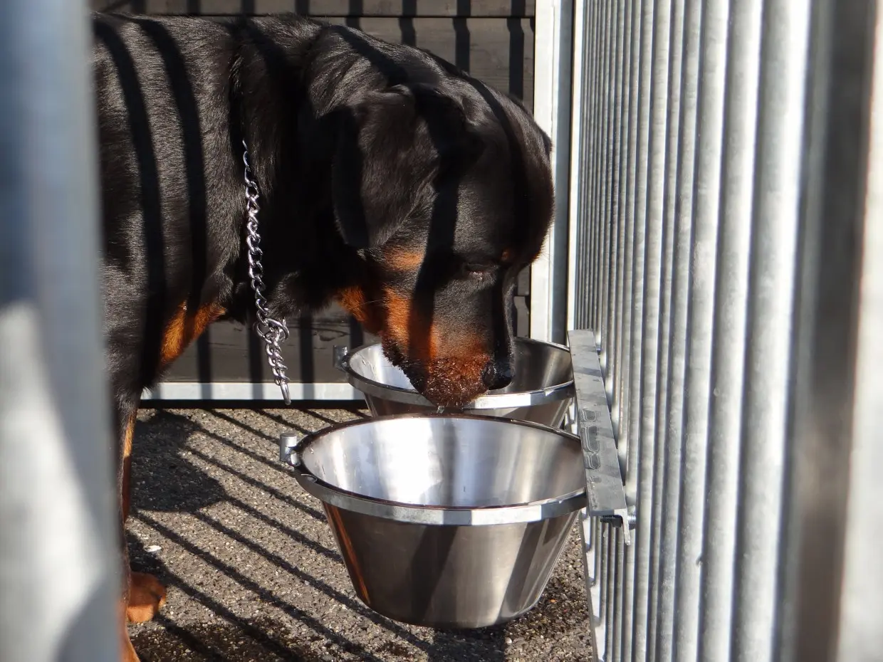 Met een draaibaar voedersysteem (2 RVS bakken van 2,3 ltr.) kunt u uw hond gemakkelijk en snel van buitenaf voorzien van voer en vers drinkwater.