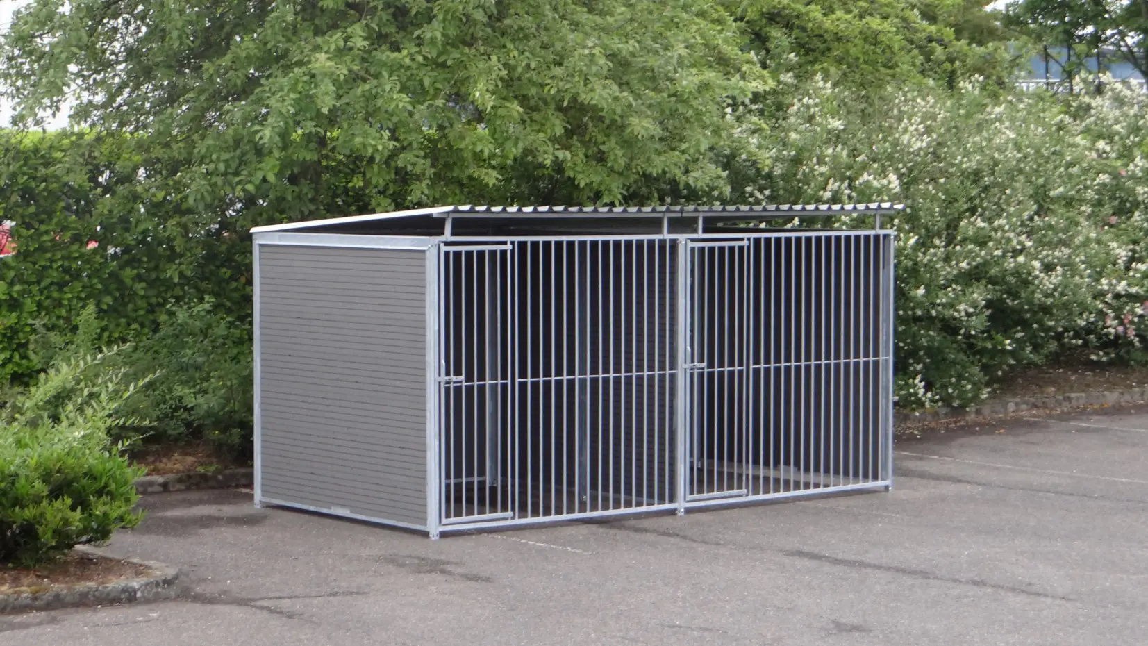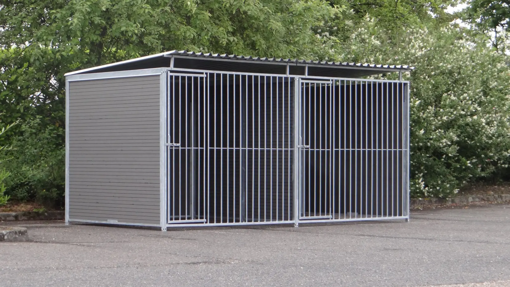 De dubbele hondenkennel FERM met kunststof panelen is een kennel van de beste kwaliteit. De traliepanelen aan de voorkant zijn verzinkt. Achterkant en zijkanten zijn opgebouwd uit een verzinkt frame met WPC-delen. Het kenneldak bestaat uit stalen dakplaten, die aan de onderkant voorzien zijn van vilt, wat geluiddempend is bij regen. Kwaliteit in optima forma. Deze hondenren is ook verkrijgbaar in andere uitvoeringen. Bel of mail gerust voor de mogelijkheden!