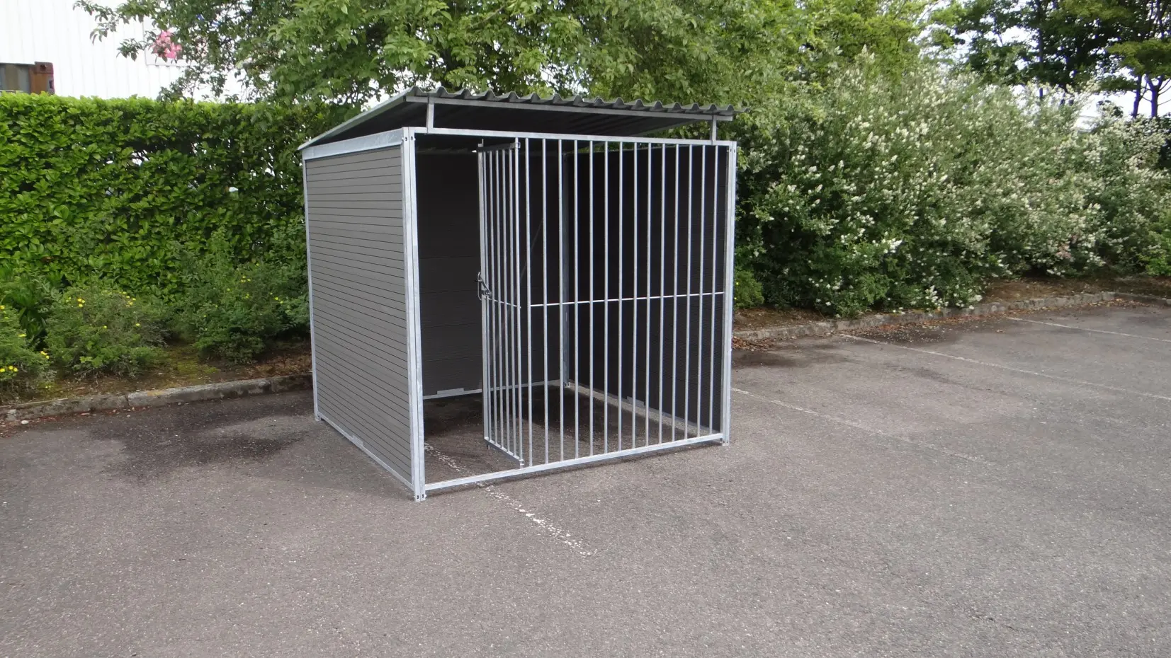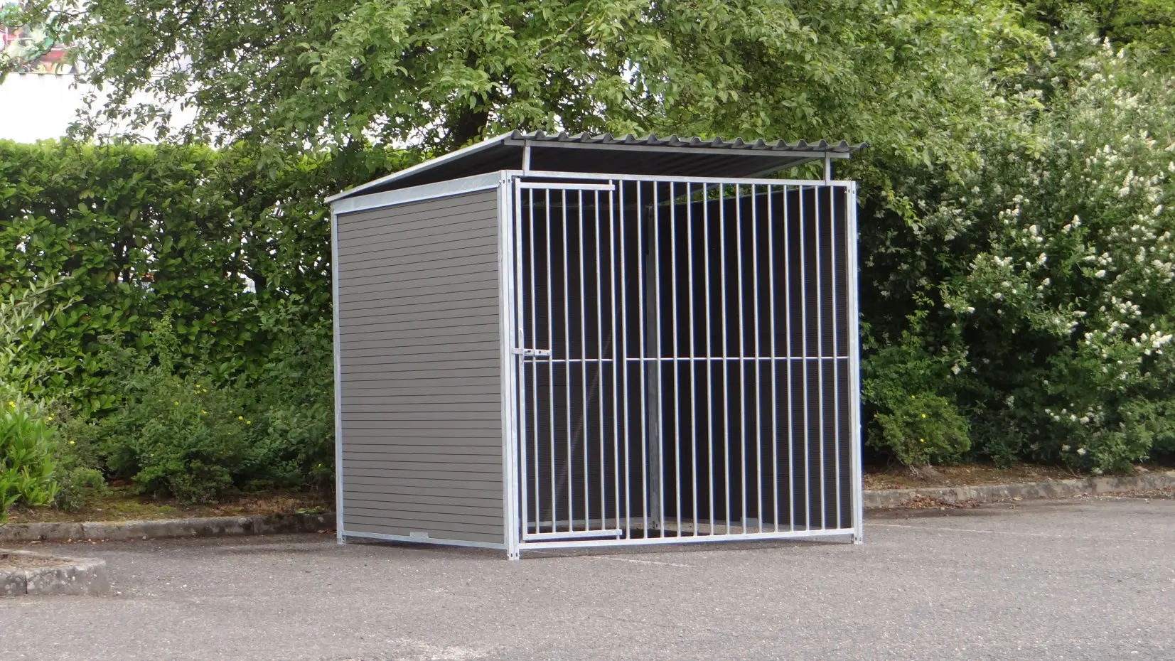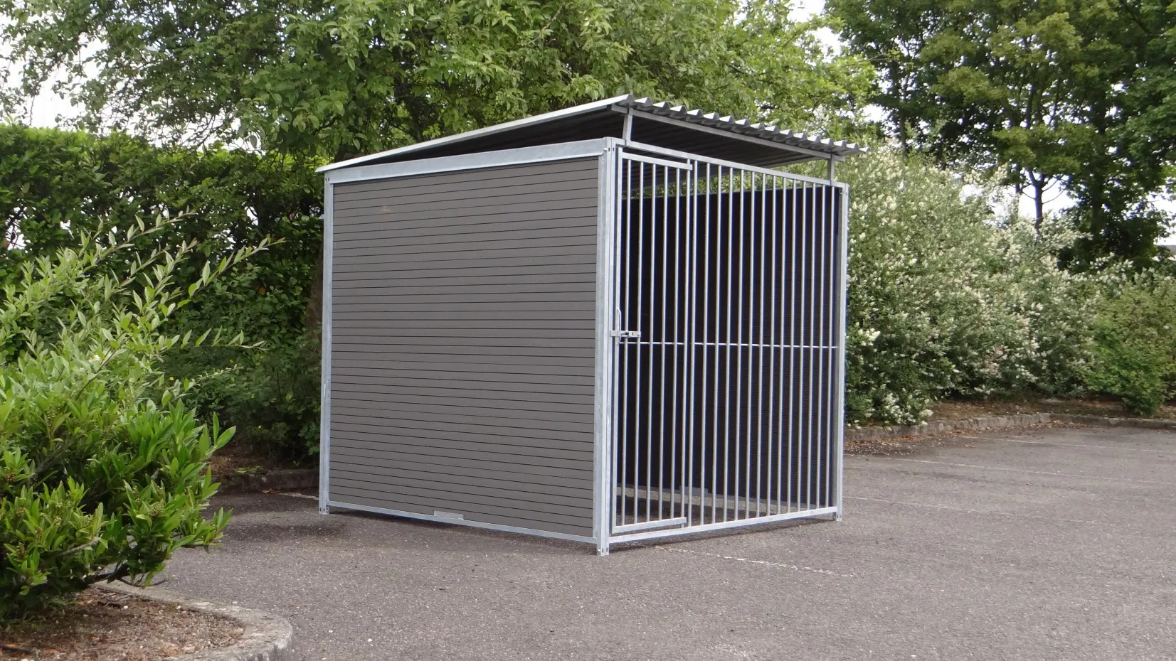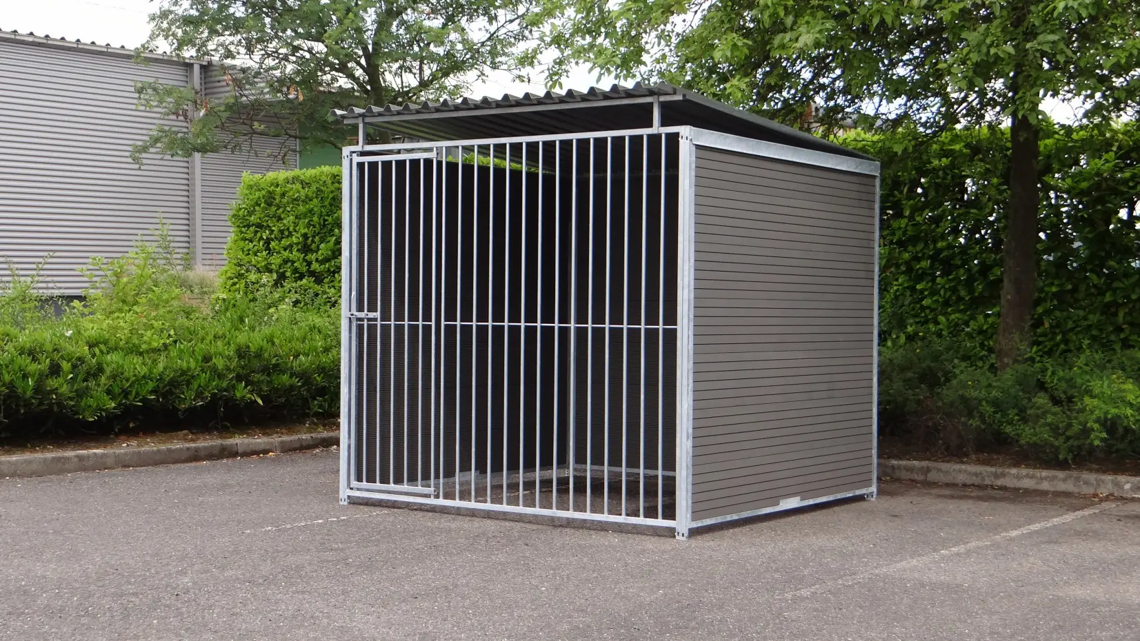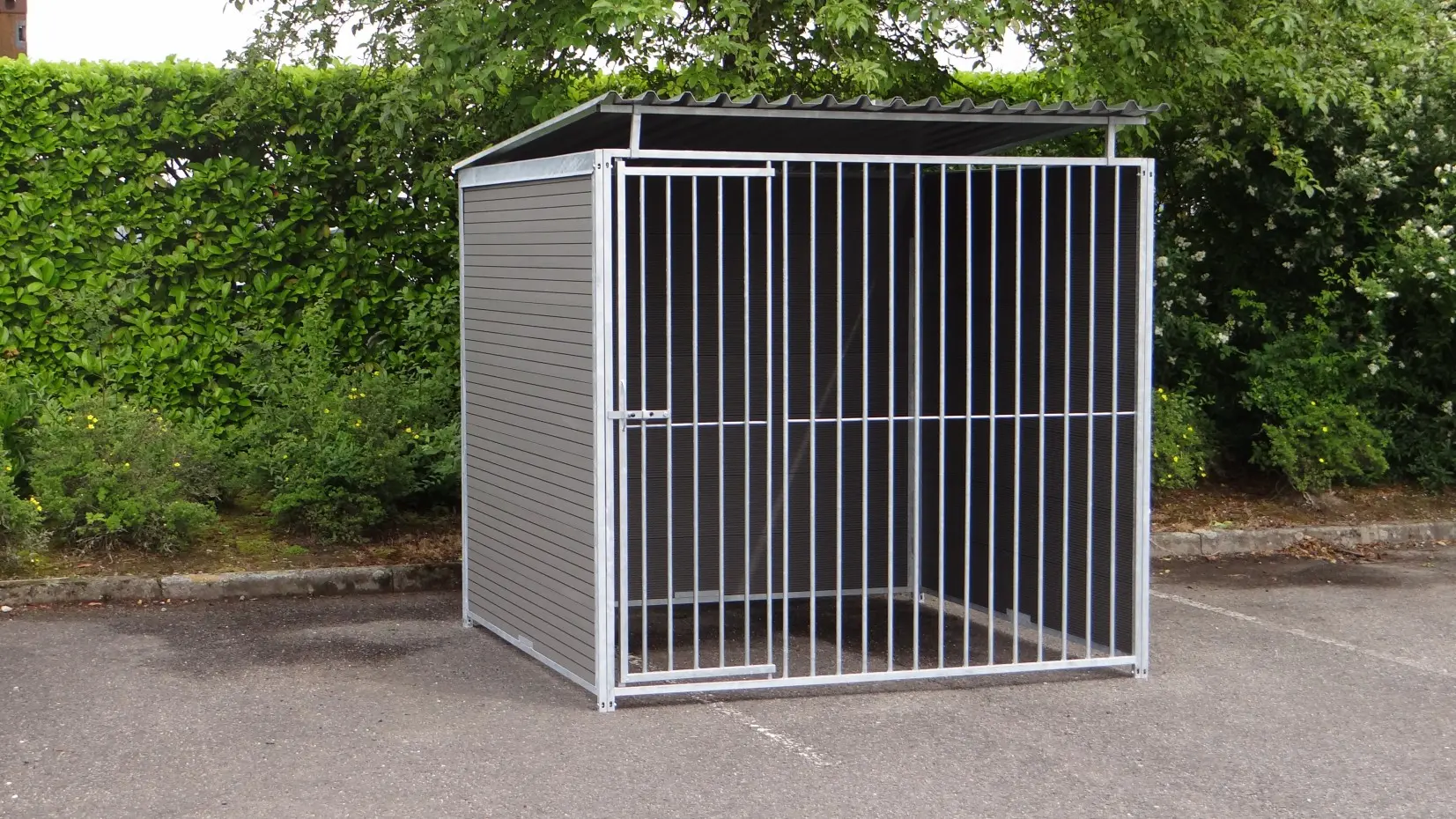 Deze stevige, gegalvaniseerde hondenkennel is een optimaal buitenverblijf voor uw hond. De kennel heeft een afmeting van 2x2m en is voorzien van een dak. Achterkant en zijkanten bestaan uit dichte wanden met WPC-delen. De voorkant is een gegalvaniseerd kennelpaneel met deuropening. Uiteraard zijn onze hondenkennels ook leverbaar in andere afmetingen.