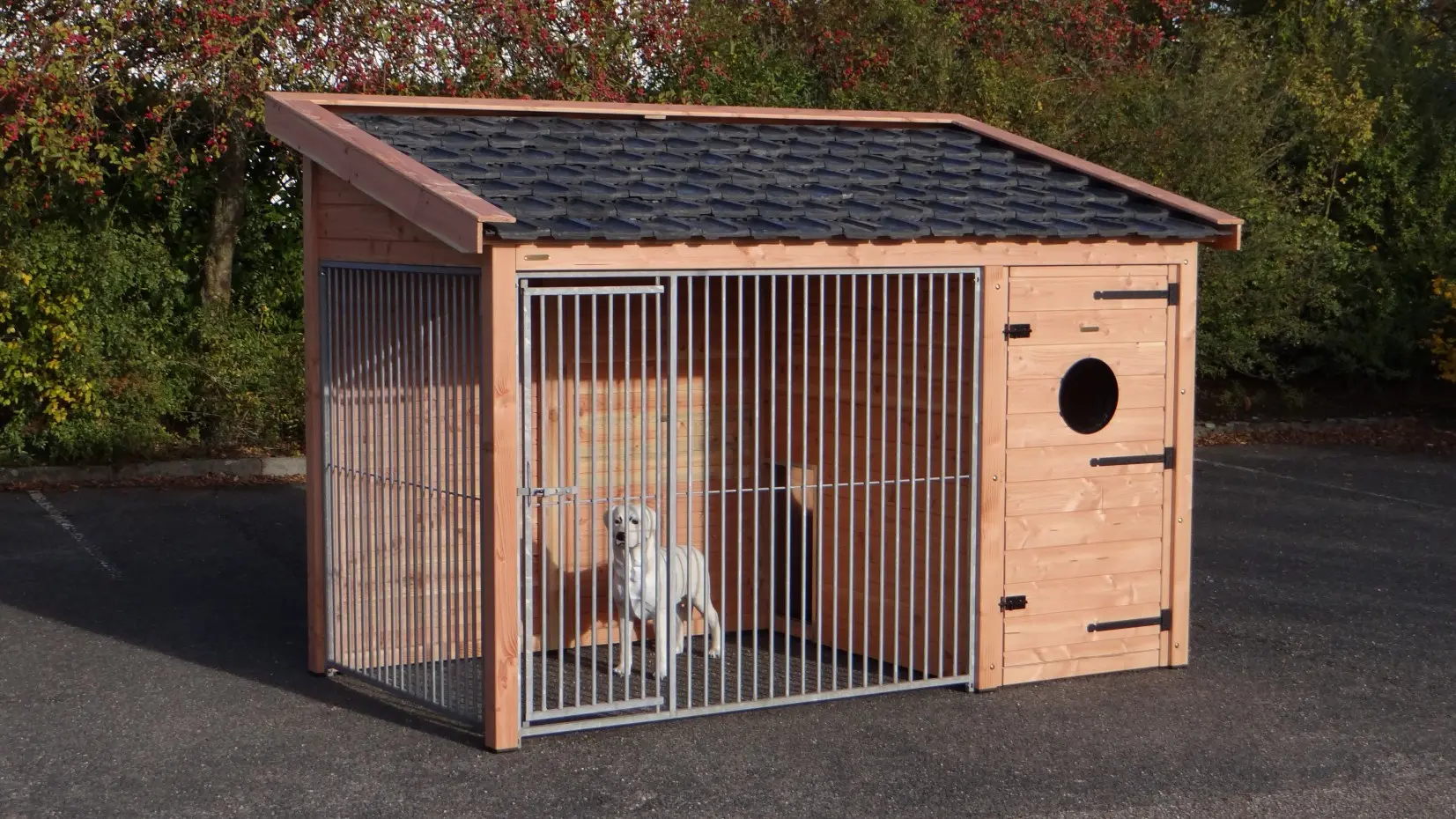 - Hondenkennel van douglashout, een mooi en duurzaam houtsoort dat zelfs onbehandeld geschikt is voor buiten. Wel zal het snel grijs worden, behalve als u het behandelt met beits of douglasolie.