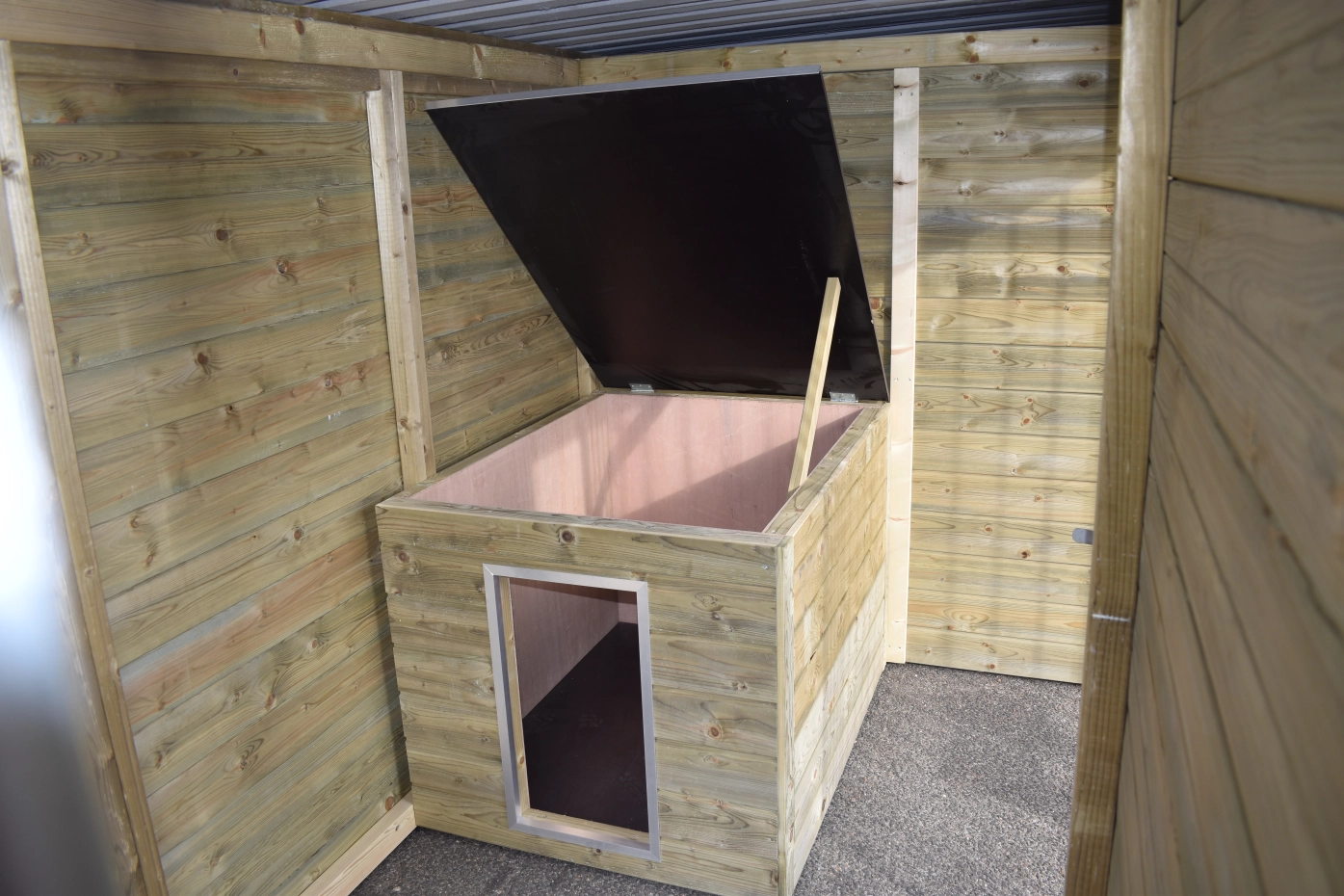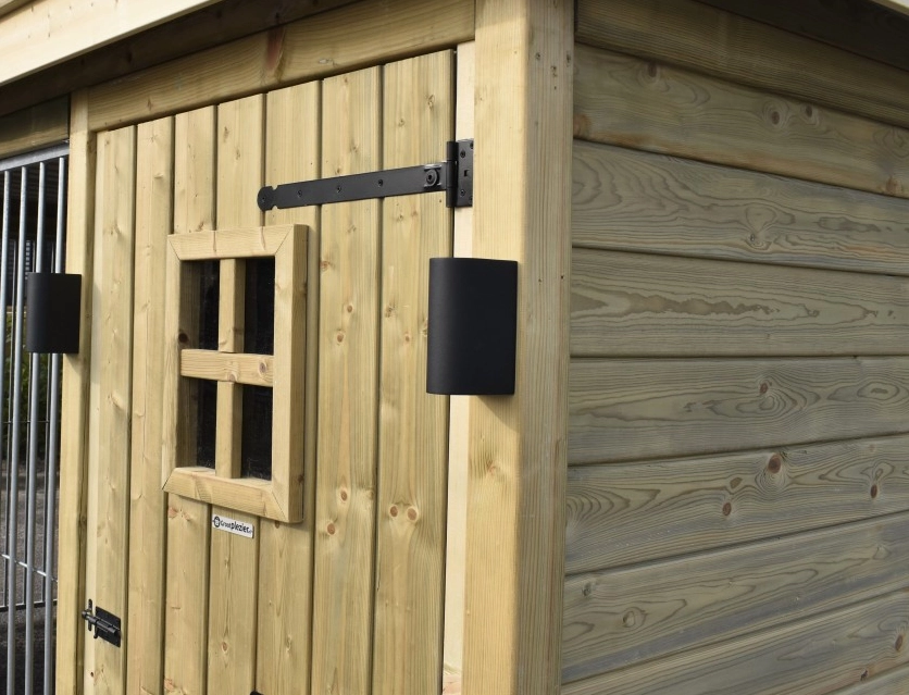 - De houten wanden zorgen voor beschutting tegen wind, neerslag en zon. Hierdoor ontstaat een beter klimaat in de kennel, het hele jaar door.