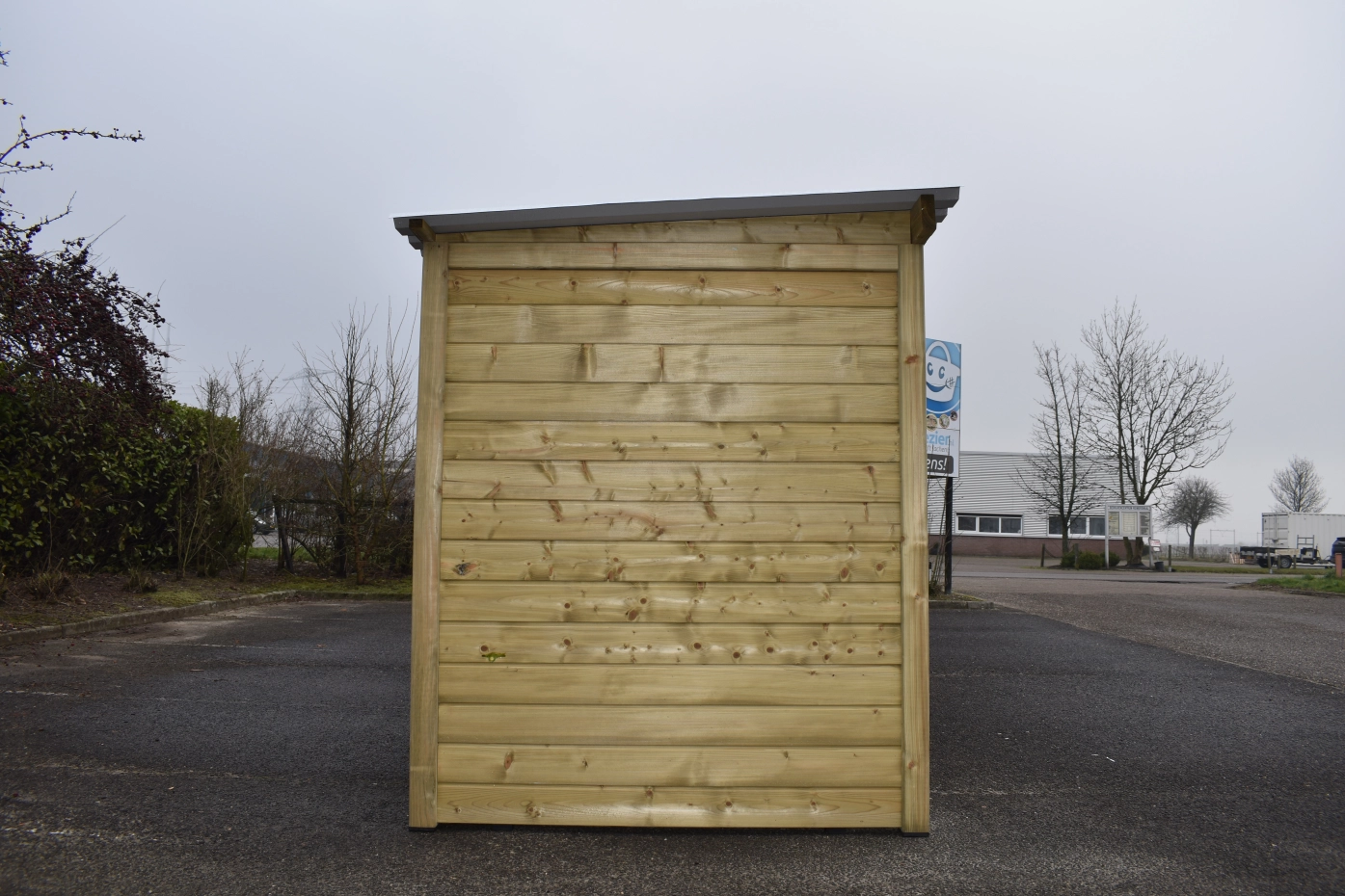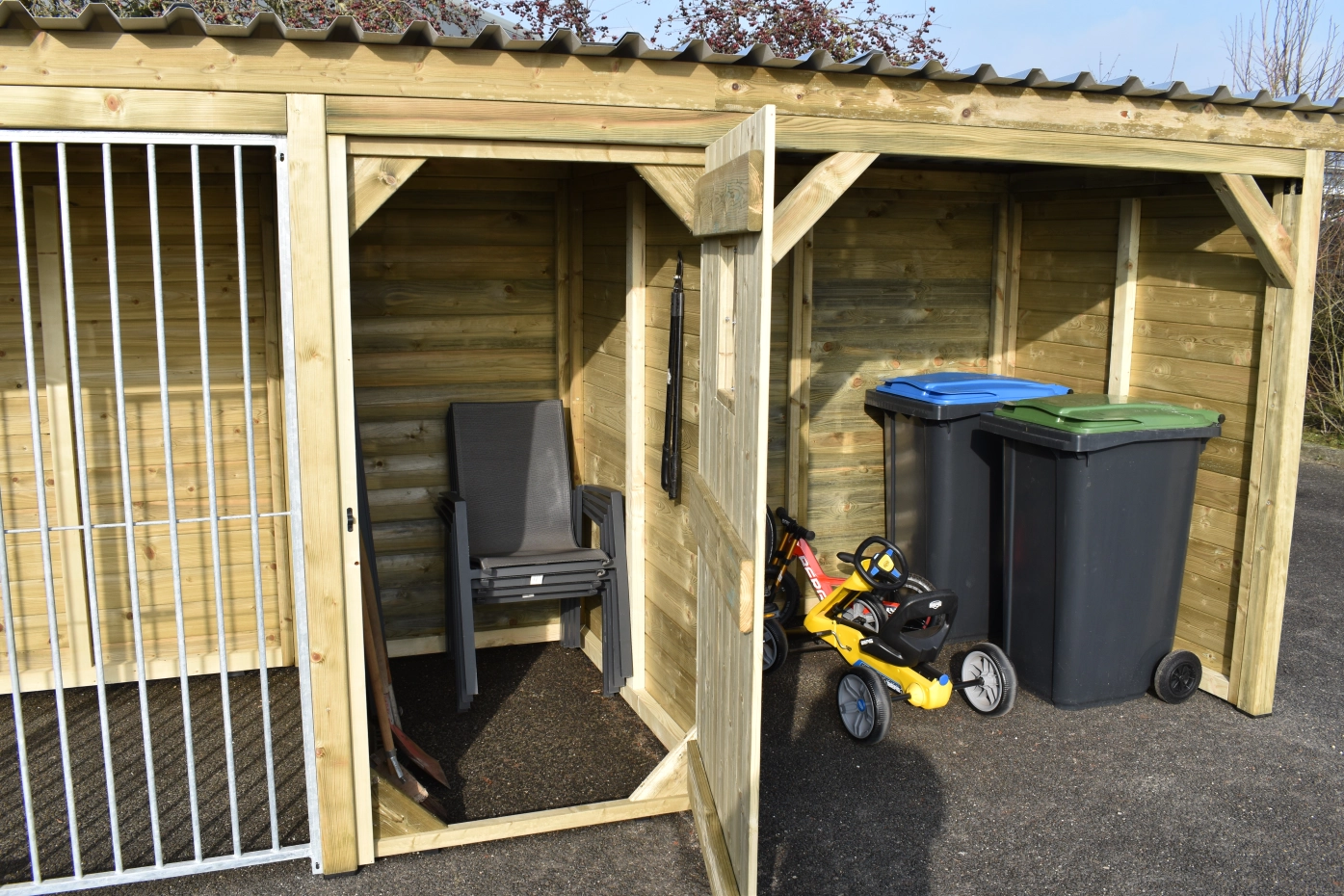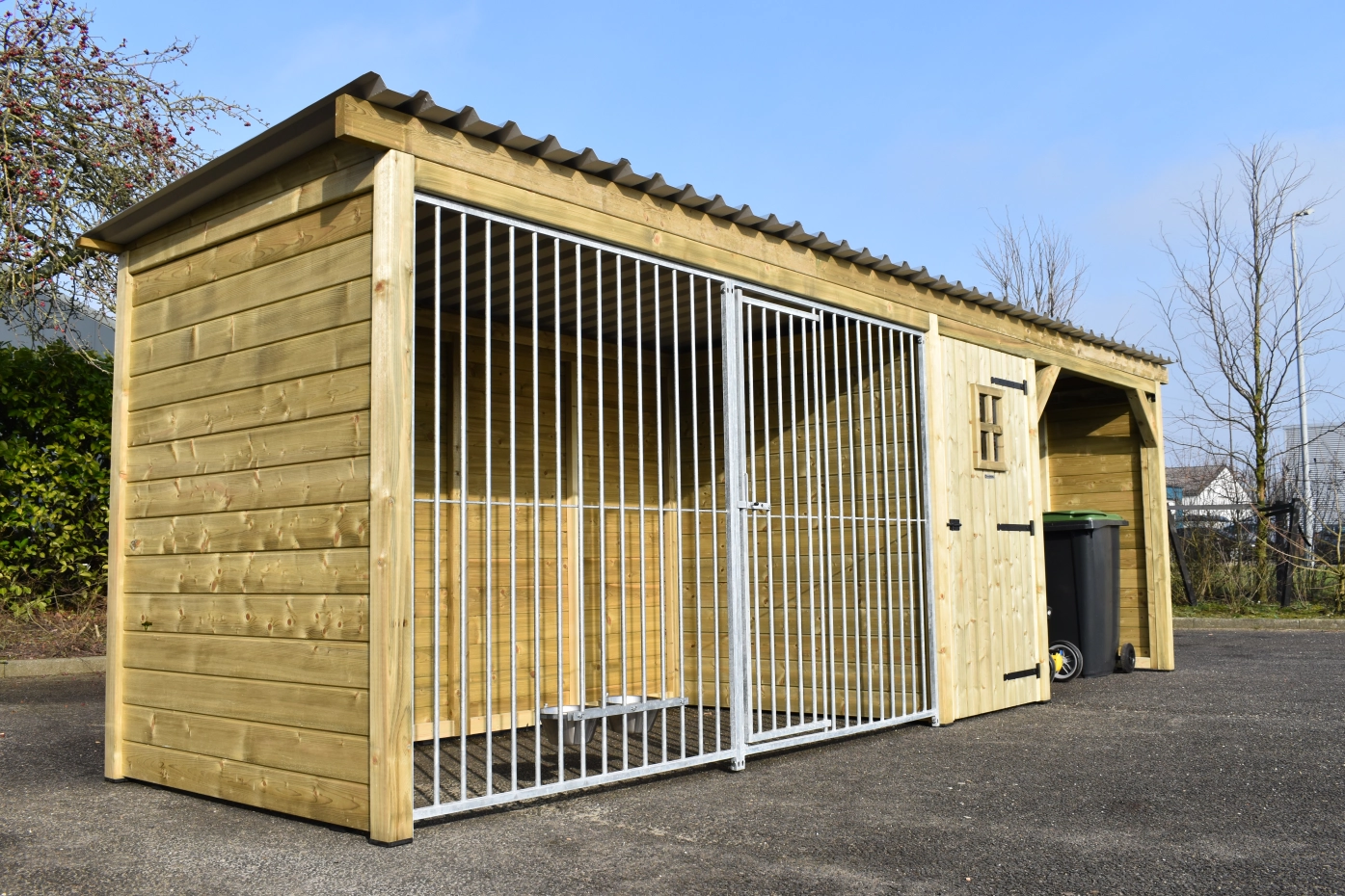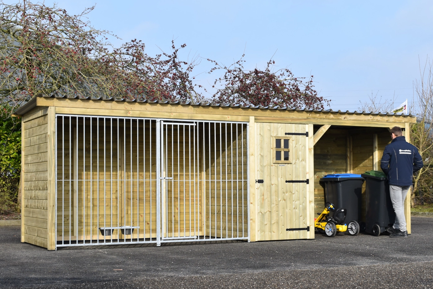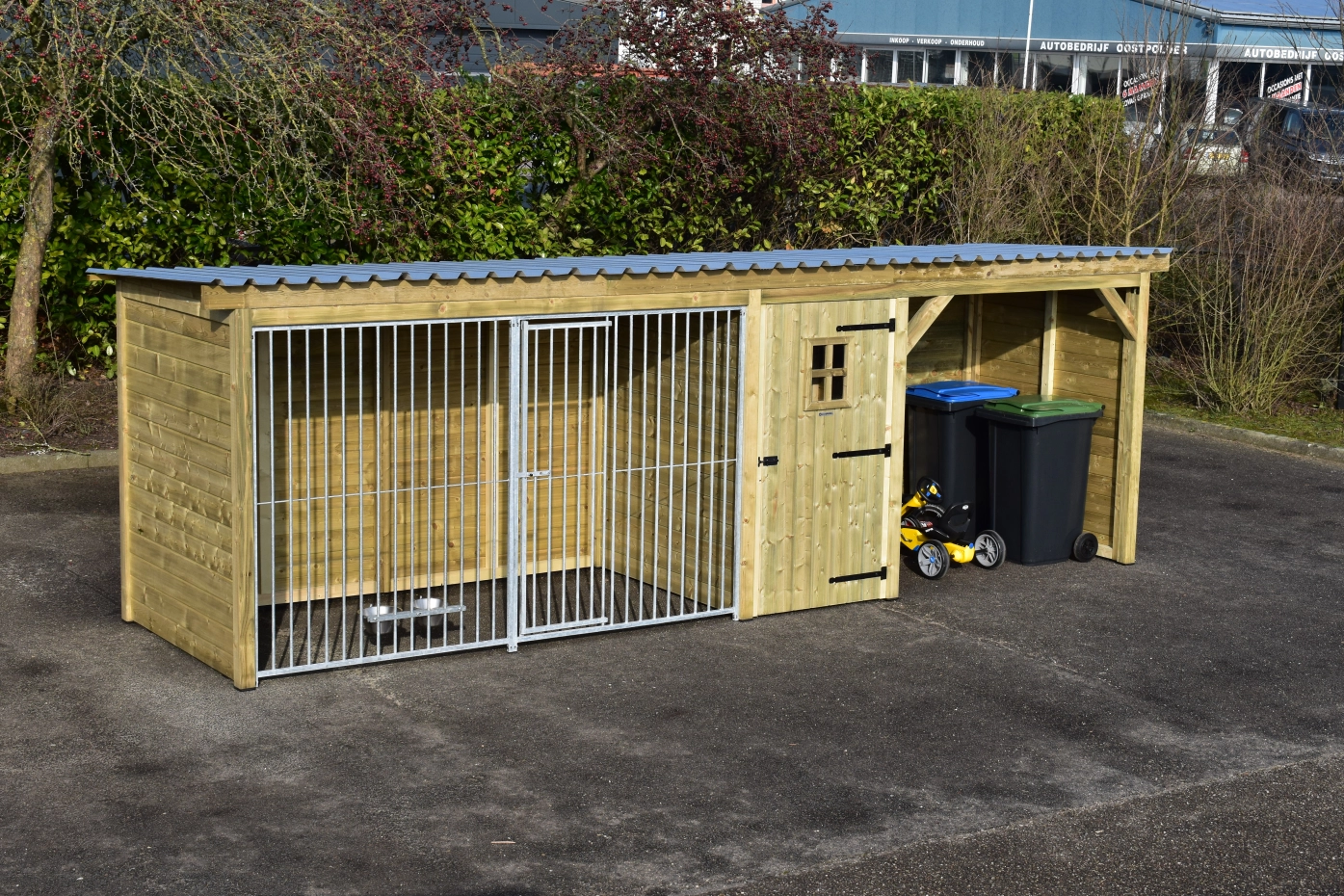 Kennel van geïmpregneerd vurenhout met een houtkader. Luxe ruime ren van 1,5x3 meter. Daarnaast een opbergruimte met luxe deur. Dan nog een afdak, en dit alles onder 1 dak! Omdat de kennel niet heel diep is neemt hij niet al te veel ruimte in en kan hij makkelijk in de lengte van de tuin staan. het hout is duurzaam en gaat minimaal 10-15 jaar mee. De kennel panelen zijn van grijs verzinkt staal en hebben ook de lange levensduur van10-15 jaar, dus al met al een degelijke kennel voor een mooie prijs! De dakplaten zijn van staal en voorzien van een vilt laag aan de onderzijde, dit voorkomt condensvorming en dempt de regen.