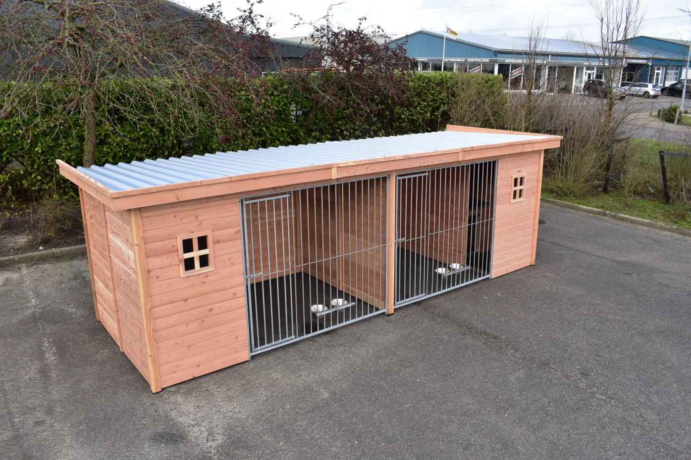 Prachtige grote kennel met tussenwand. Deze dubbele kennel geeft ruimte voor twee grote honden. De kennel is mooi symmetrisch gemaakt, dit geeft een prachtig plaatje voor in uw tuin! De kennel is voorzien van stalen verzinkte tralie panelen. Dit in combinatie met Douglashout geeft een mooi geheel. De nachthokken zijn voorzien van isolatie en 5mm plaatjes aan de binnenzijde, de voorwand is voorzien van rabat en in de opening zit aluminium. Op de kennel liggen stalen dakplaten. Deze zijn aan de onderzijde voorzien een vilt laag, dit voorkomt condensvorming.