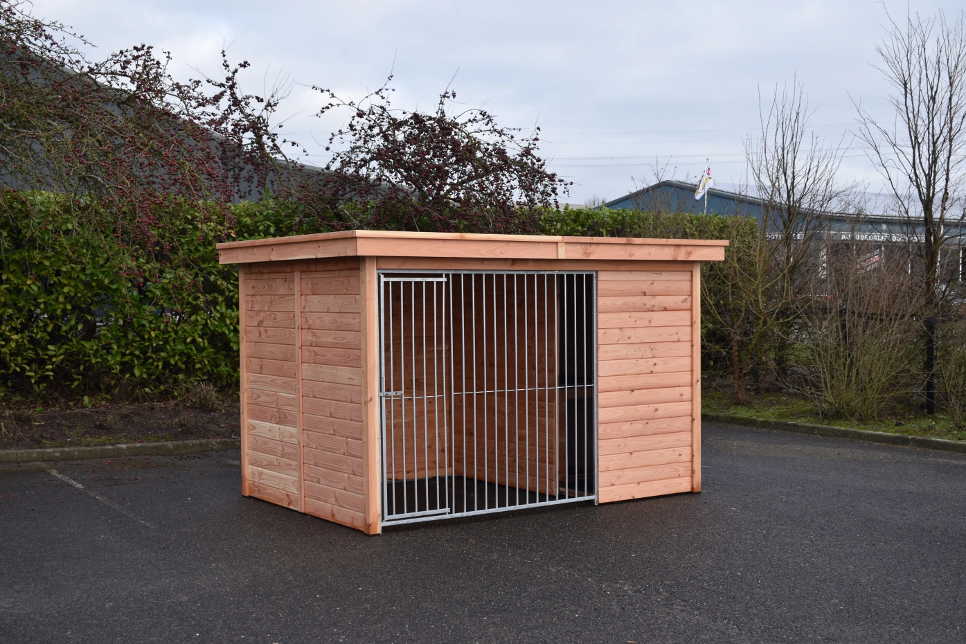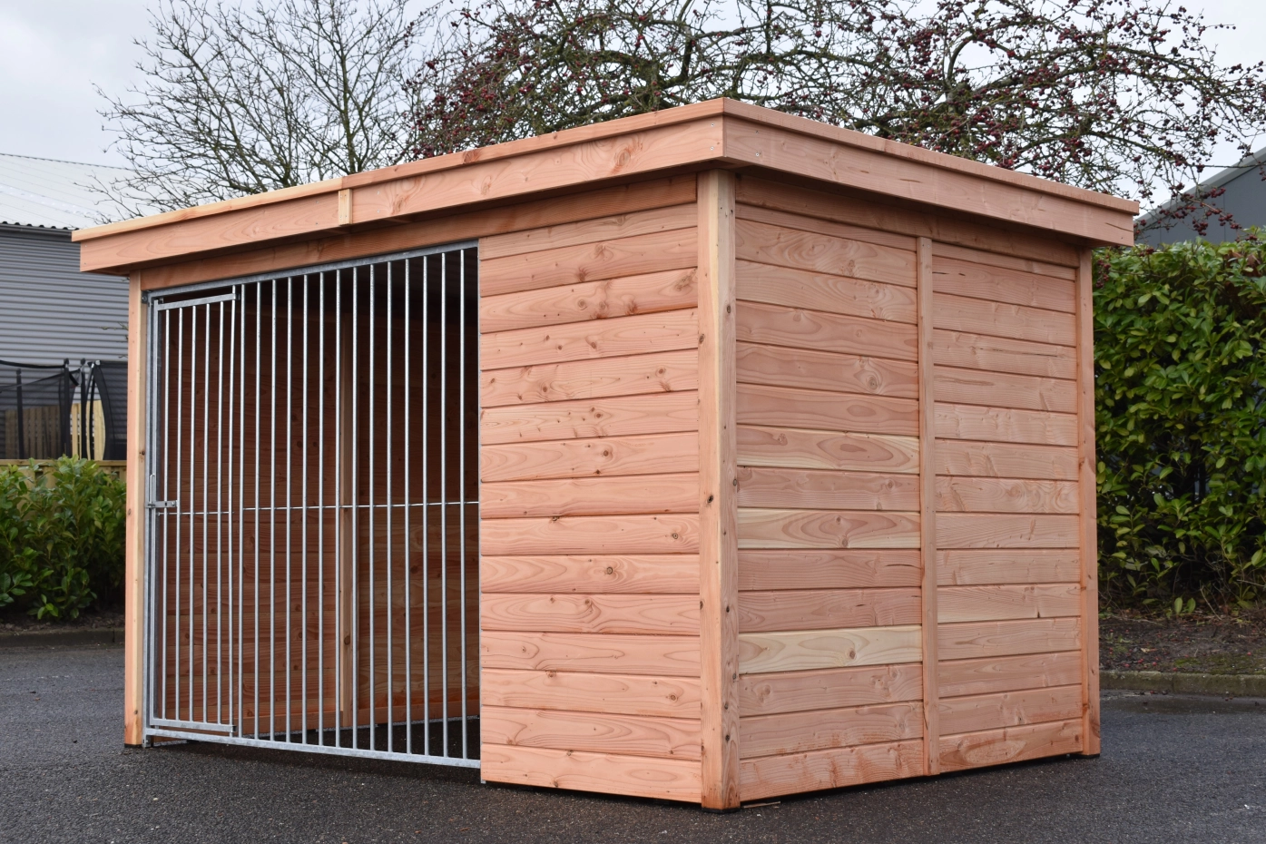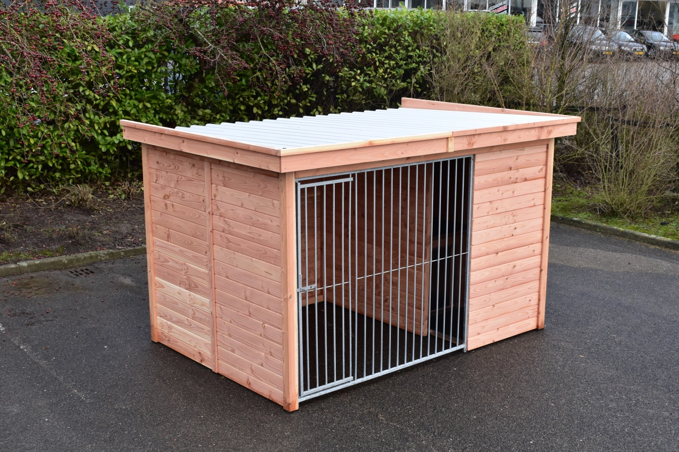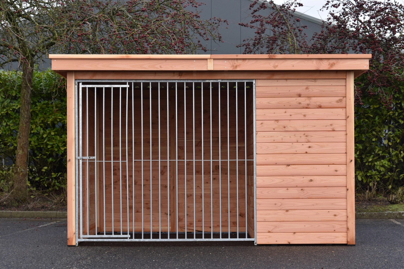 Douglas hondenkennel met geïsoleerd nachthok Easy, opgebouwd met Modul-panelen en houtkader. Strak afgewerkt met een luxe dakrand. Mooie luxe combinatie! Het nachthok is ruim met een handig scharnierend dak. De wanden van de kennel zijn van houten frames met daarop rabat, dit geeft een stevig en goed afgesloten kennel. Het traliewerk is van verzinkt staal en is goed roest werend. Het Douglashout heeft een lange levensduur en behoeft geen behandeling. Wel zal het hout na geruime tijd gaan vergrijzen. Als u dit wilt voorkomen, raden we aan om de kennel te beitsen.