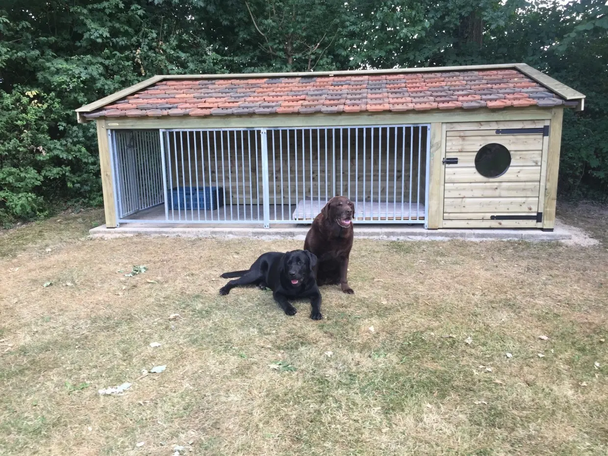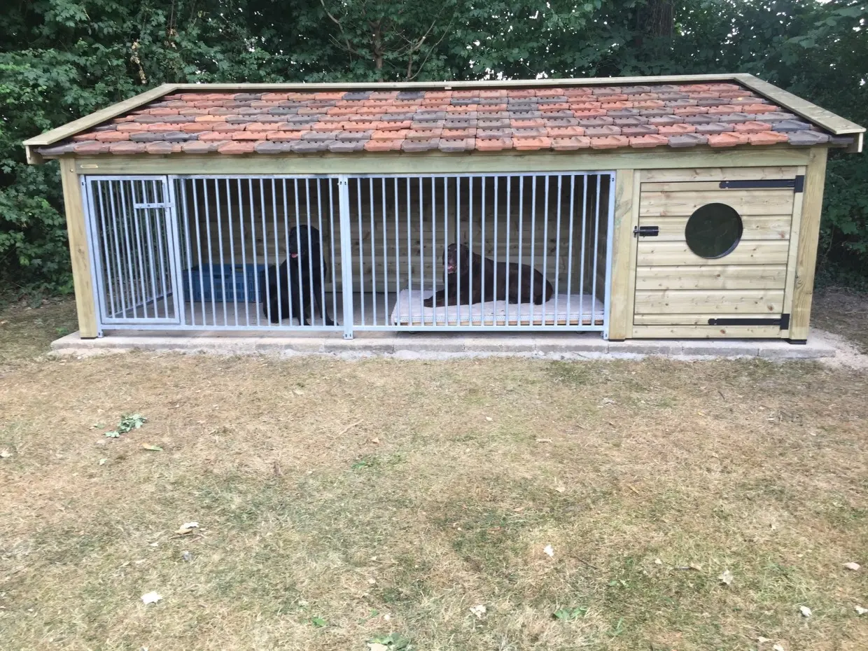 Hondenkennel Rex 2XL is geïmpregneerd en voorzien van keramische dakpannen. De hondenkennel bestaat uit een hondenren met een hondenhok: