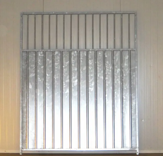 Gegalvaniseerd kennelpaneel damwand met bovenin spijlen. De spijlen zijn 46cm lang en staan ongeveer 8 cm uit elkaar. Een mooi kennelpaneel om regen gedeeltelijk tegen te houden, zodat de kennel niet helemaal nat wordt. De afmeting van dit paneel is 150x184cm (BxH). Ook geschikt als tussenwand in een kennel als honden elkaar niet mogen zien.