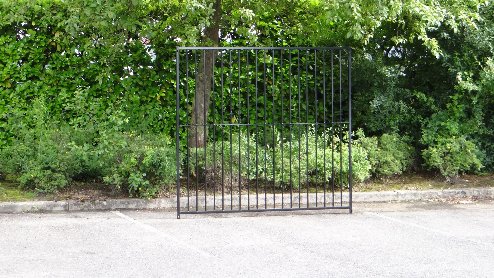 Kennelpaneel zwart, met afmeting 200x184cm (BxH). De afstand van de buitenste spijl tot het frame van het kennelpaneel is ca. 10,5cm. De overige spijlen hebben onderling een afstand van ca. 8cm.