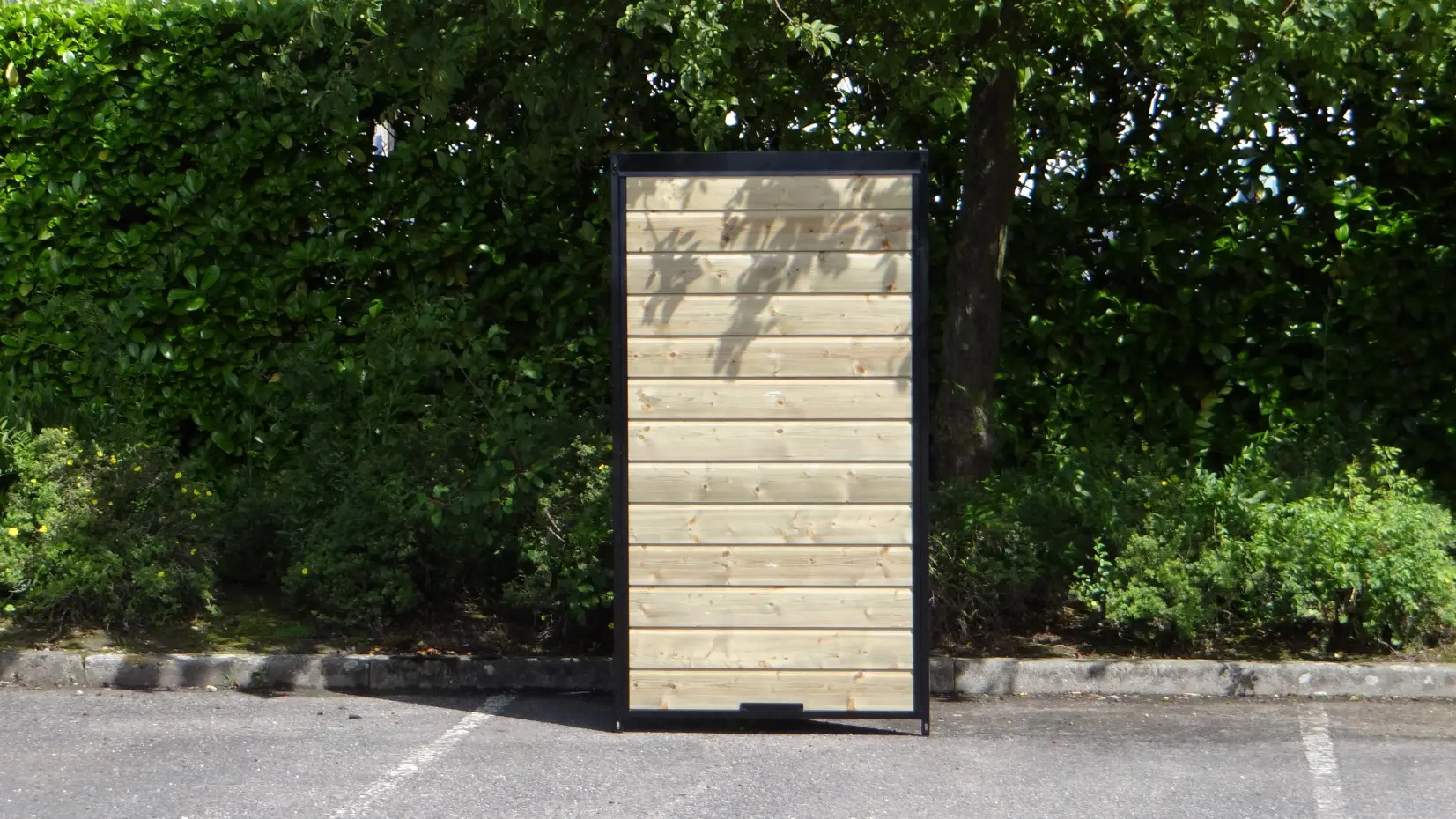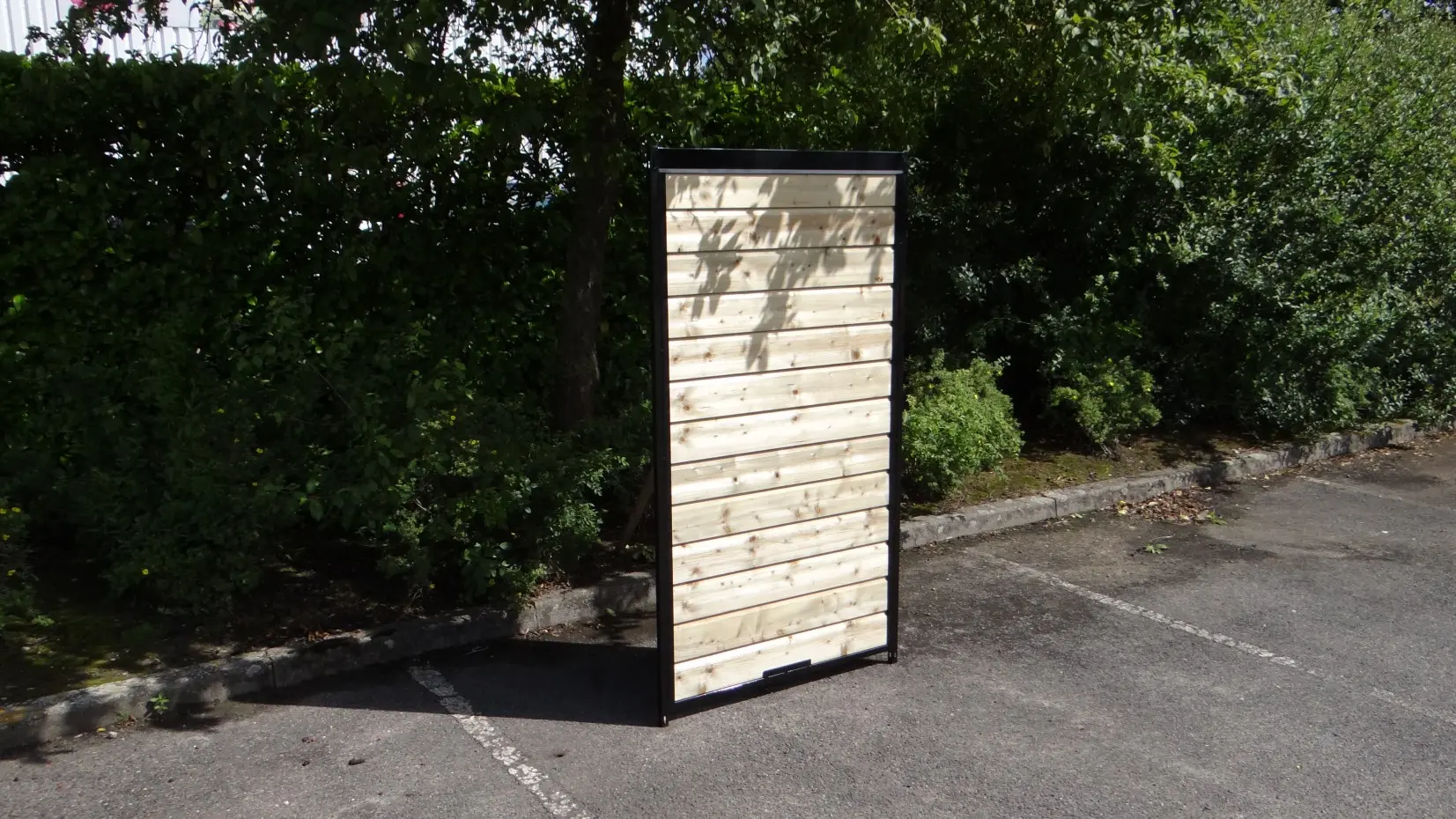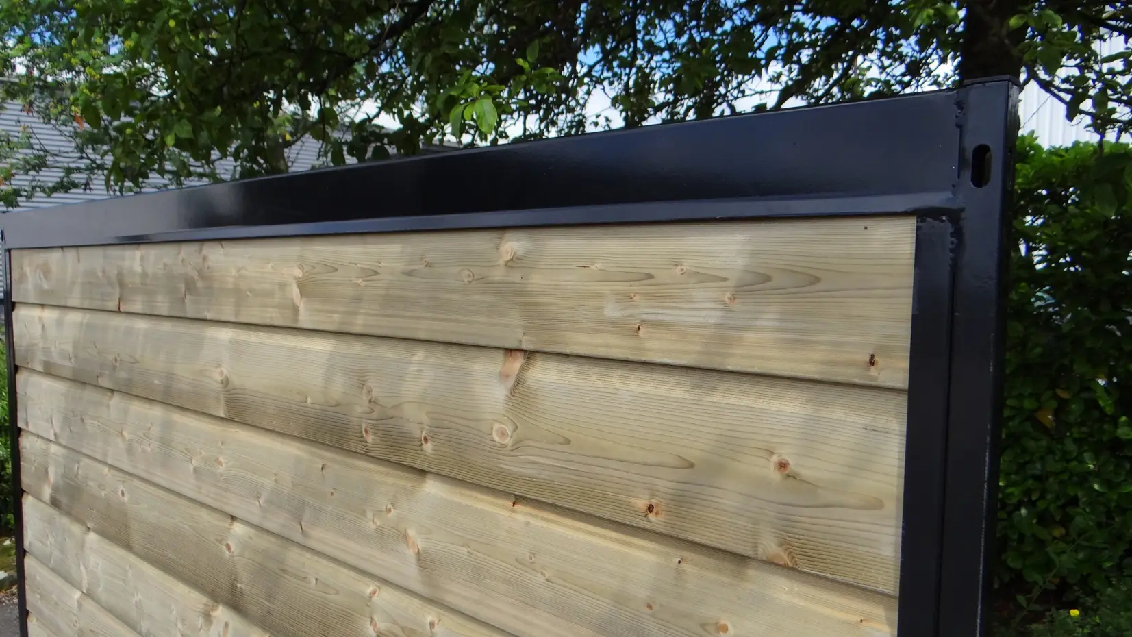 Zwart gepoedercoat kennelpaneel met verduurzaamde houten wand. Deze houten panelen zijn voorzien van verduurzaamd vuren rabatdelen van 18 mm dik, die verder geen behandeling nodig hebben.