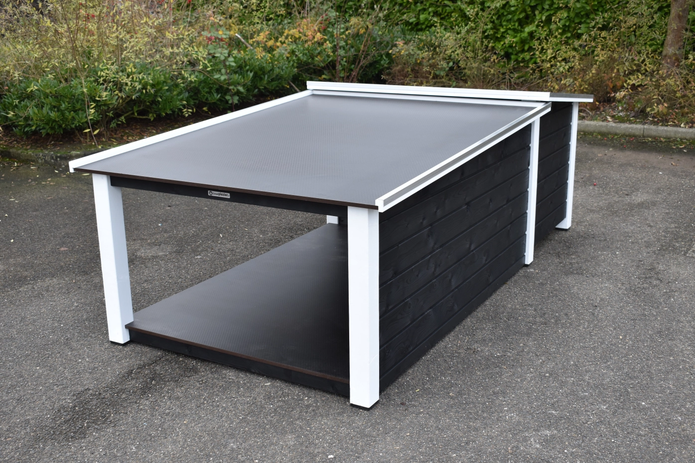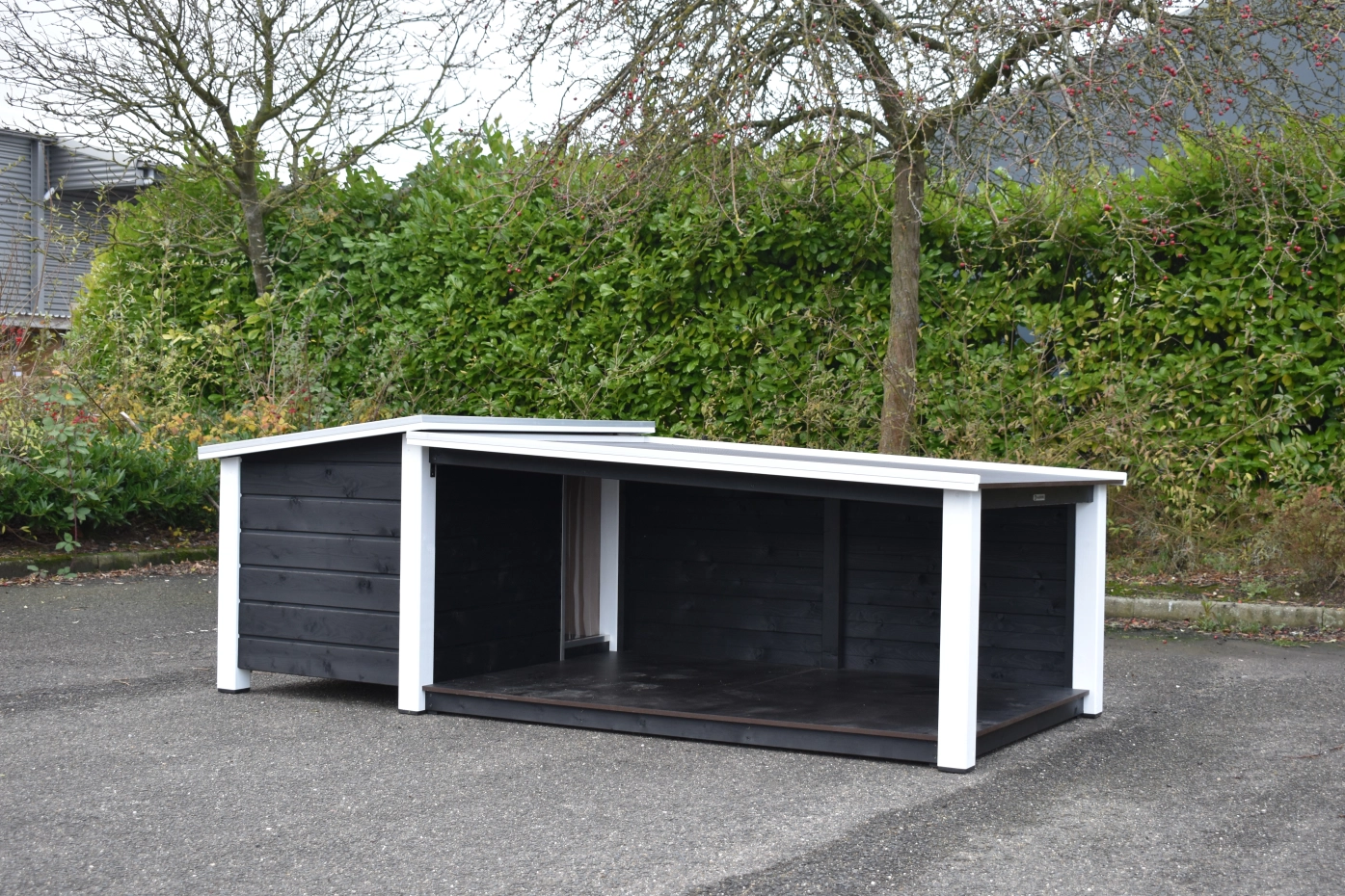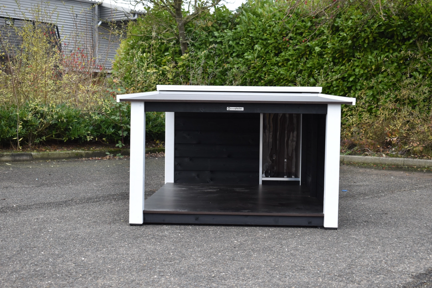 Het platte dak van het hondenhok kan open voor optimale toegankelijkheid. Ook is een fijn tochtschot aanwezig. Verder is de ingang afgewerkt met aluminium. Het betonplex dak is afgewerkt met aluminium randen en voorzien van een anti-slip laag, zodat uw hond er bovenop kan liggen. De vloer is eveneens van betonplex met anti-slip. Wanden, vloer en dak zijn geïsoleerd, zodat de warmte van uw hond langer in het hok blijft zitten. Dit hok is ook verkrijgbaar in Douglashout of geïmpregneerd vurenhout.