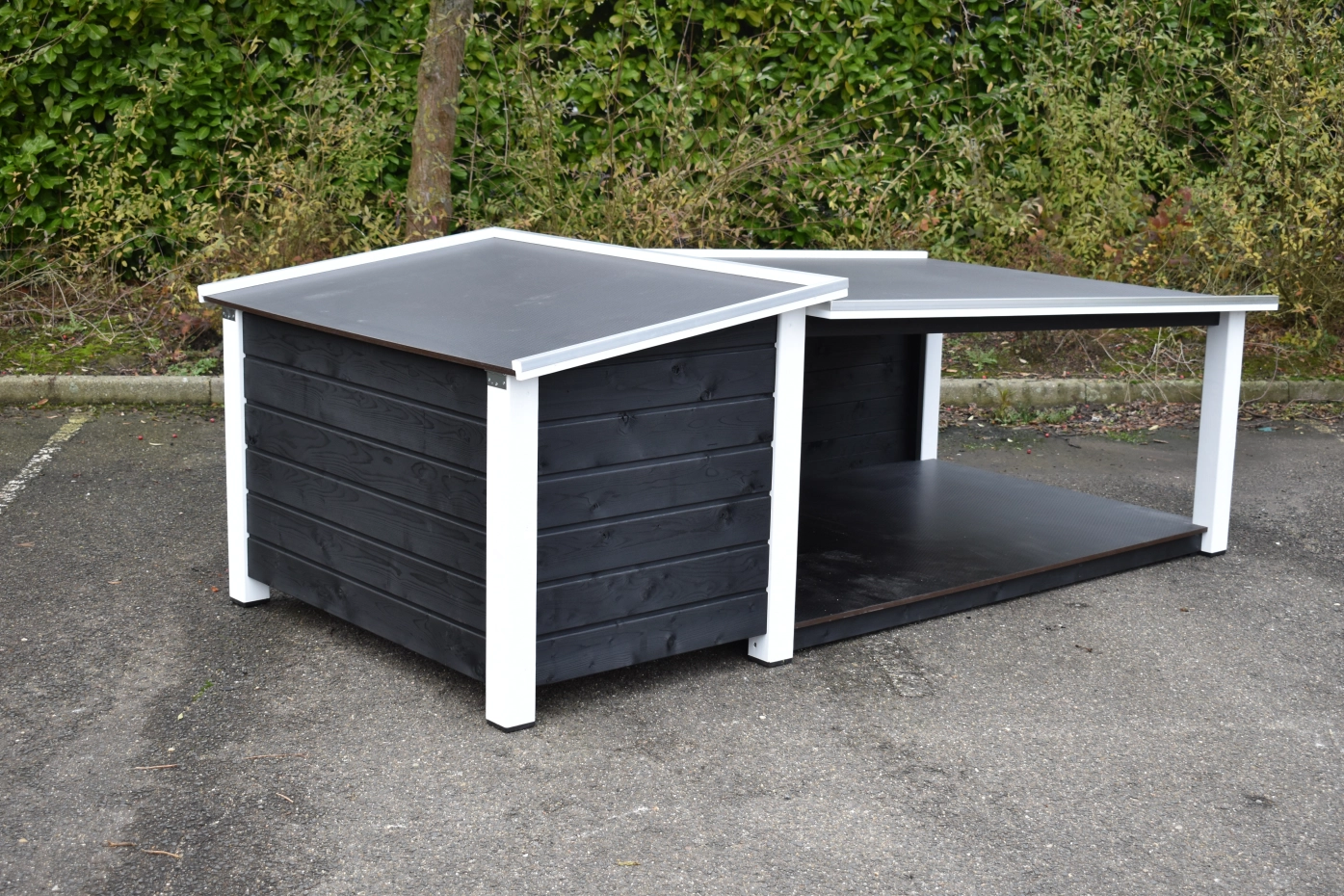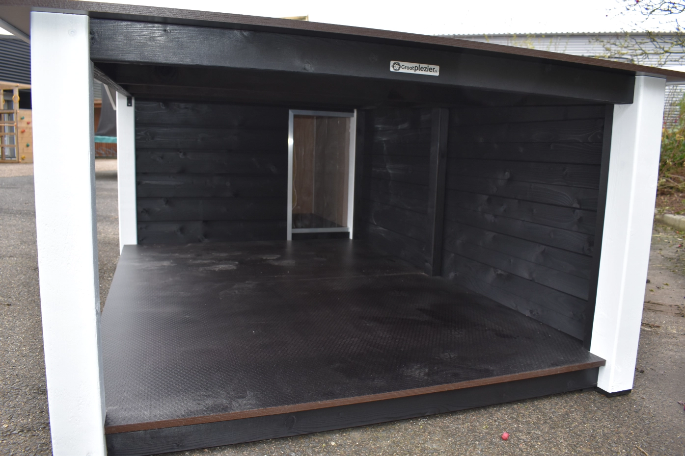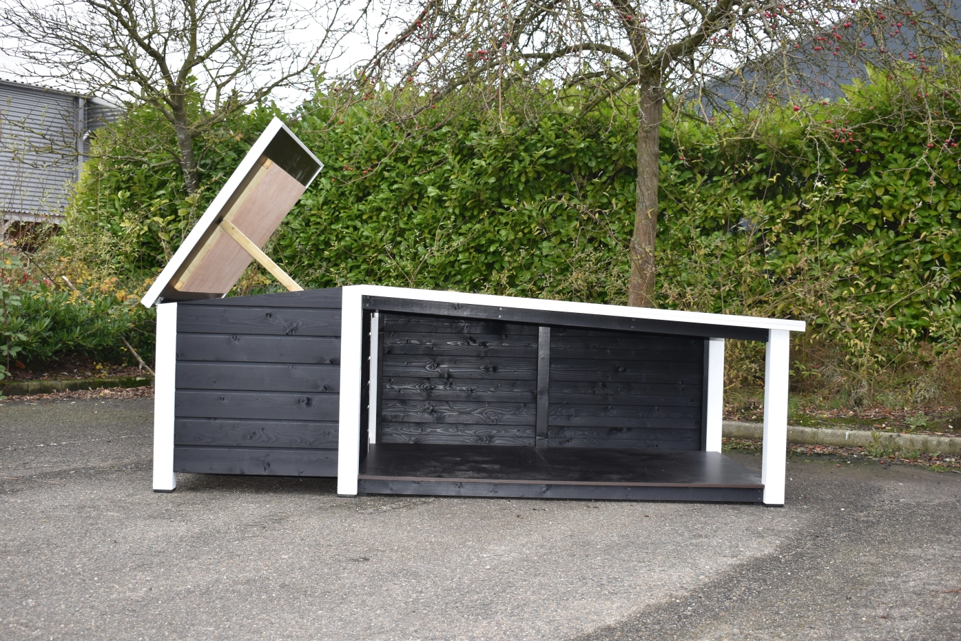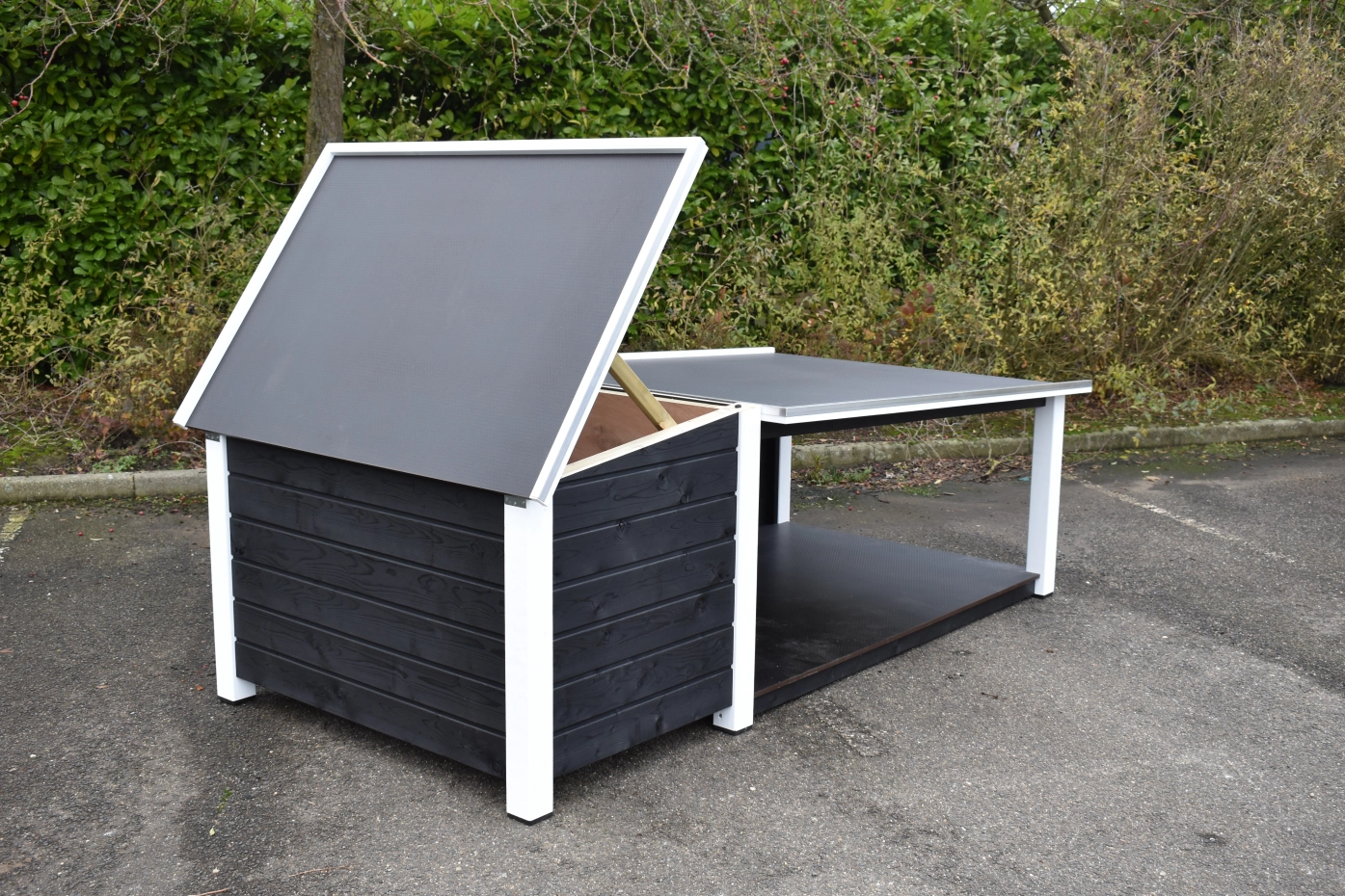 Het platte dak van het hondenhok kan open voor optimale toegankelijkheid. Ook is een fijn tochtschot aanwezig. Verder is de ingang afgewerkt met aluminium. Het betonplex dak is afgewerkt met aluminium randen en voorzien van een anti-slip laag, zodat uw hond er bovenop kan liggen. De vloer is eveneens van betonplex met anti-slip. Wanden, vloer en dak zijn geïsoleerd, zodat de warmte van uw hond langer in het hok blijft zitten. Dit hok is ook verkrijgbaar in Douglashout of geïmpregneerd vurenhout.