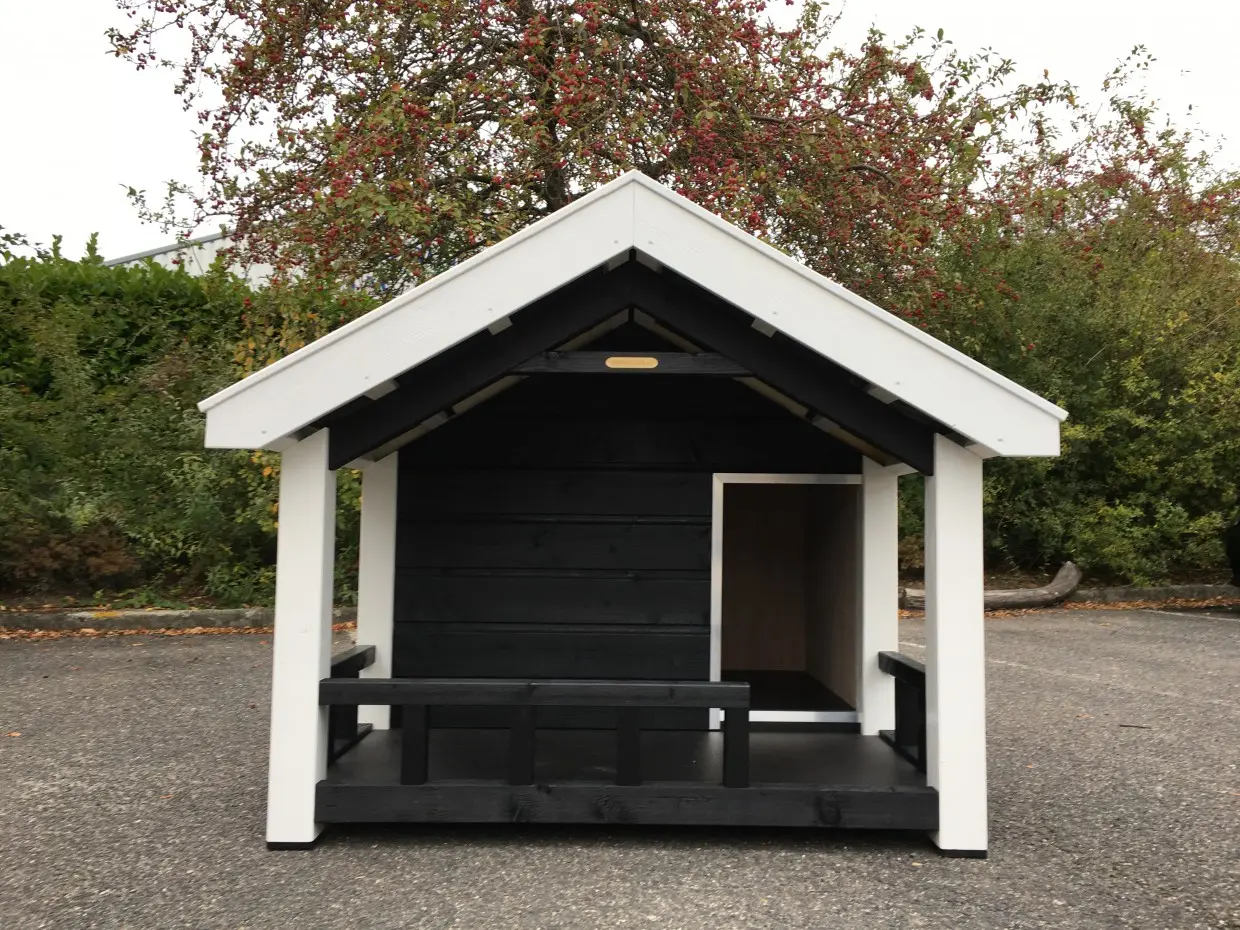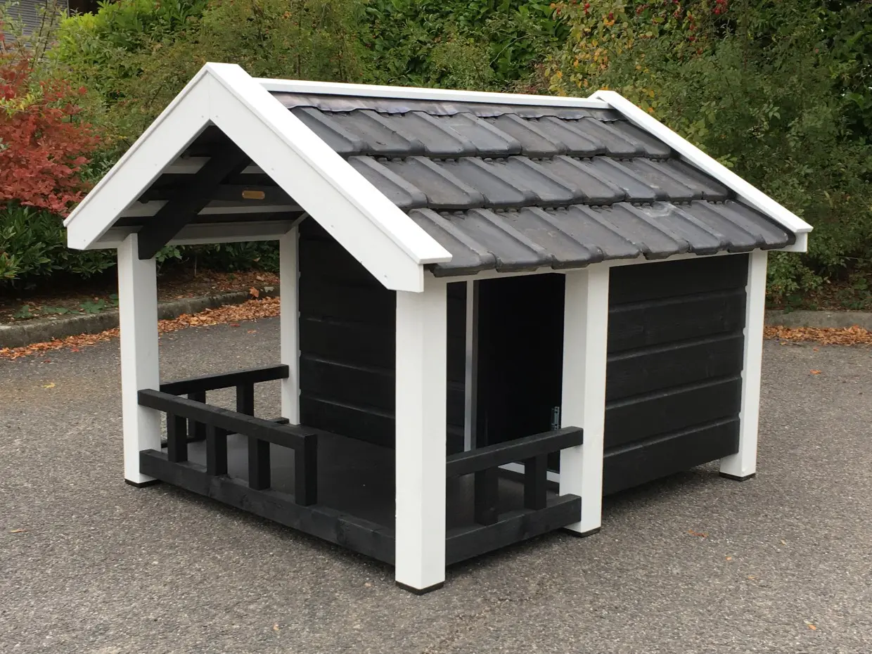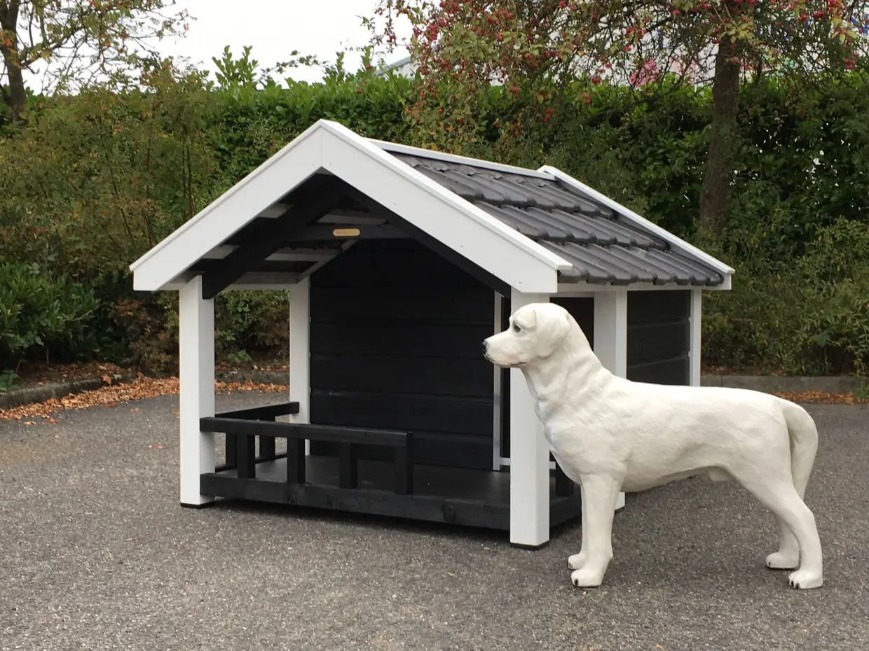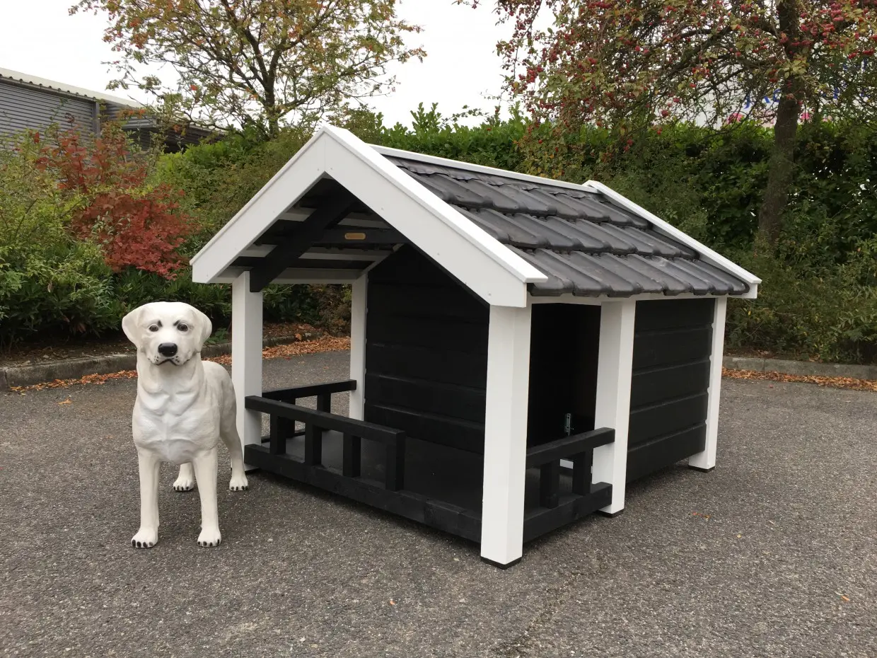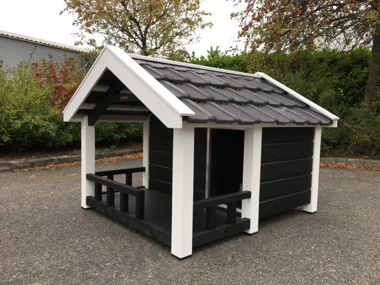 Deze Reno is een geïsoleerd hondenhok met veranda. Dit fraaie hondenhok met veranda in sobere zwart/witte kleurstelling, is een plaatje om te zien. Tegelijkertijd straalt het kracht en kwaliteit uit. Het is een oerdegelijk hok, gemaakt van geïmpregneerd vurenhout in combinatie met betonplex en echte dakpannen. Dit handige en comfortabele hondenhok is ontworpen in stijl van de Zeeuwse boerenschuur. De geïsoleerde wanden zijn maar liefst 7 cm dik. Top kwaliteit!