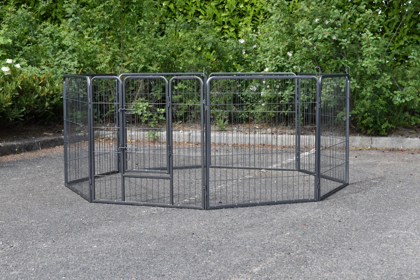 Puppyren van gepoedercoat staal met een hoogte van 80cm. Puppyren Octa bestaat uit 8 panelen van ca. 79x80cm. De totale omtrek van de puppyren is ongeveer 640cm.