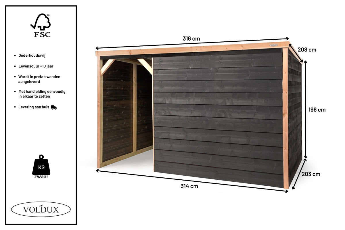 | Buitenwerkse afmetingen incl. dak (BxDxH) | 316x208x196cm |