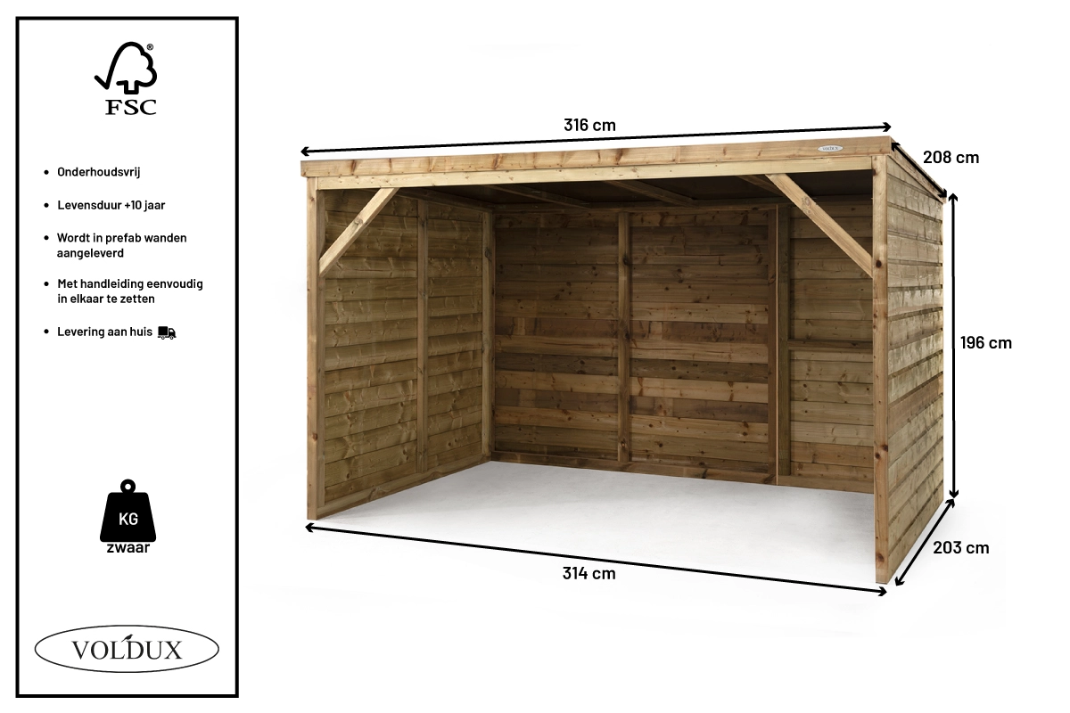| Buitenwerkse afmetingen incl. dak (BxDxH) | 316x208x196cm |