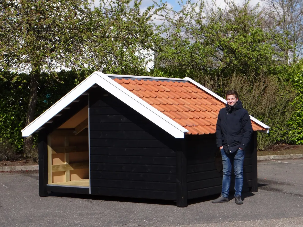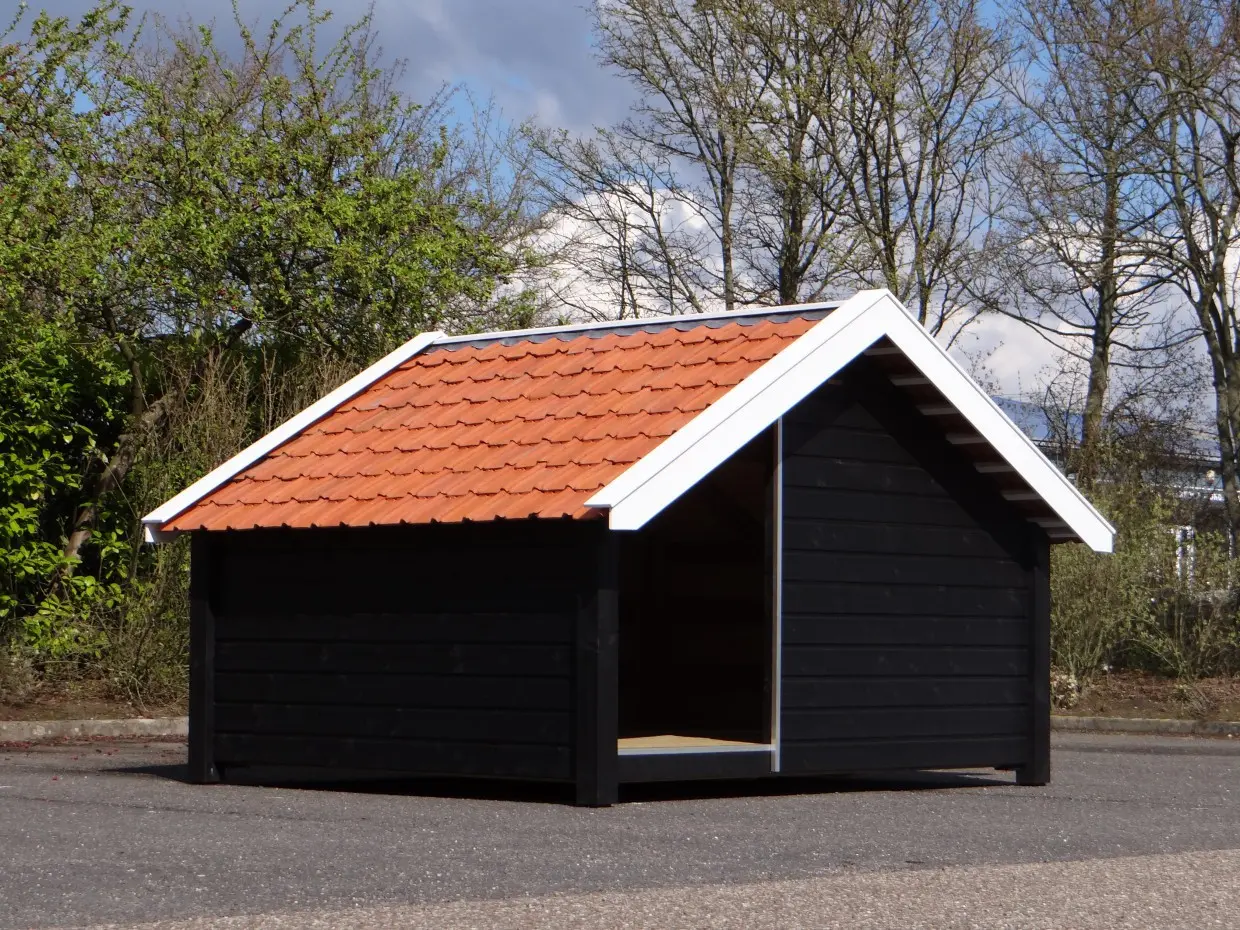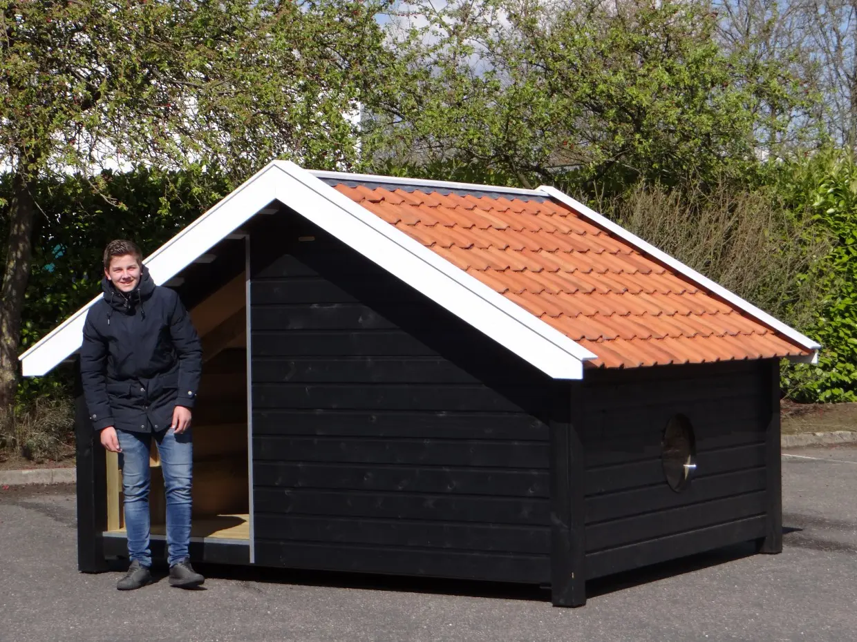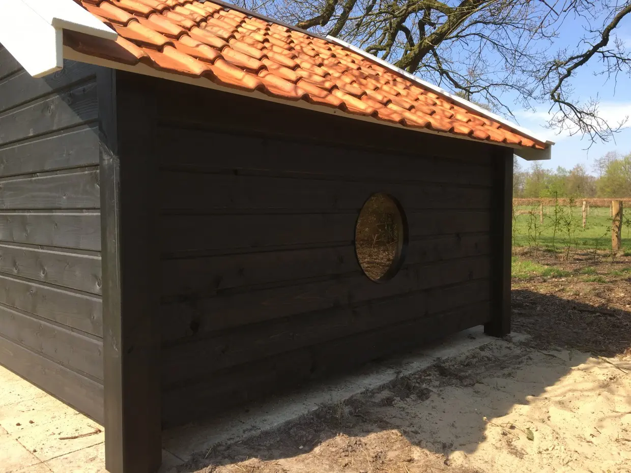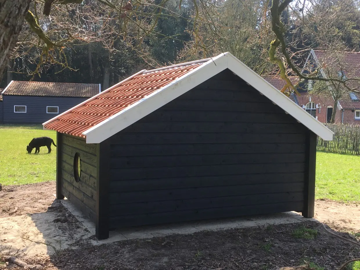 Varkenshok BIG zwart-wit is een geweldig degelijk varkenshok wat geschikt is voor 2-6 varkens. Het is zwaar uitgevoerd zodat ook 2 grote varkens van ca. 300 kg erin kunnen. De onderste 80cm van de wanden zijn verstevigd met balken van 12x4.5cm zodat varkens de wanden niet kapot kunnen beuken/drukken. Verder is het voorzien van een raampje om wat daglicht toe te laten, gezien dit belangrijk is voor varkens. Het dakpannen dak maakt het tot een stijlvol schuurtje waarin varkens hun beschutting kunnen vinden tegen regen, wind en andere weersomstandigheden.