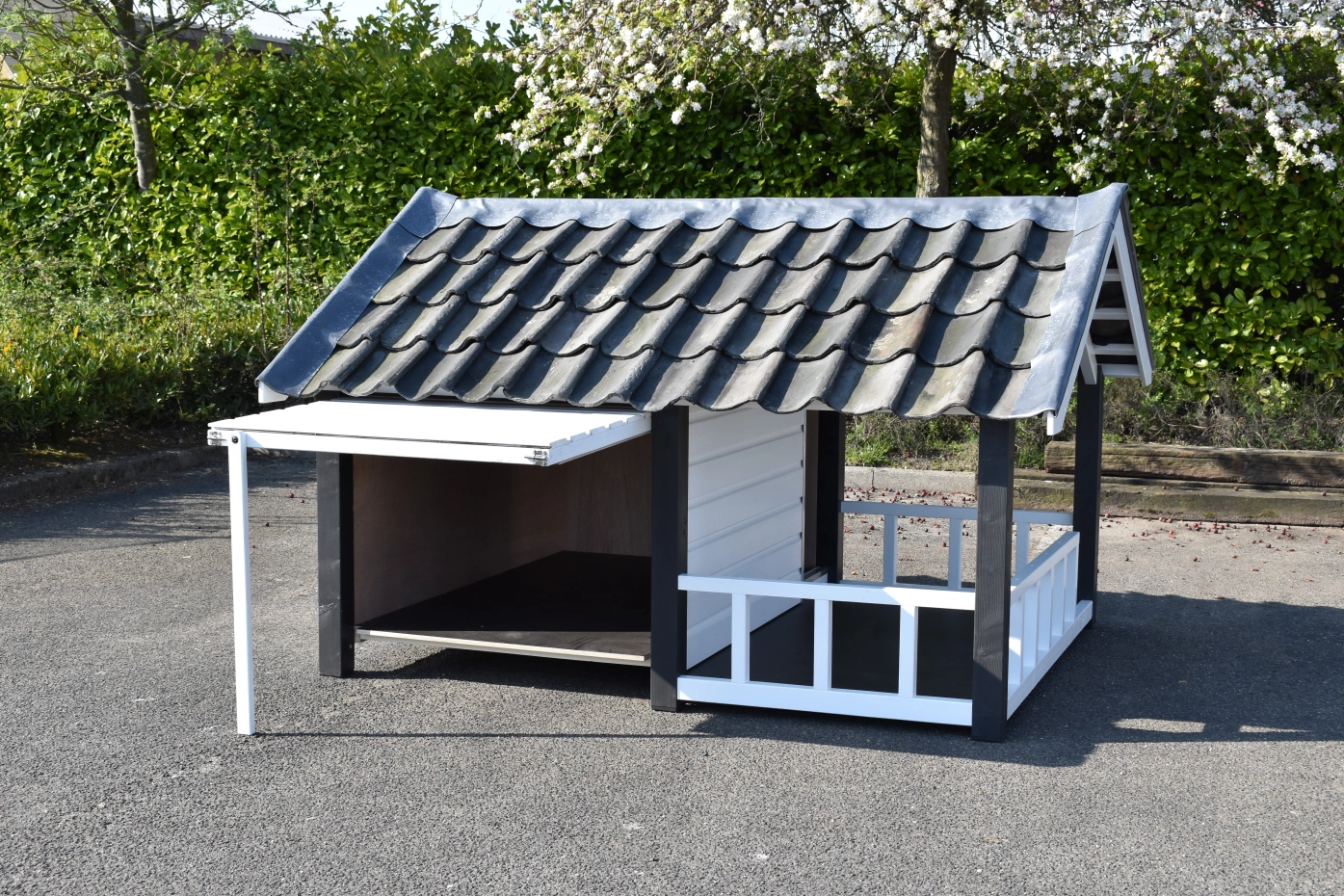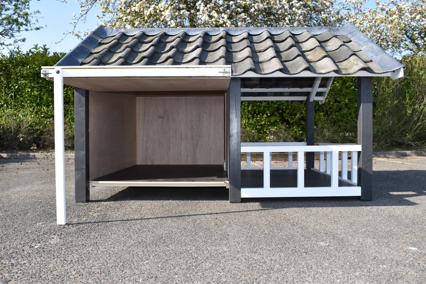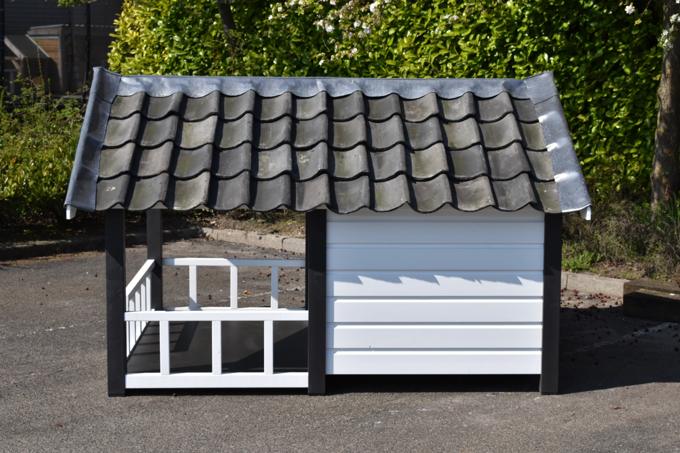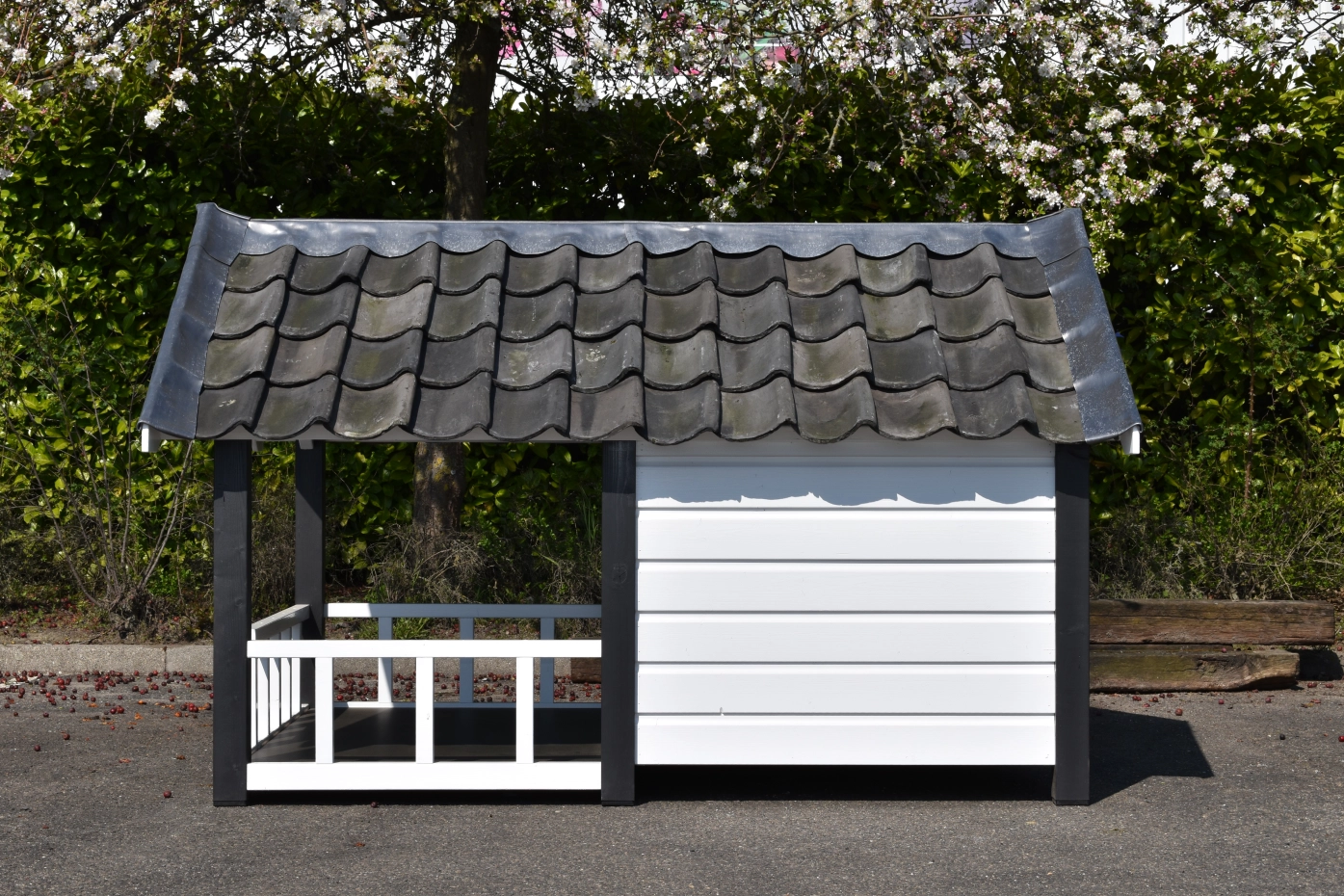 Luxe hondenhok met veranda in wit en antraciet met oude holle dakpannen. Dit speciale hondenhok is door ons gemaakt met een rijke oud Hollandse uitstraling. Het biedt ruimte aan extra grote honden zoals Leonberger, Sint-Bernhard, New Foundlander, Duitse dog, Boerboel etc. Het hok is geïsoleerd en voorzien van een handig luik aan de zijkant. De oud Hollandse dakpannen zijn langs de randen afgewerkt met lood.