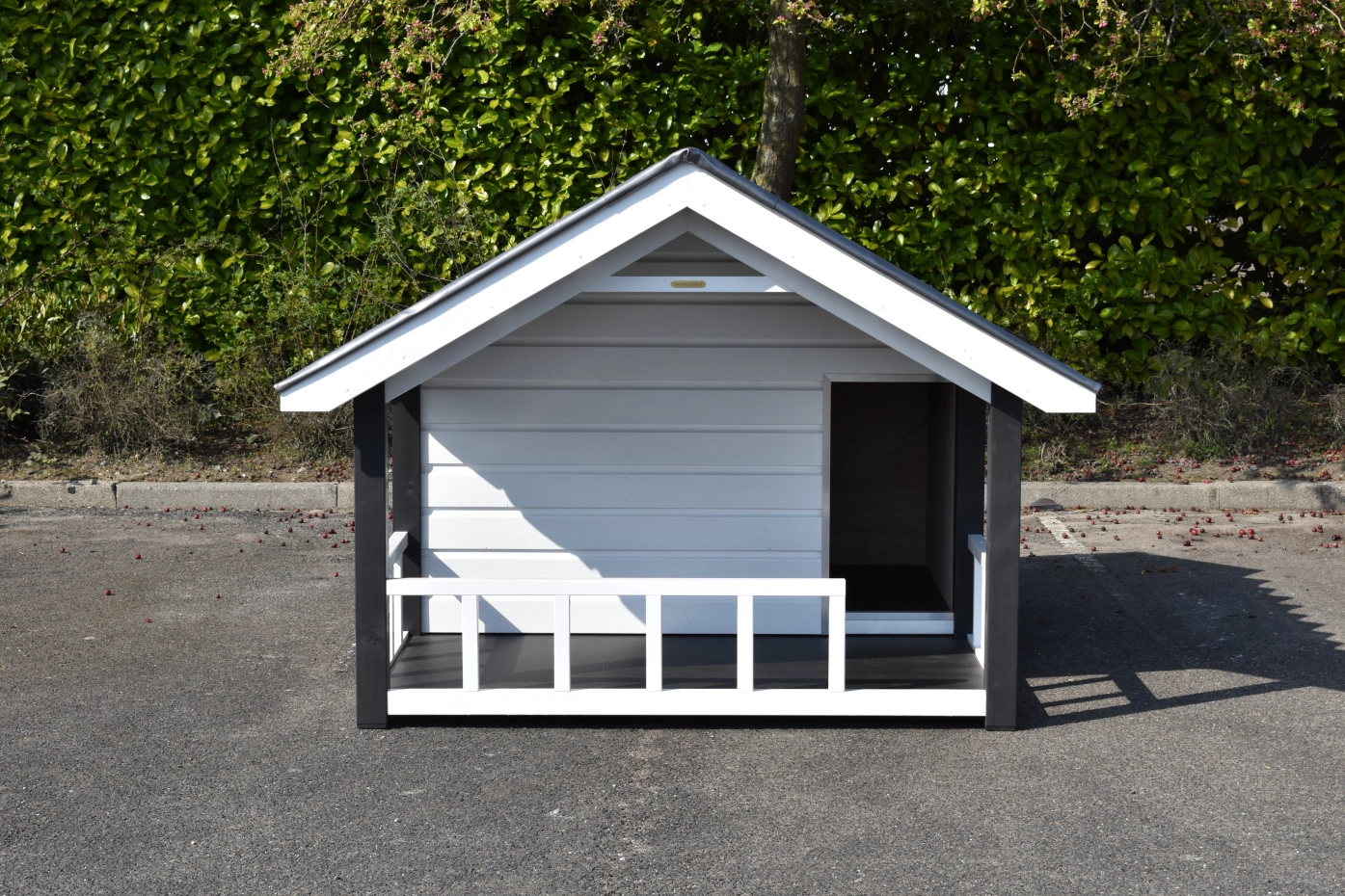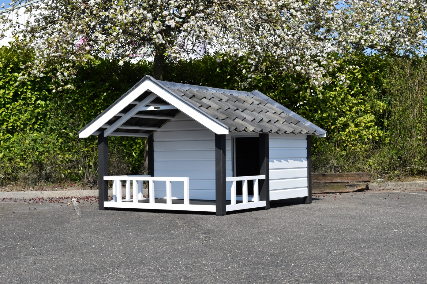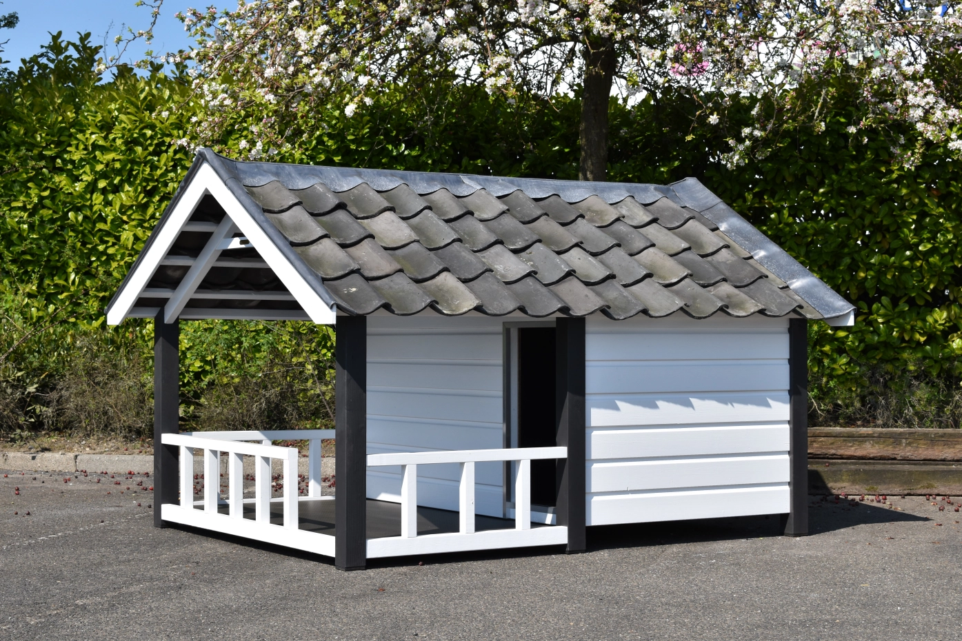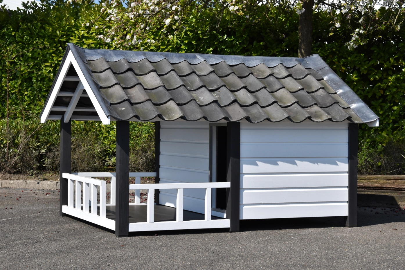 Luxe hondenhok met veranda in wit en antraciet met oude holle dakpannen. Dit speciale hondenhok is door ons gemaakt met een rijke oud Hollandse uitstraling. Het biedt ruimte aan extra grote honden zoals Leonberger, Sint-Bernhard, New Foundlander, Duitse dog, Boerboel etc. Het hok is geïsoleerd en voorzien van een handig luik aan de zijkant. De oud Hollandse dakpannen zijn langs de randen afgewerkt met lood.