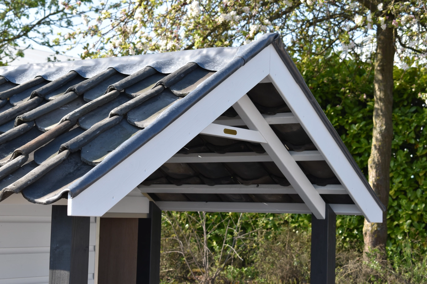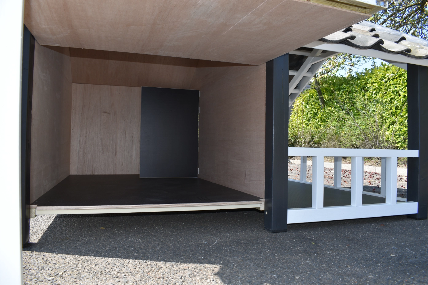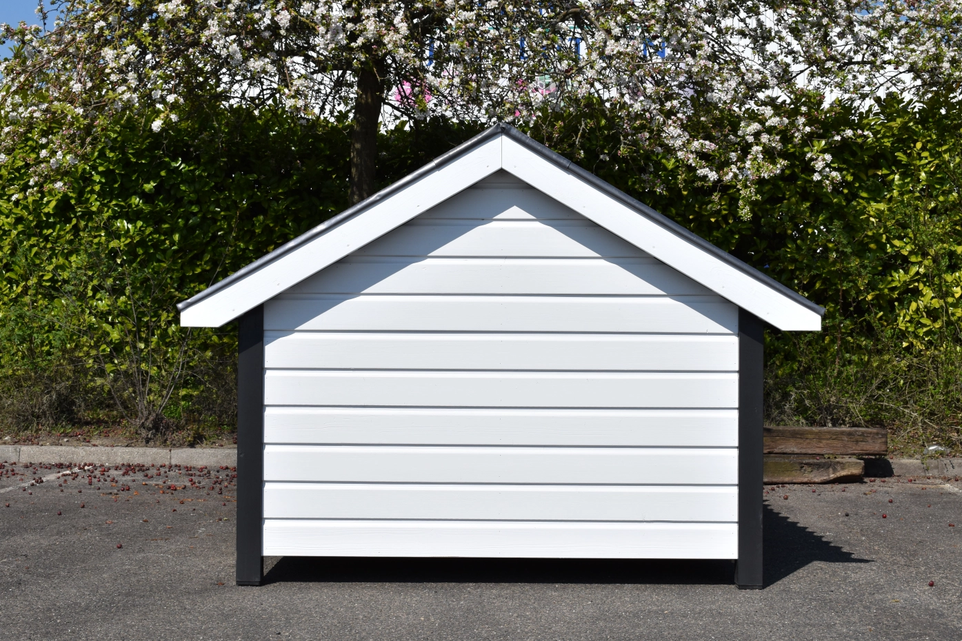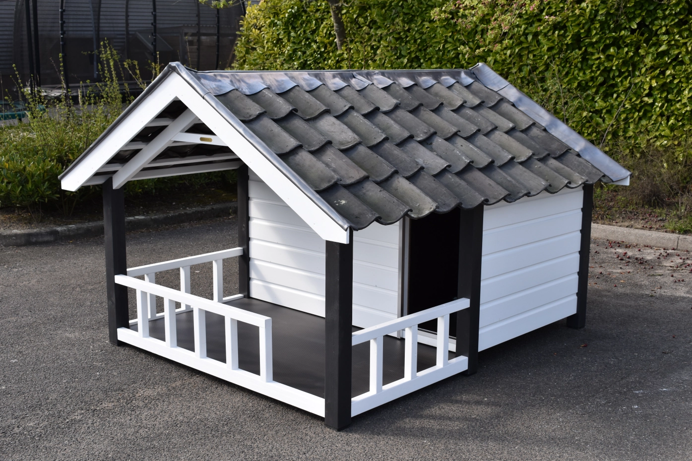 Luxe hondenhok met veranda in wit en antraciet met oude holle dakpannen. Dit speciale hondenhok is door ons gemaakt met een rijke oud Hollandse uitstraling. Het biedt ruimte aan extra grote honden zoals Leonberger, Sint-Bernhard, New Foundlander, Duitse dog, Boerboel etc. Het hok is geïsoleerd en voorzien van een handig luik aan de zijkant. De oud Hollandse dakpannen zijn langs de randen afgewerkt met lood.