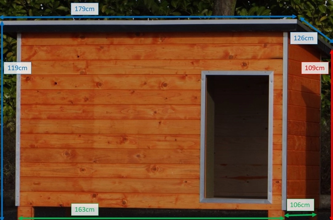 Hondenhok Base Extra Large is een stevig hondenhok met aluminium randen langs de opening en het dakpaneel. In dit dennenhouten hok zit een tochtschot als windscherm, wat ook weggelaten kan worden. Hondenhok Base Extra Large is geschikt voor grote honden. Hondenhok Base Extra Large heeft een ruime opening. De afmetingen van hondenhok Base Extra Large zijn : 179x126x119cm. Dit zijn de maximale buitenwerkse afmetingen incl. dakpaneel.