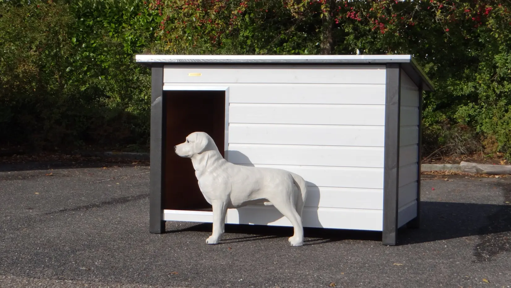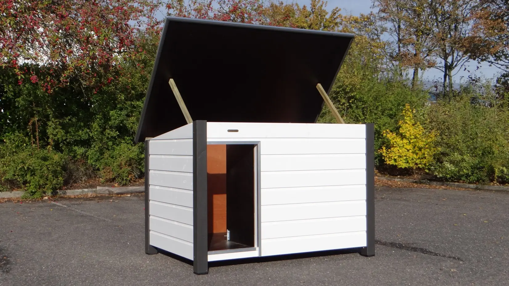 Groot hondenhok voor buiten nodig? Met hondenhok Loebas wit/grijs koopt u kwaliteit en gebruiksgemak. Het platte dak kan open en er zit een fijn tochtschot in het hok. De ingang en de dakrand zijn afgewerkt met aluminium. Het betonplex dak is voorzien van een anti-slip laag. Uw hond mag gewoon bovenop het hok liggen. Hondenhok Loebas heeft geïsoleerde wanden en vloer, zodat de warmte van uw hond beter in het hok blijft. Hondenhok voor Sint Bernard, Leonberger, Boerboel en dergelijke honden.