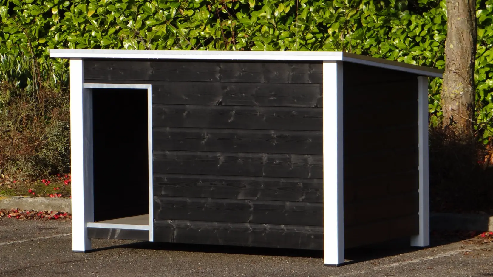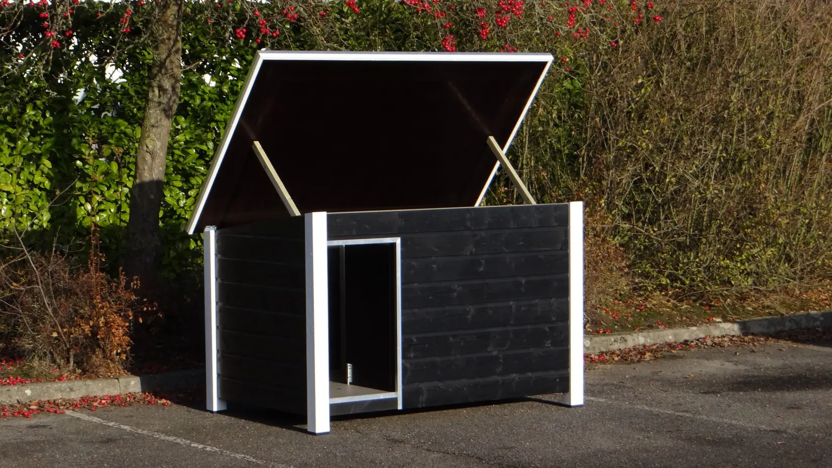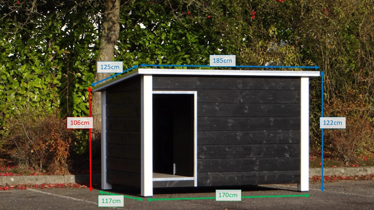 Groot en degelijk hondenhok nodig? Met deze Loebas zwart-wit koopt u kwaliteit, duurzaamheid en gebruiksgemak. Afmetingen 185x125x122 cm, waardoor geschikt voor grote honden zoals Duitse Dog, Leonberger, Deense Dog, Berner Sennen, Sint-Bernhard en dergelijke grote hondenrassen. Het platte dak kan open voor optimale toegankelijkheid. Ook is een fijn tochtschot aanwezig. Verder is de ingang afgewerkt met aluminium. Het betonplex dak is omzet met aluminium randen, en voorzien van een anti-slip laag. Zelfs de grote honden kunnen bovenop dit hok liggen. De vloer is ook van betonplex met anti-slip laag. Dit hok is ook geïsoleerd verkrijgbaar.