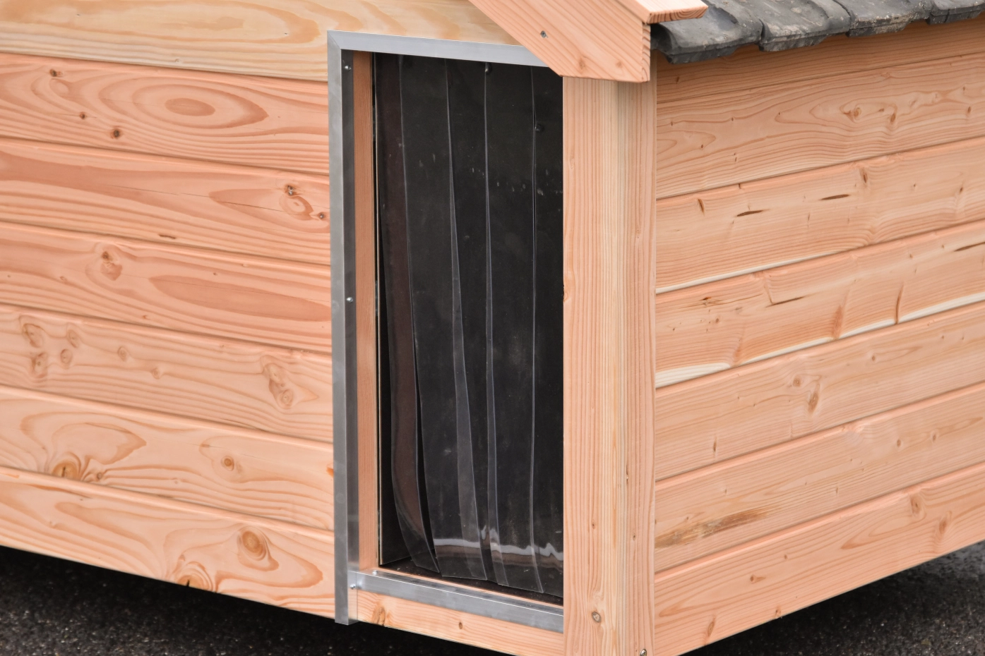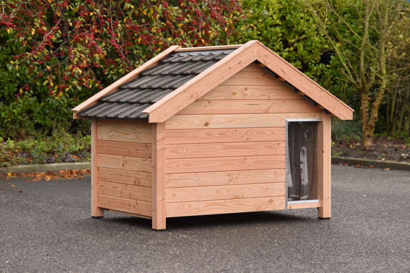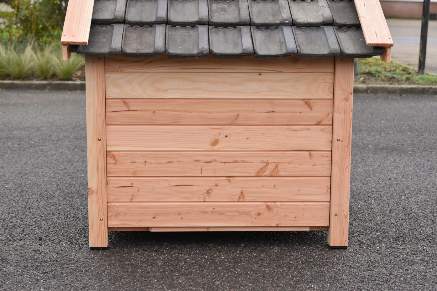 Hondenhok Turbo Douglas Geïsoleerd is een extra groot, geïsoleerd hondenhok in zwart met douglashout, met 7 cm dikke wanden voor optimale bescherming. Het hok wordt ambachtelijk handgemaakt en heeft een stijlvolle, robuuste uitstraling. Voor gebruiksgemak is het voorzien van een draaibaar tochtschot en een volledig openklapbare zijkant, waardoor schoonmaken snel en eenvoudig gaat. Op warme dagen zorgt de open zijkant voor extra ventilatie. Geschikt voor grote rassen zoals Berner Sennen, Duitse Dog en Boerboel.