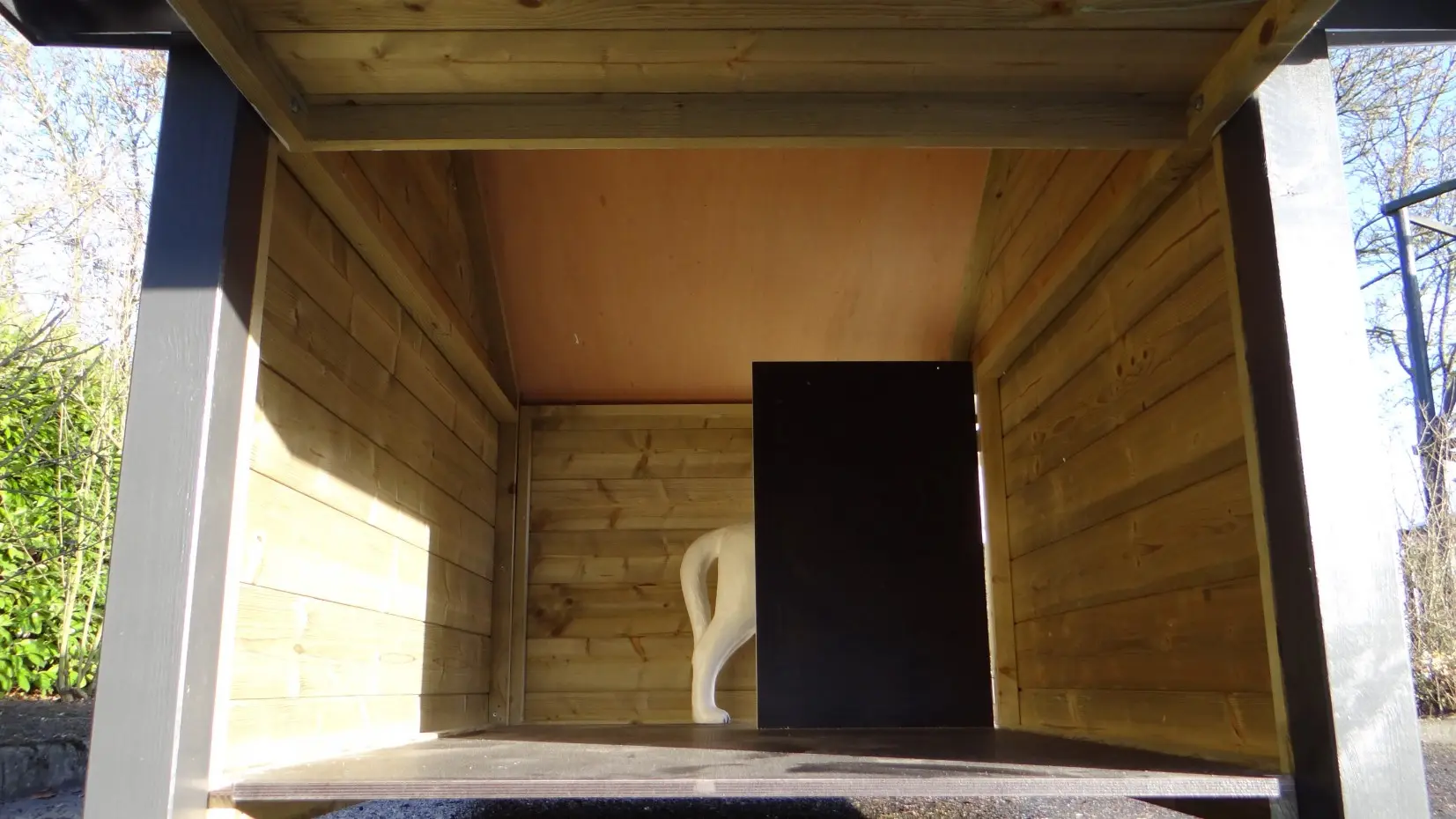 - Het hok is voorzien van een zijluik, waardoor het makkelijk schoon te maken is en het 's zomers ook opengezet kan worden als het erg warm is.