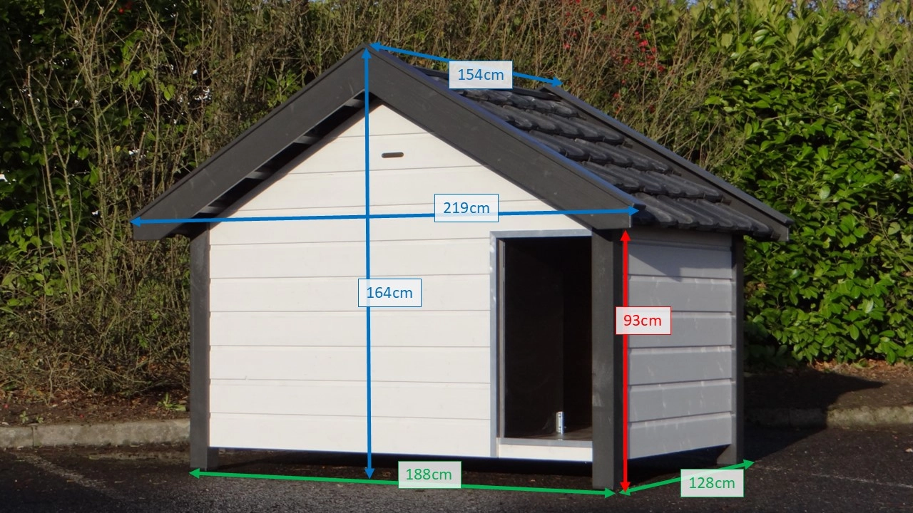 Groot houten hondenhok van geïmpregneerd hout en dakpannen. Dit hok biedt ruimte aan extra grote honden zoals Leonberger, Sint-Bernhard, New Foundlander, Duitse dog, Boerboel etc. Het hok is voorzien van een handig luik aan de zijkant.