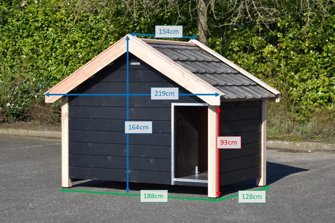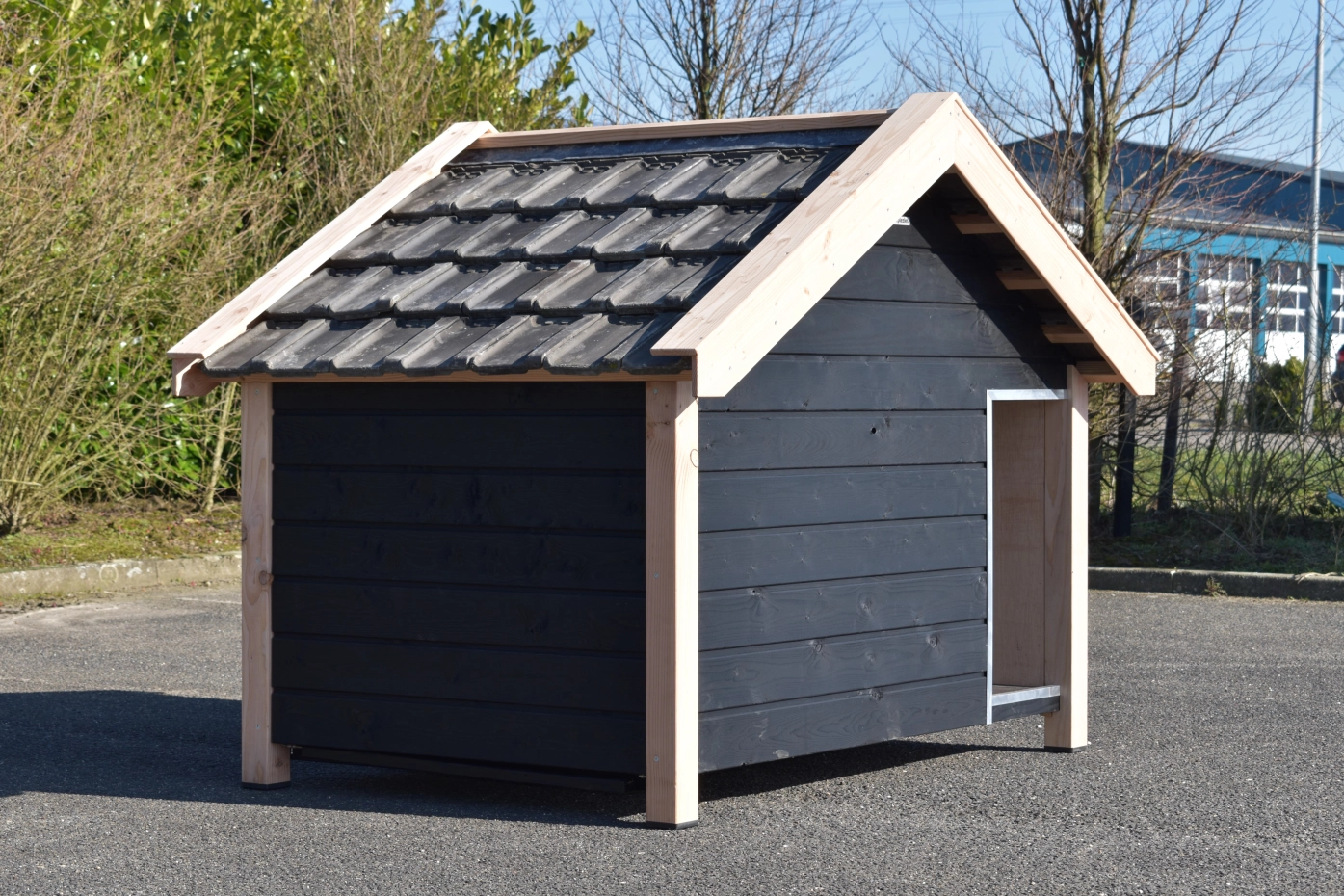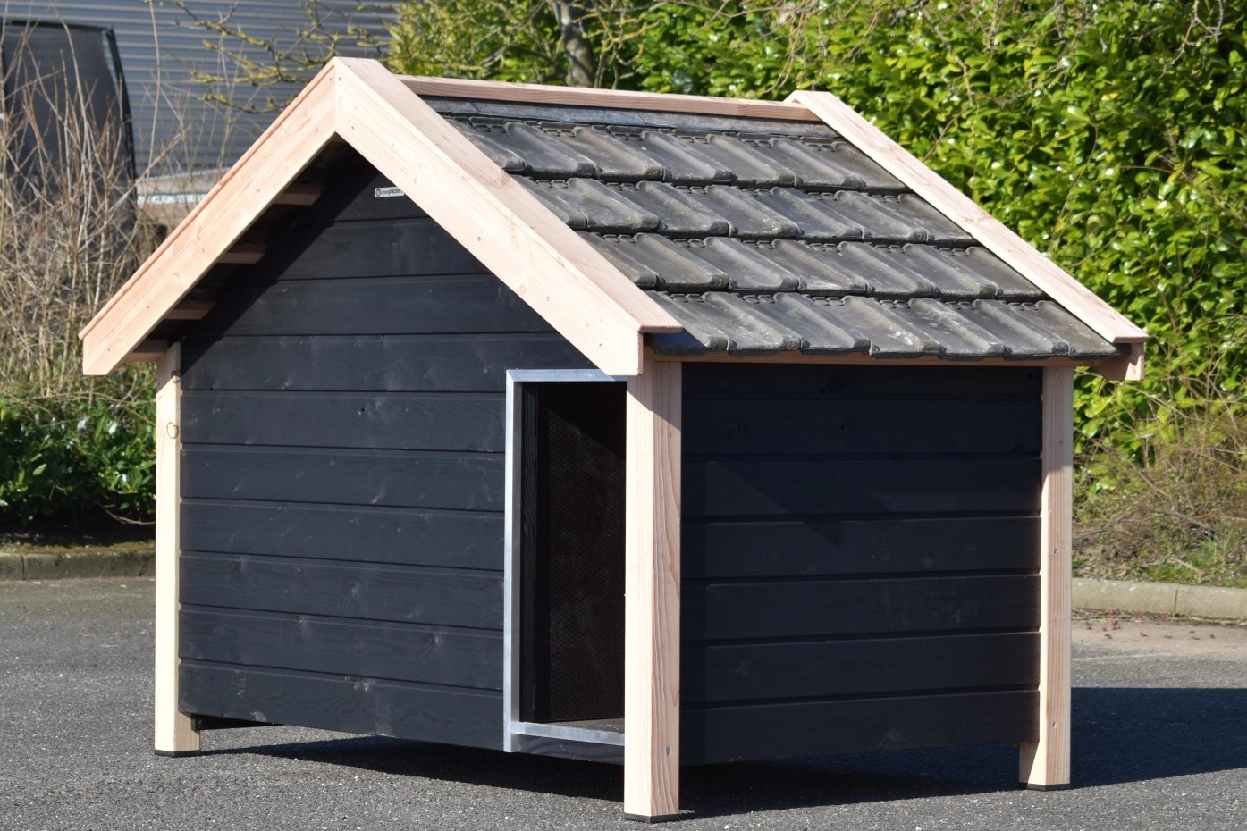 Hondenhok Turbo uitgevoerd in zwart met douglashout is een geïsoleerd, super groot hondenhok. Het hondenhok is van hoogwaardige kwaliteit en oersterk. De geïsoleerde wanden hebben een dikte van 7cm. Dit grote hondenhok wordt handgemaakt door onze eigen timmerlieden en heeft een unieke en stijlvolle uitstraling. Uiteraard is hierbij ook gedacht aan het gebruiksgemak.