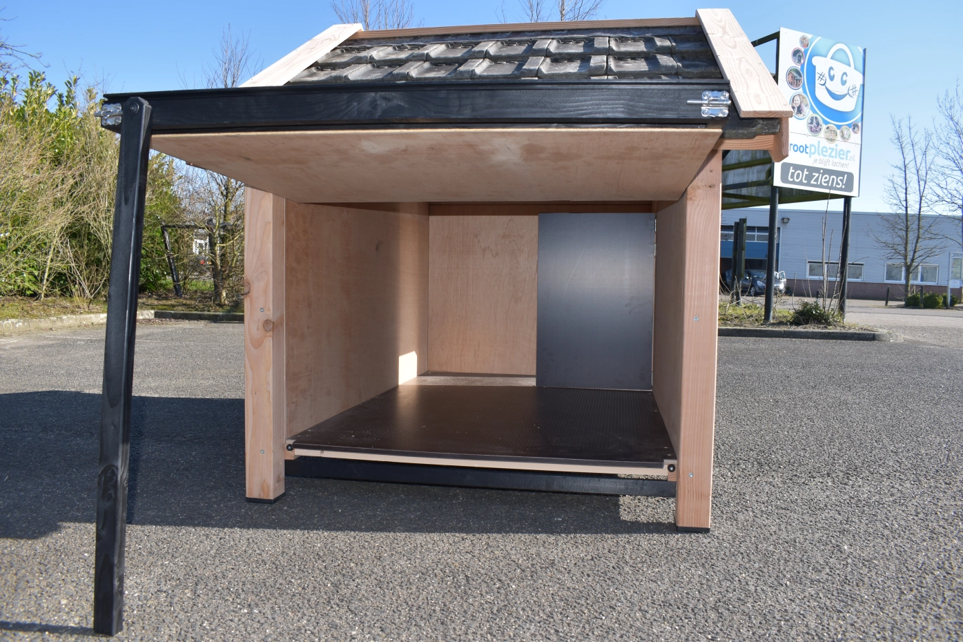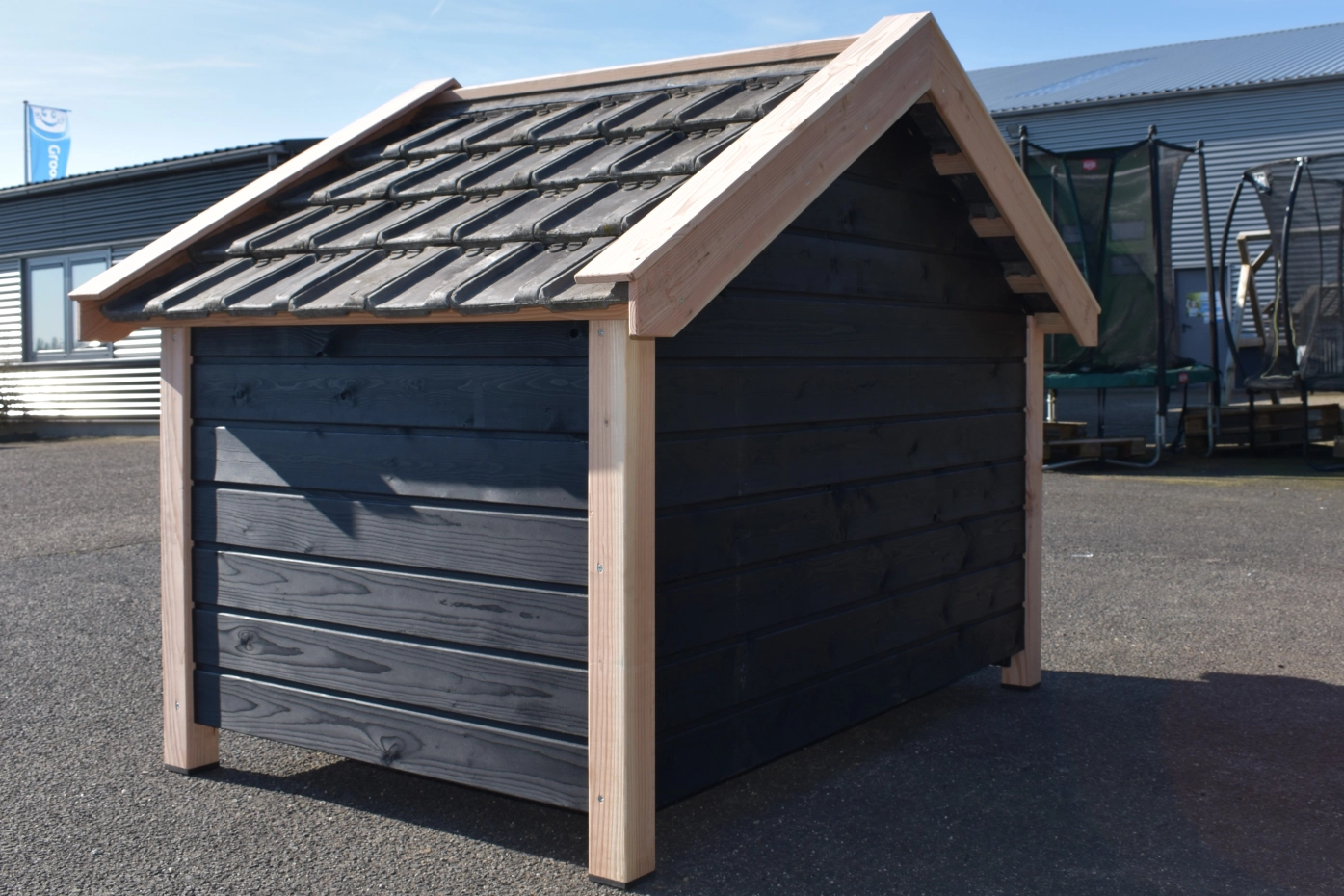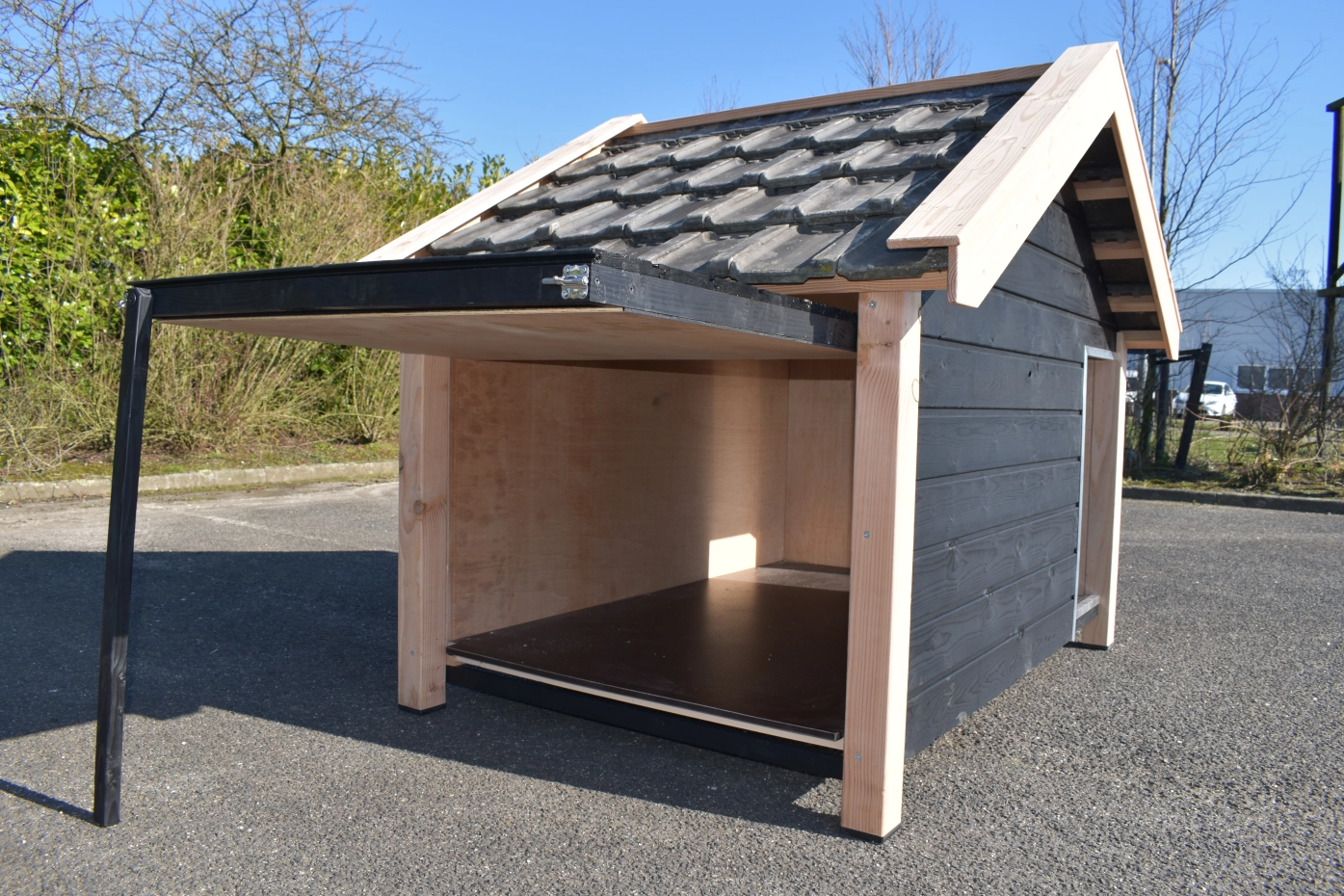Hondenhok Turbo uitgevoerd in zwart met douglashout is een geïsoleerd, super groot hondenhok. Het hondenhok is van hoogwaardige kwaliteit en oersterk. De geïsoleerde wanden hebben een dikte van 7cm. Dit grote hondenhok wordt handgemaakt door onze eigen timmerlieden en heeft een unieke en stijlvolle uitstraling. Uiteraard is hierbij ook gedacht aan het gebruiksgemak.