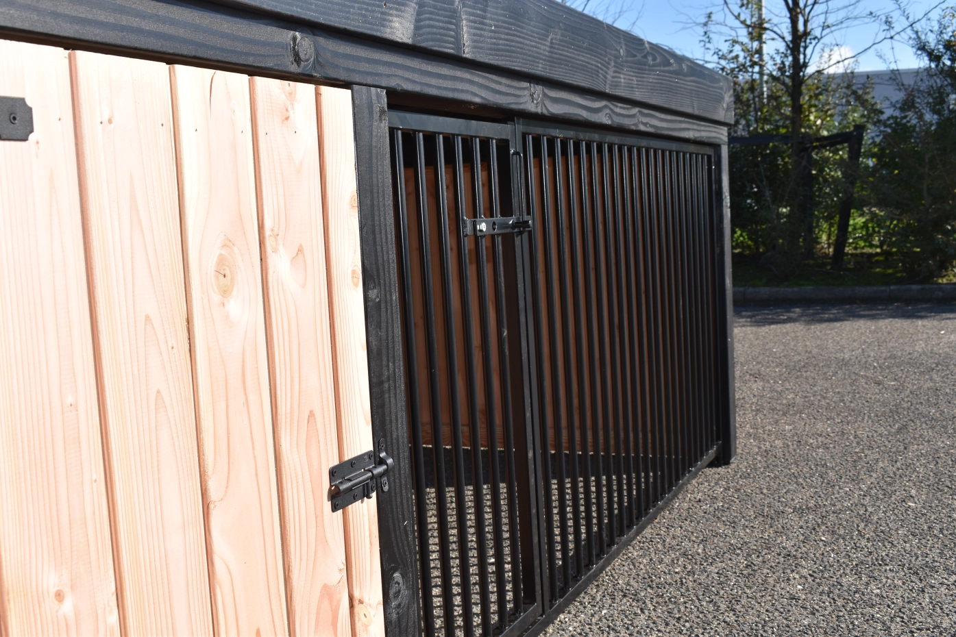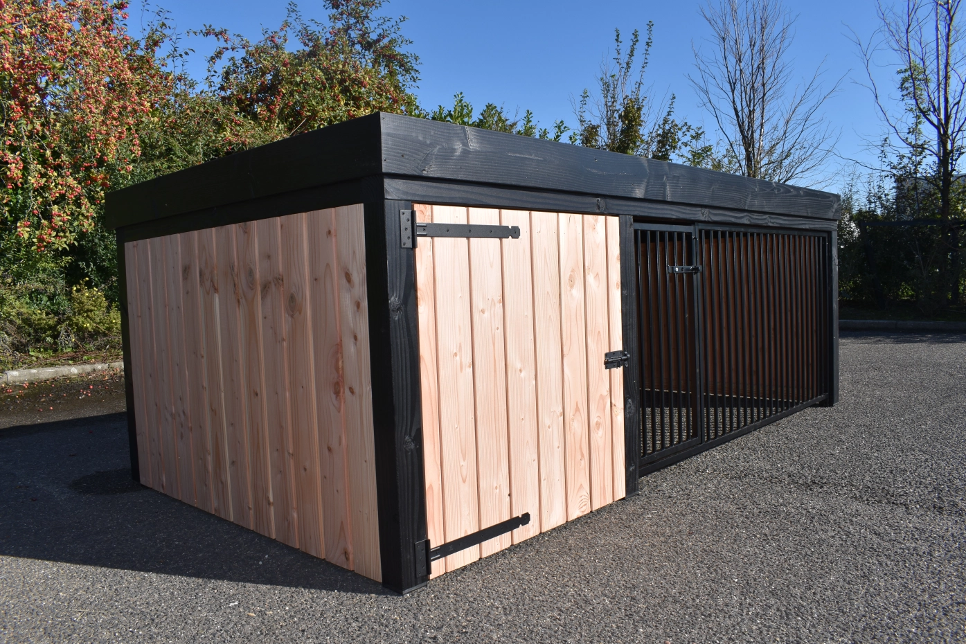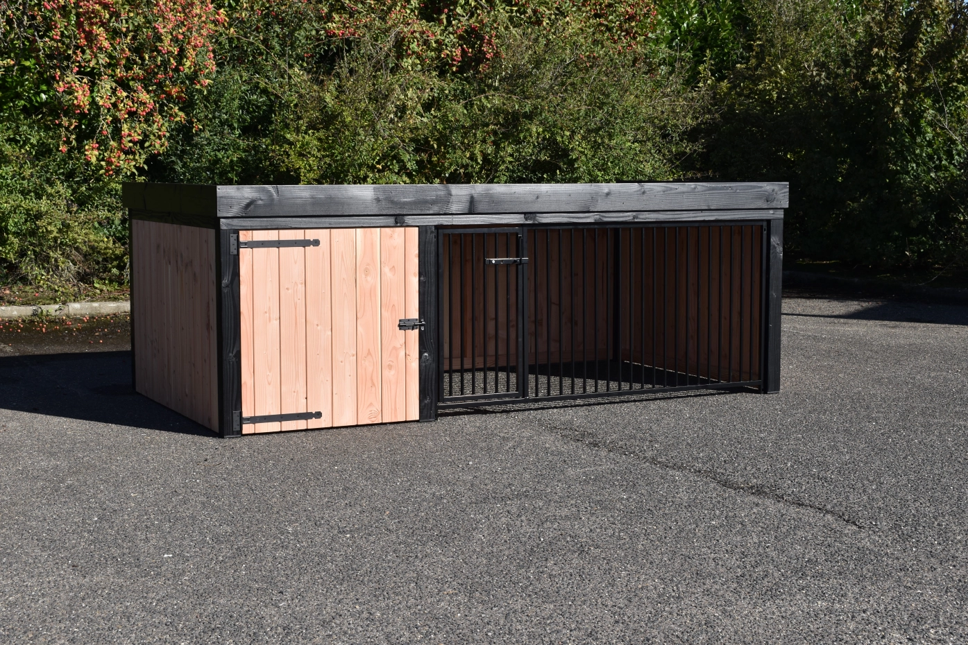 Hondenkennel Frenkie, gemaakt van douglashout, is een pracht design kennel. Voorzien van staande rabat delen en zwartgeverfde palen, geeft deze kennel een mooie moderne uitstraling. Het hok is voorzien van een ruim nachthok (90x150cm) met een betonplex bodem. Omdat deze kennel uitgevoerd is met een plat dak en een smalle rand heeft u een laag model van 115 cm hoog.
