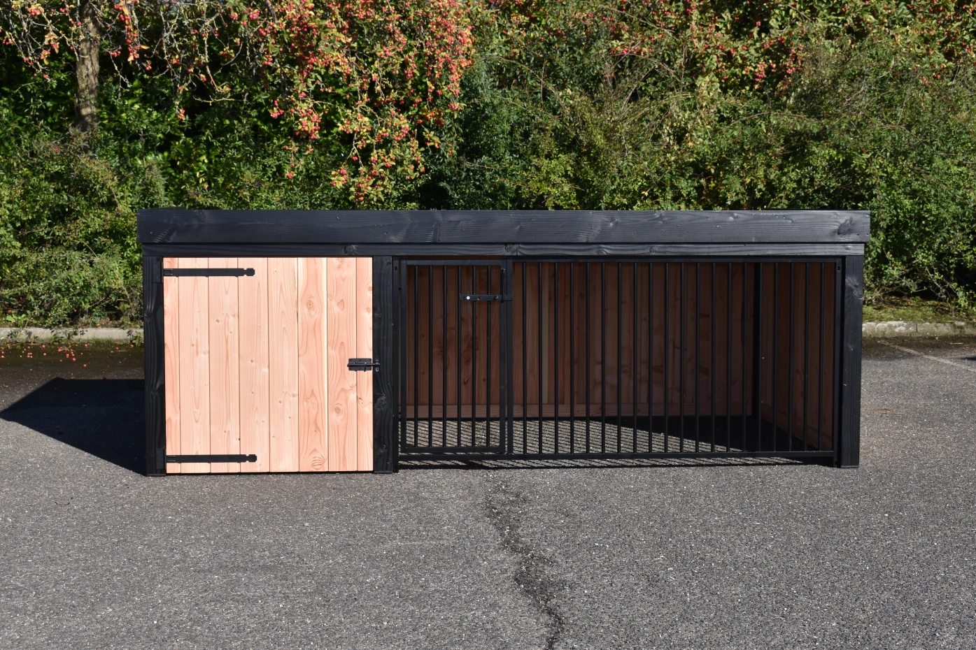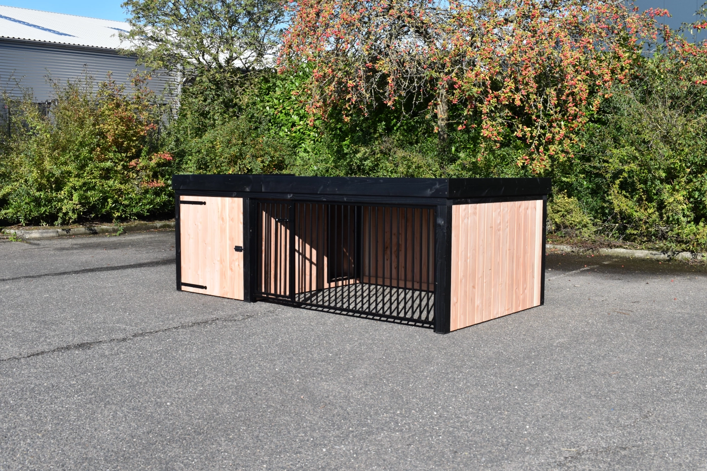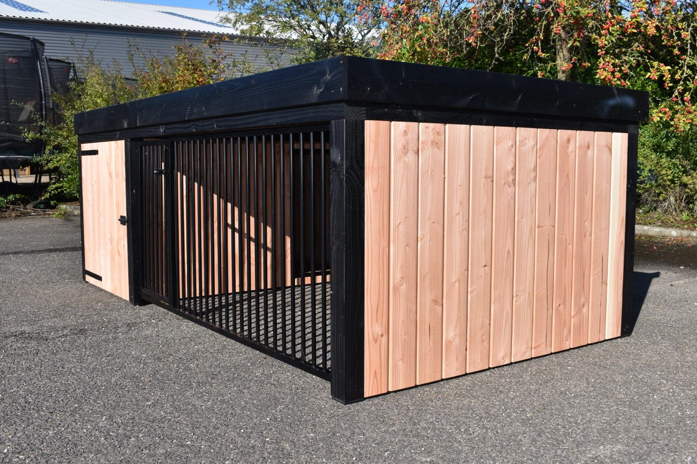 Hondenkennel Frenkie, gemaakt van douglashout, is een pracht design kennel. Voorzien van staande rabat delen en zwartgeverfde palen, geeft deze kennel een mooie moderne uitstraling. Het hok is voorzien van een ruim nachthok (90x150cm) met een betonplex bodem. Omdat deze kennel uitgevoerd is met een plat dak en een smalle rand heeft u een laag model van 115 cm hoog.