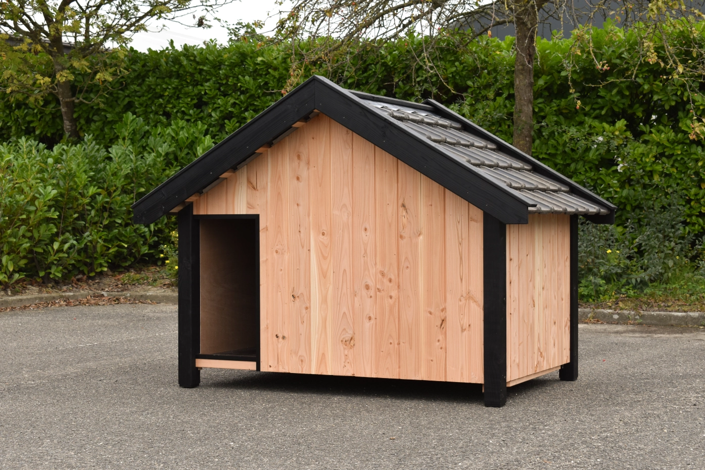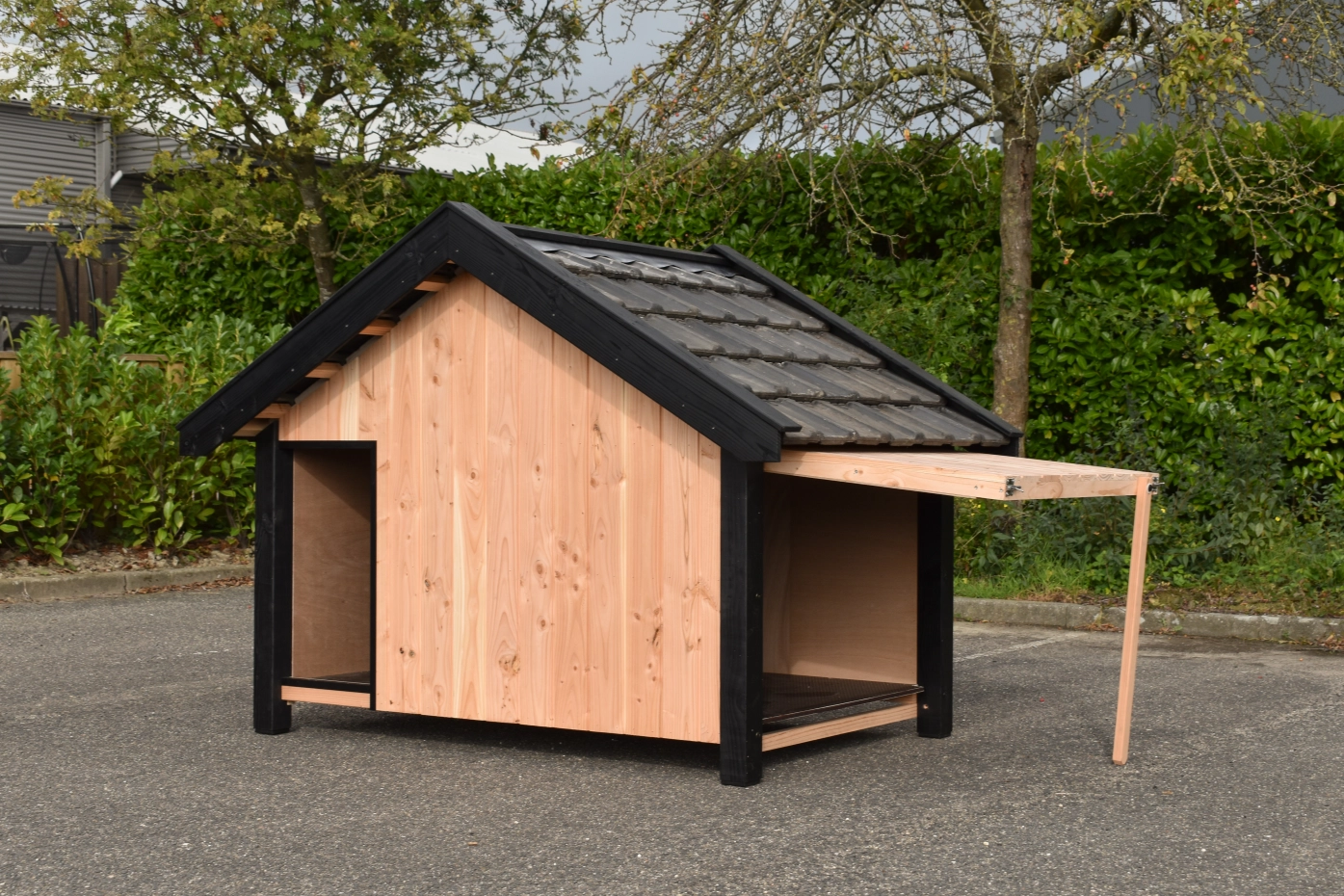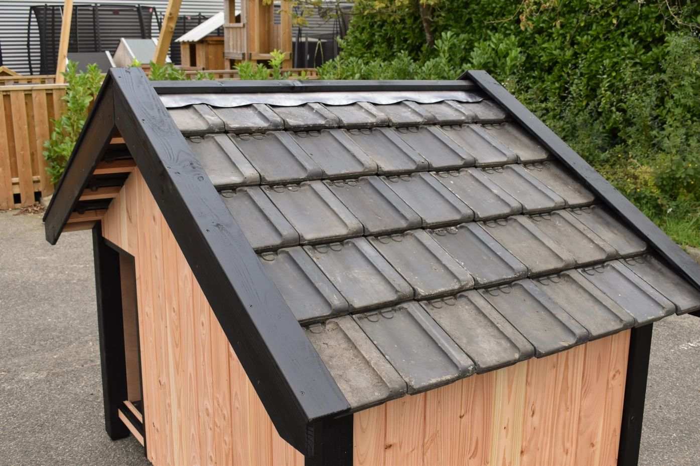 - Met keramische dakpannen: om het hondenhok extra charme te geven worden 2e hands restauratie dakpannen gebruikt