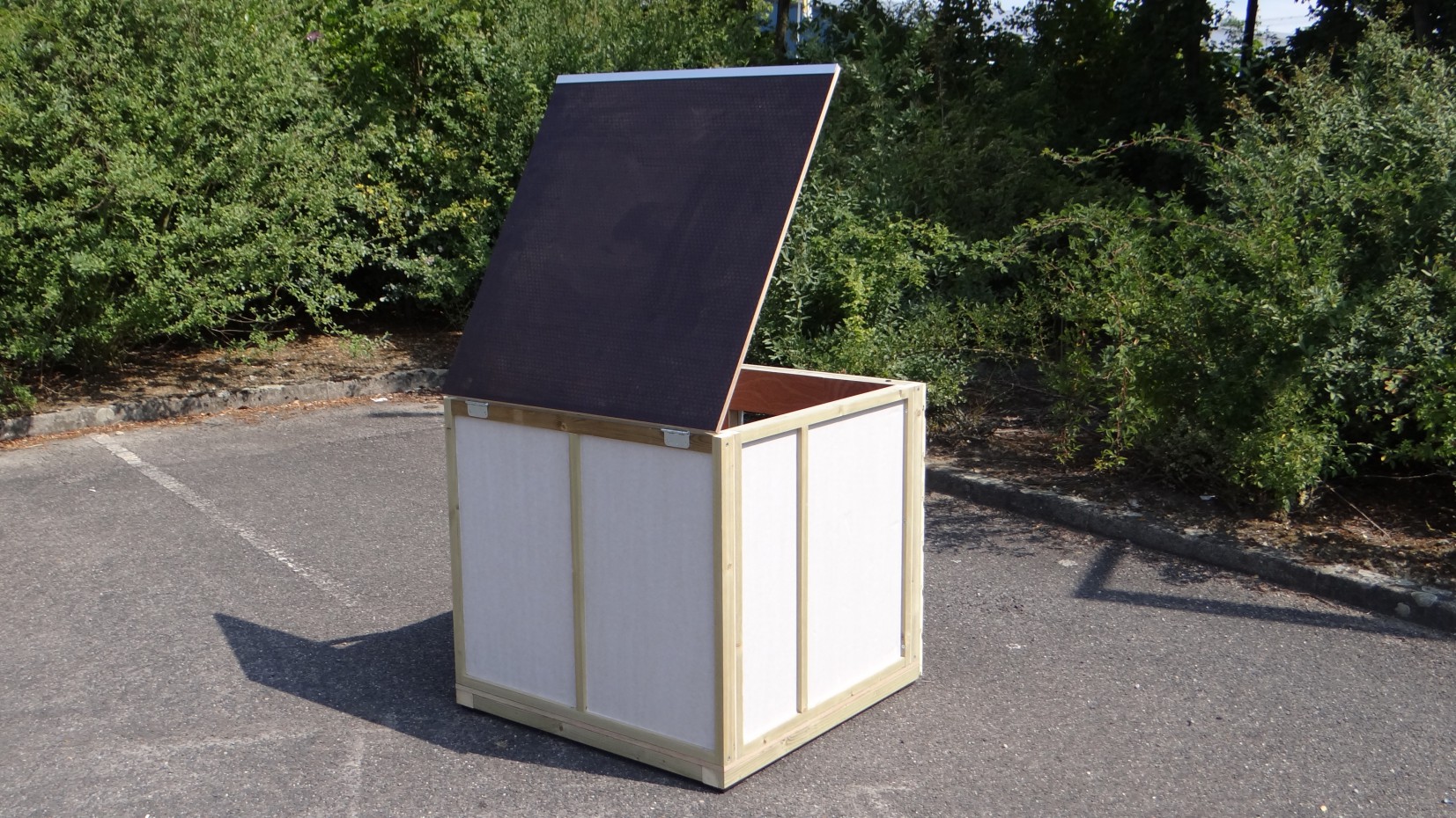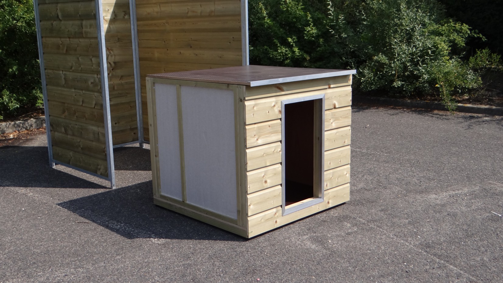 Nachthok Easy geïsoleerd 95x95 is een op maat gemaakt hok om in een kennel te plaatsen. Voorzien van betonplex vloer en dak. Rondom 3 cm geïsoleerd met PIR isolatie. De ingang is voorzien van aluminium beschermhoeken. Zeer solide en praktisch. Voorzien van handig scharnier-dak. Afmeting opening is 65x35cm.