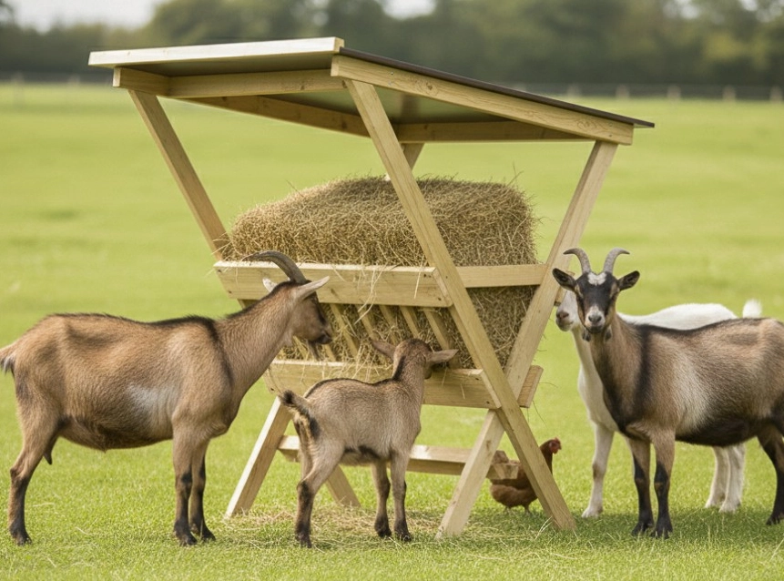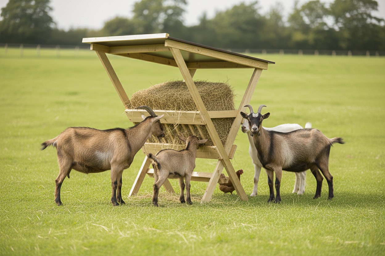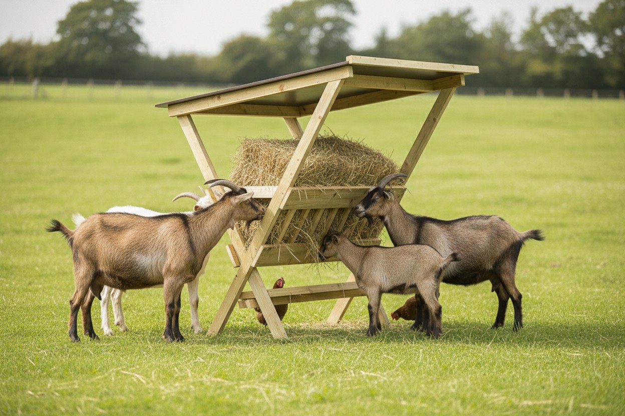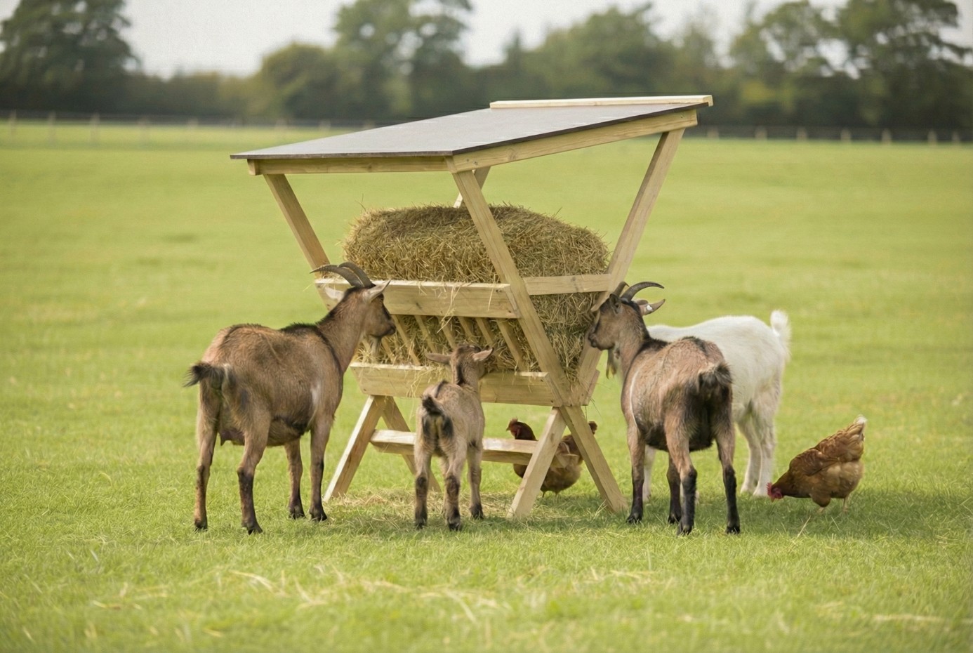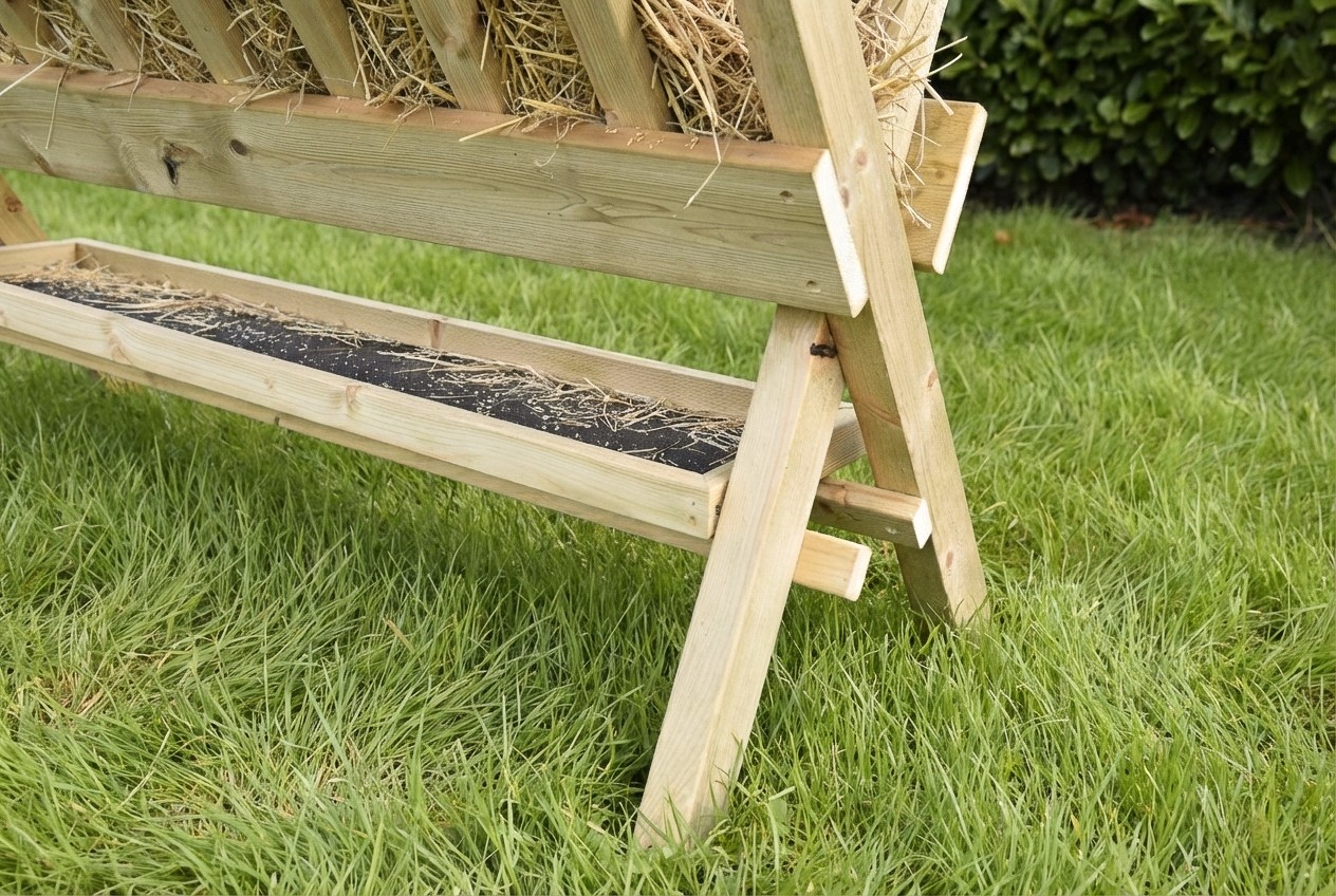 Deze vrijstaande hooiruif is een praktische oplossing voor het voeren van geiten, schapen en andere weidedieren. Het stevige ontwerp en het dak zorgen ervoor dat het hooi beschermd blijft tegen regen en vuil, waardoor het voer langer vers blijft. onder de hooiruif zit een opvang bak zodat de kleinere dieren ook genoeg kunnen eten. zo gaat er bijna geen hooi verloren.