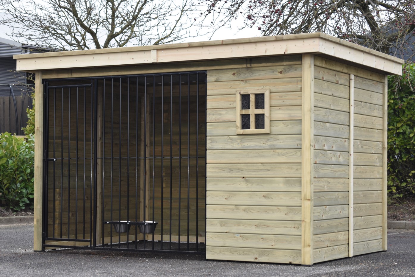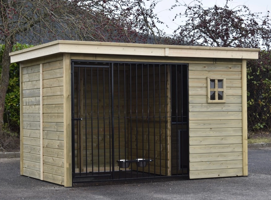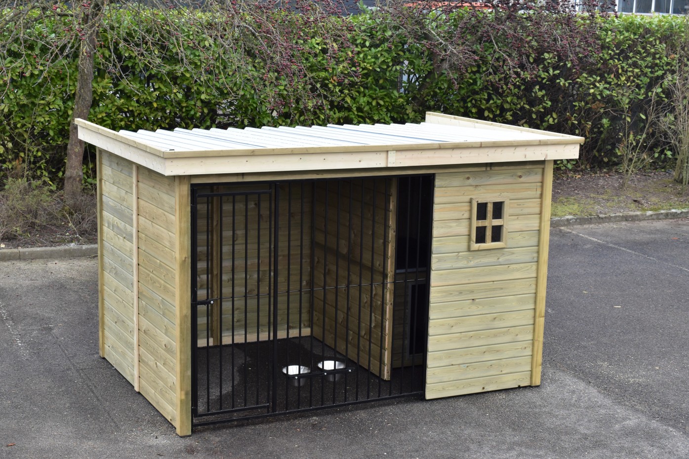 Mooie kennel van geïmpregneerd vurenhout met een luxe, geïsoleerd Easy nachthok. Het dak is uitgevoerd in stalen platen met aan de binnenzijde een viltlaag. Deze laag voorkomt condensvorming en dempt het geluid van regen. Het geïmpregneerde vurenhout is duurzaam en heeft een lange levensduur. Dankzij de modulaire wanden beschikt u over een stevige kennel met strak en netjes afgewerkte panelen. Het dak is afgewerkt met een luxe daksysteem, waardoor de platen nauwelijks zichtbaar zijn. Deze kennel biedt ruimte aan één grote hond of twee middelgrote honden.