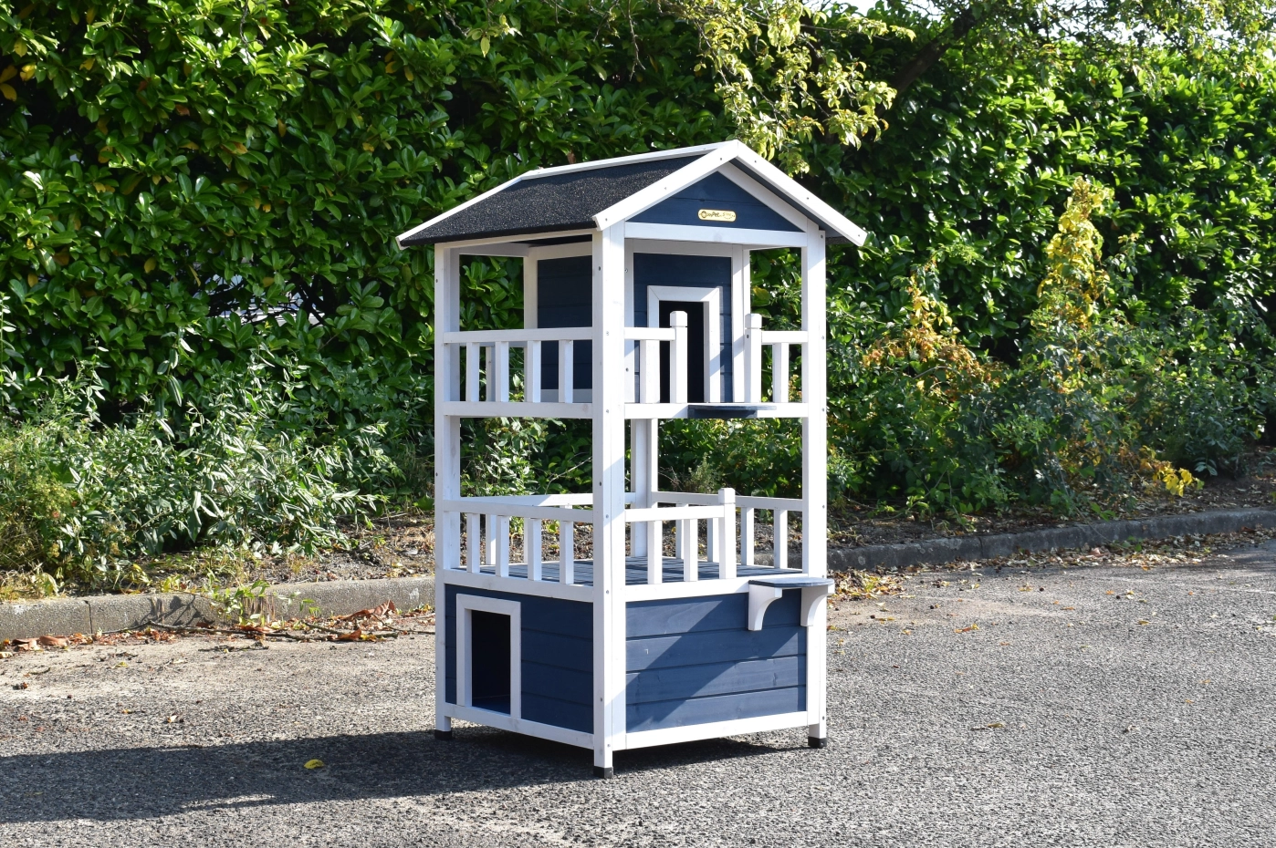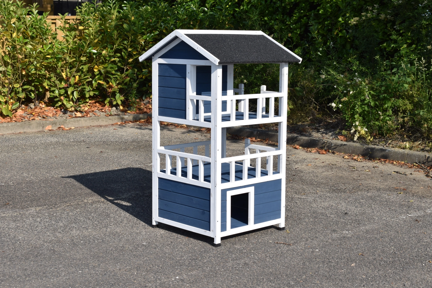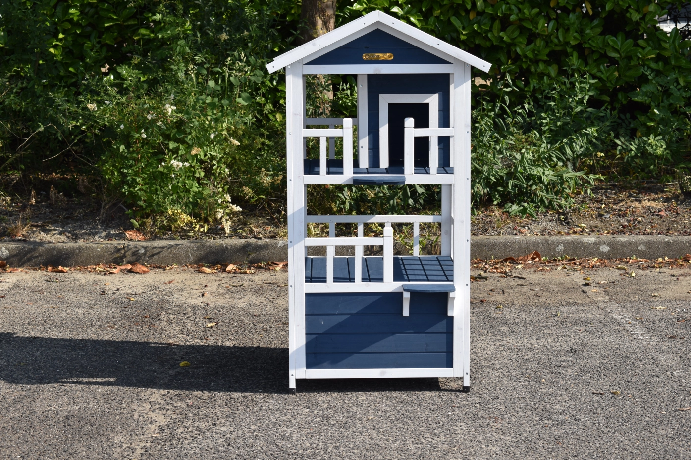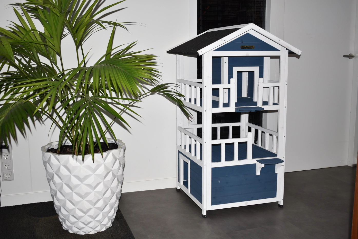 Kattenhuis Kitty is een leuk kattenhuis met 3 verdiepingen, waardoor het extra uitdaging biedt voor uw kat. Erg leuk om binnen of buiten te plaatsen! Het hok heeft leuke kleuren, namelijk blauw en wit. De verdiepingen zijn voorzien van een witte balustrade, wat het huisje een luxueus aanzien geeft!