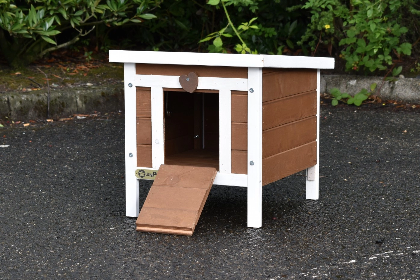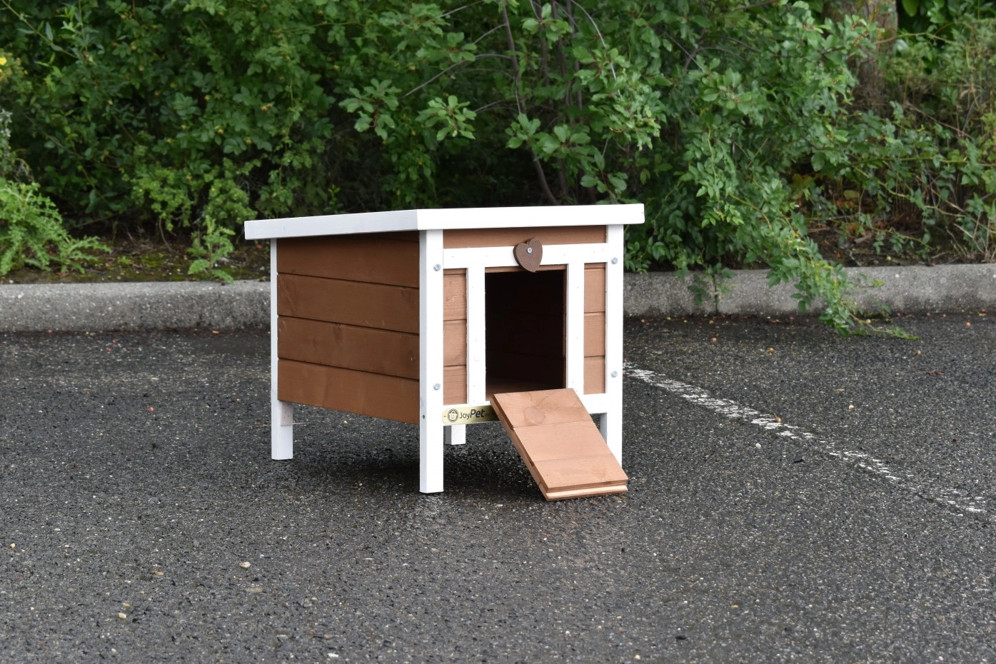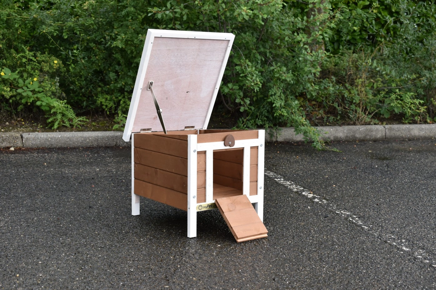 Kattenhuis Petit is een klein, maar handig kattenhuisje. Het bezit een scharnierdak en omdat het huisje zo klein is, is het schoonmaken zo gebeurd. Het kattenhuis Petit is klein en compact. Dit betekent ook dat deze eenvoudig te verplaatsen is. Het kattenhuis kan bijvoorbeeld in een kattenren worden geplaatst, als schuilhok. De maximale afmetingen, inclusief dak, zijn 42x51x43cm.